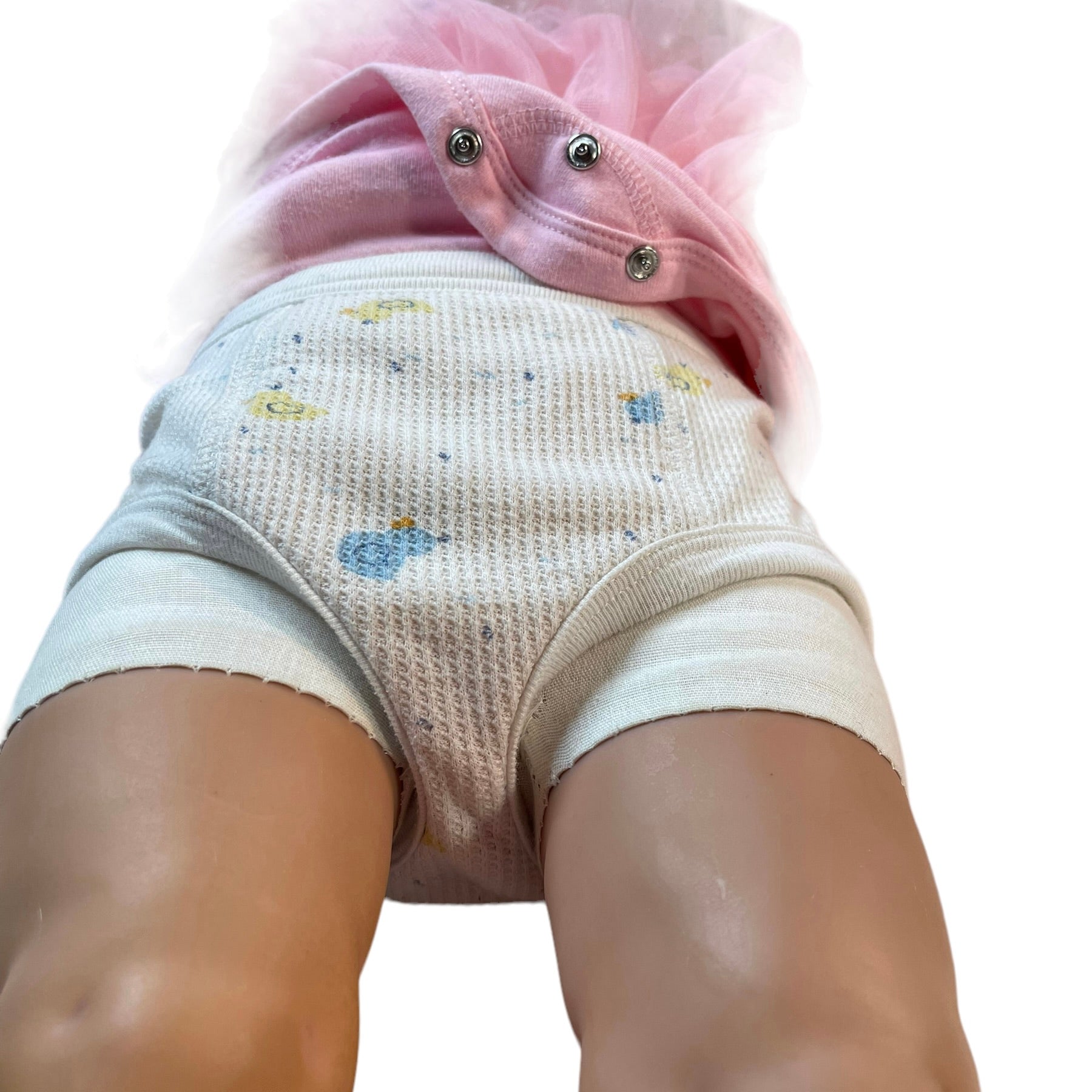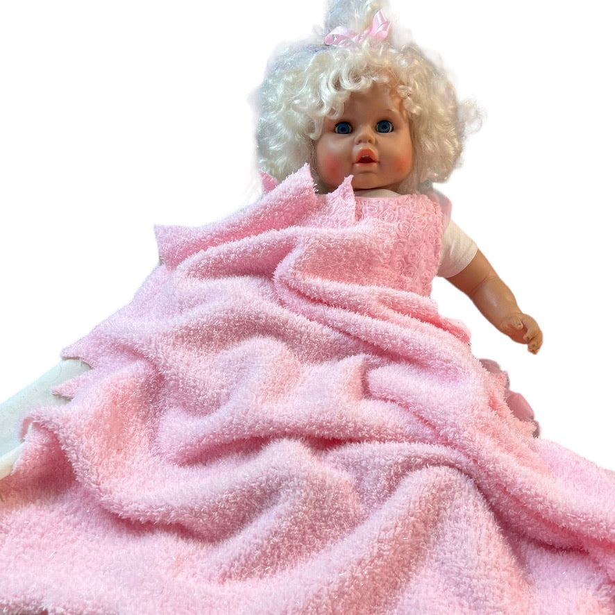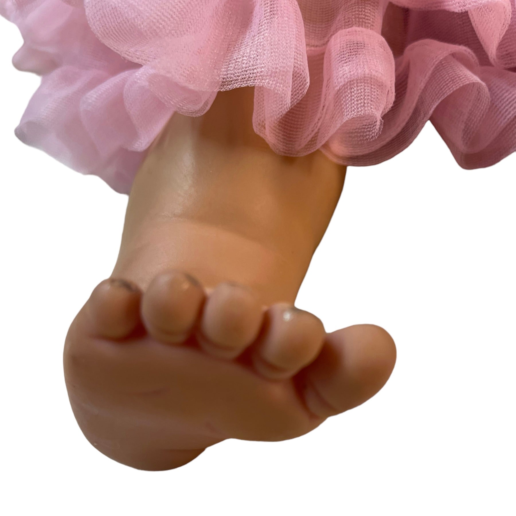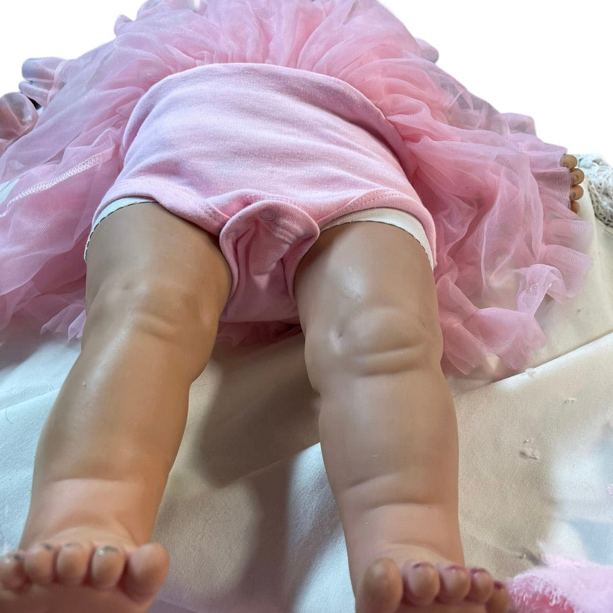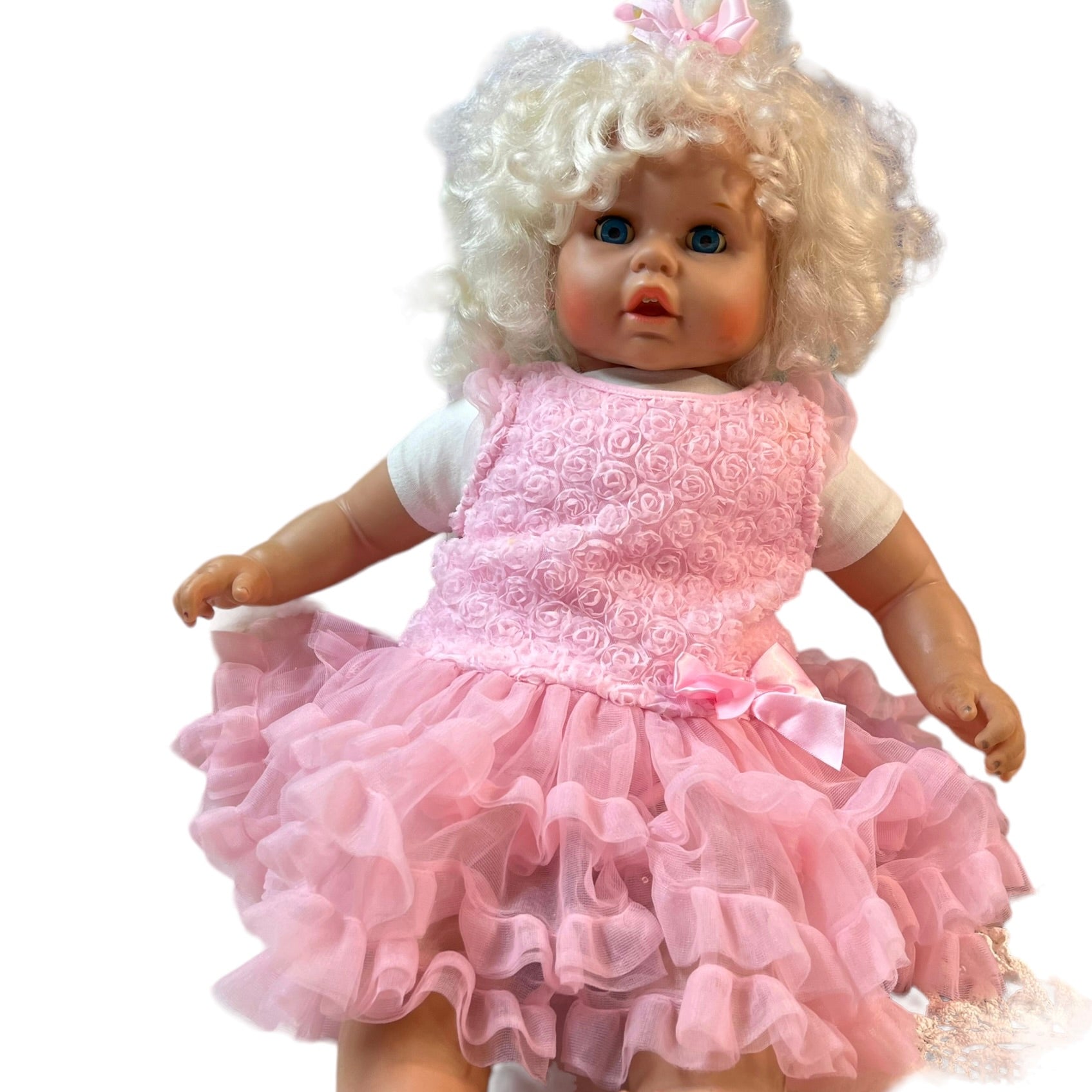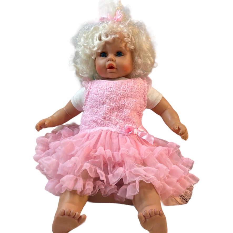 This beautiful extra large weighted toddler doll is beautifully dressed in pink tulle ruffles, pink snap undershirt and vintage training pants.She has had a small repair in her crotch area, see photos. This lovely doll has a riot of platinum curls, blue sleepy eyes and tiny white teeth. A doll any child or collector would be proud to own.