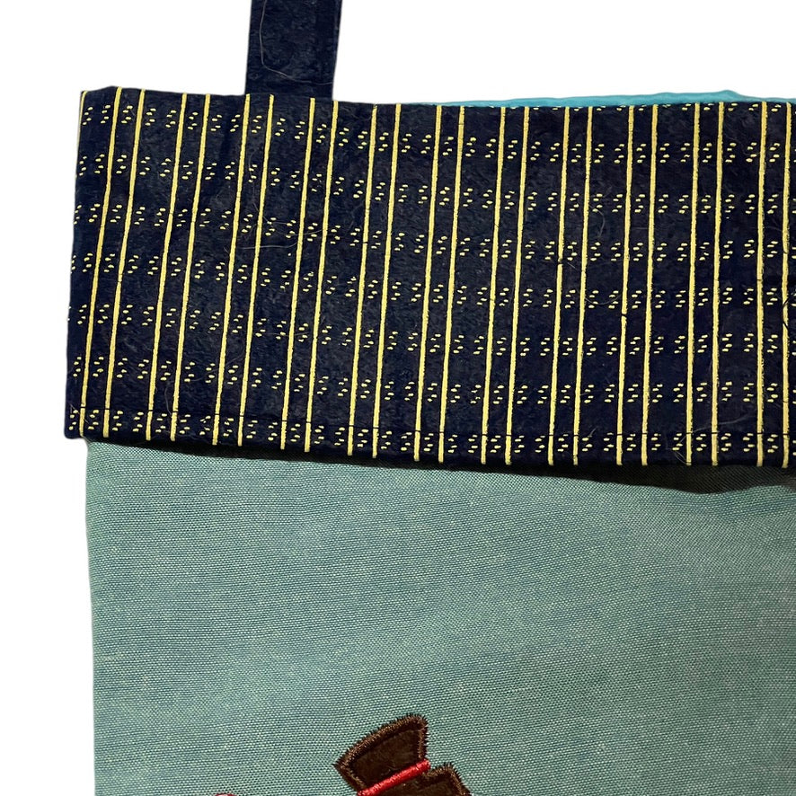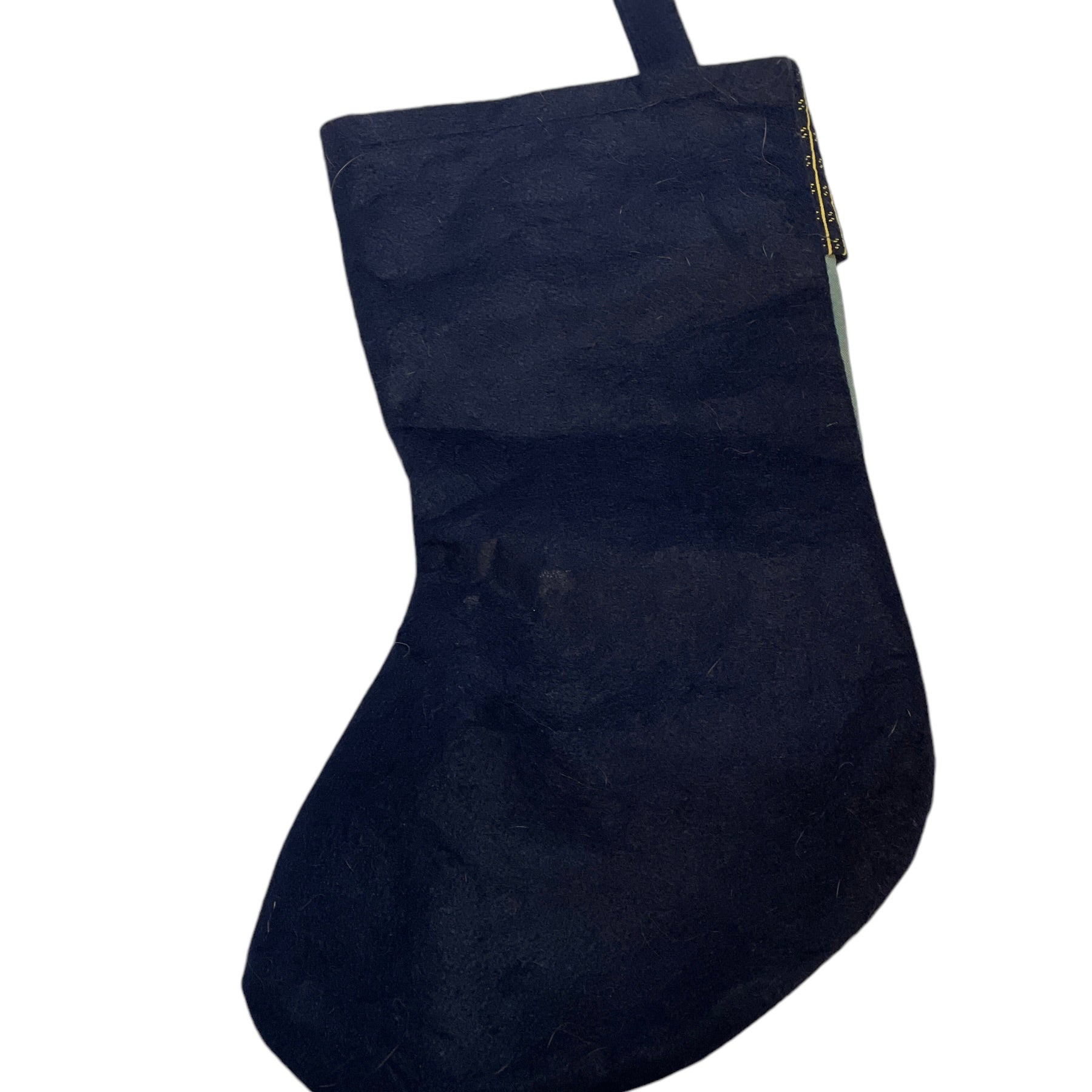 Lovely Blue Fabric Christmas Stocking with an Appliqued Snowman, complete with Button Accents and a woven top. 16" tall, 10" Foot. Excellent preowned condition.