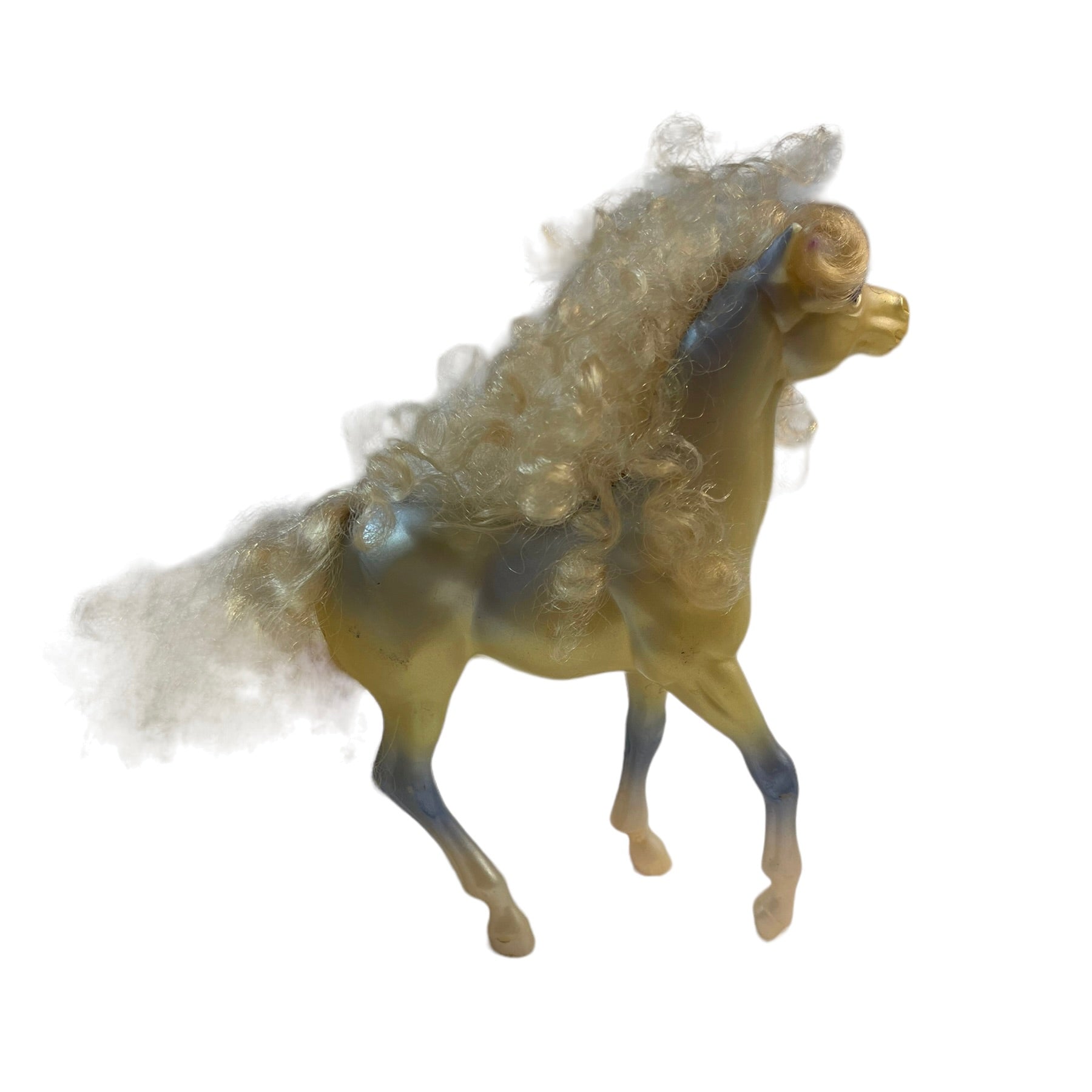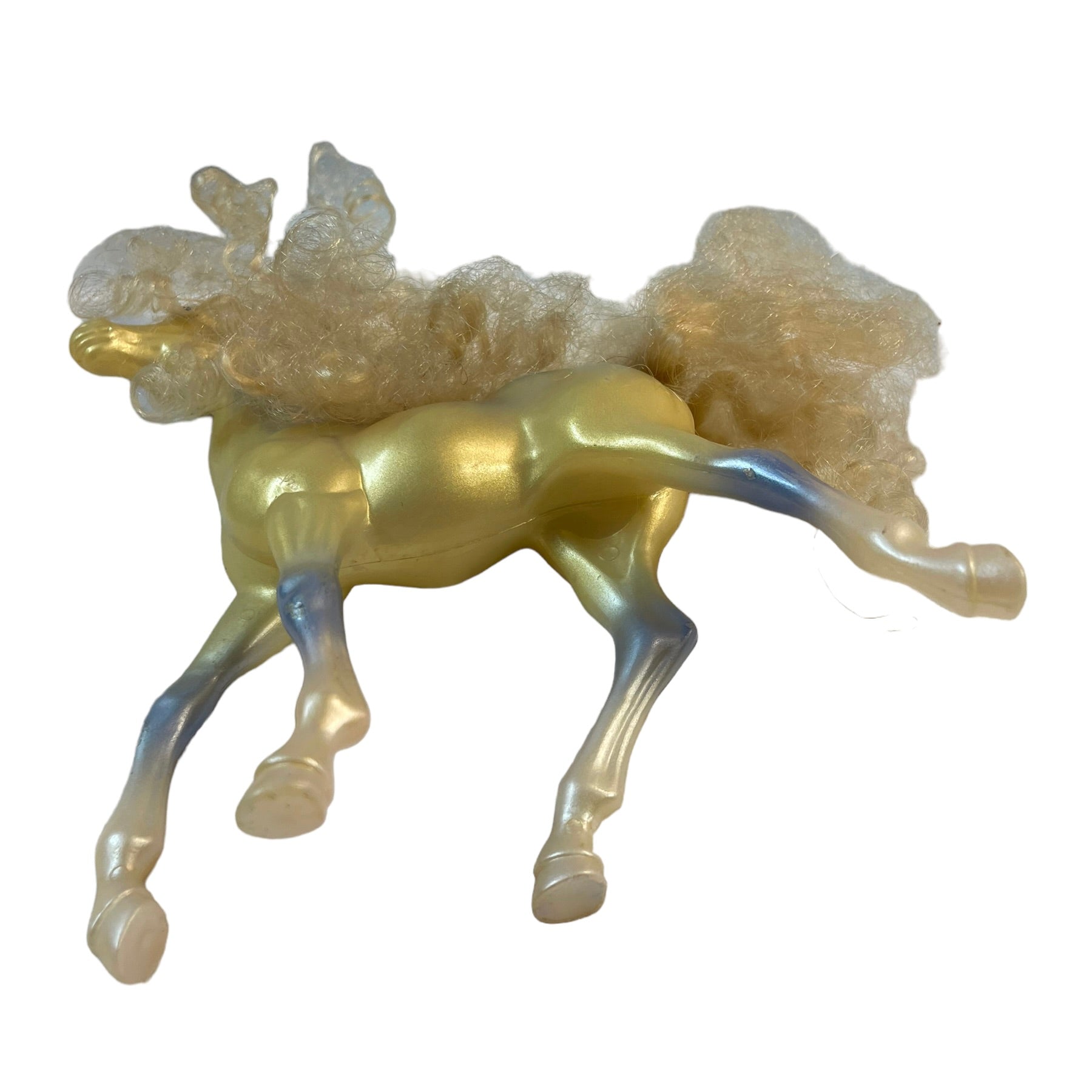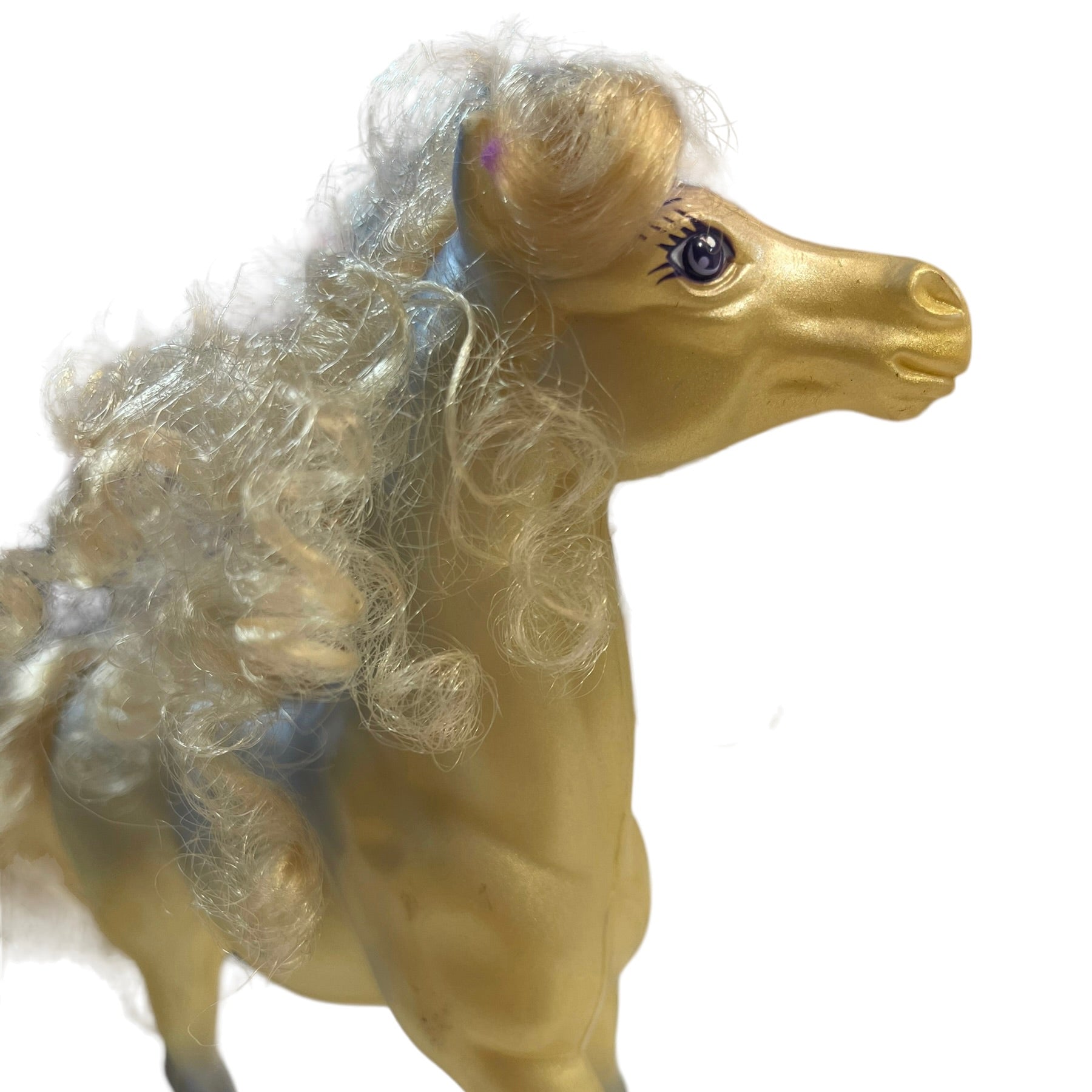Vintage Fashion Star Fillies, Ariel, exquisite iIridescent pony with masses of blond curls, gold body, with silver-blue accents on legs and back. This dainty beauty is in lovely preloved condition.
