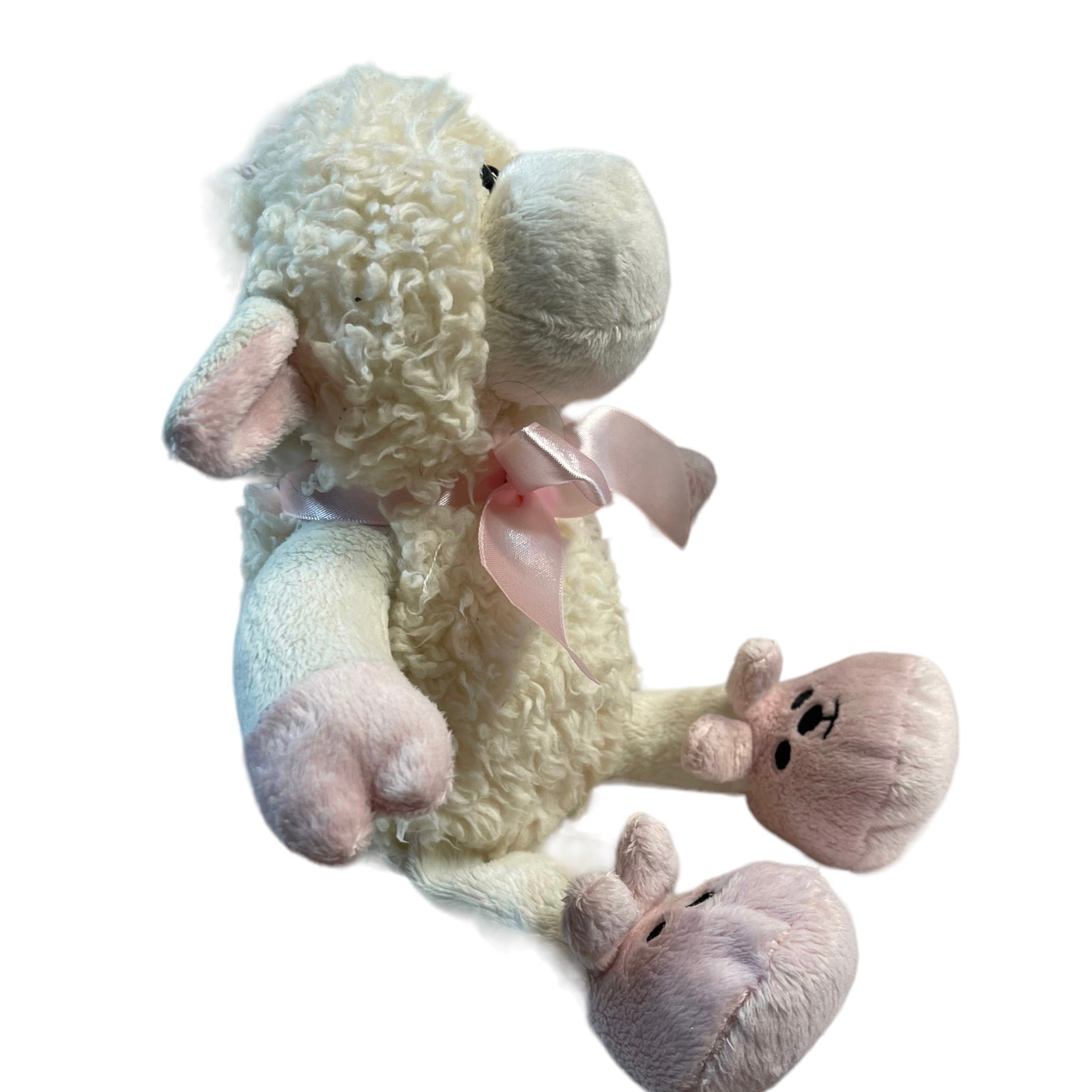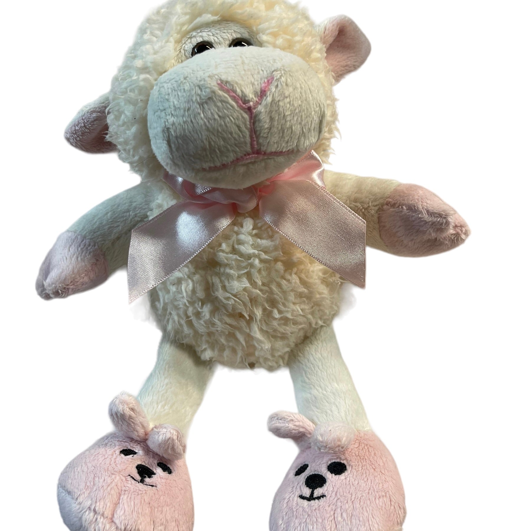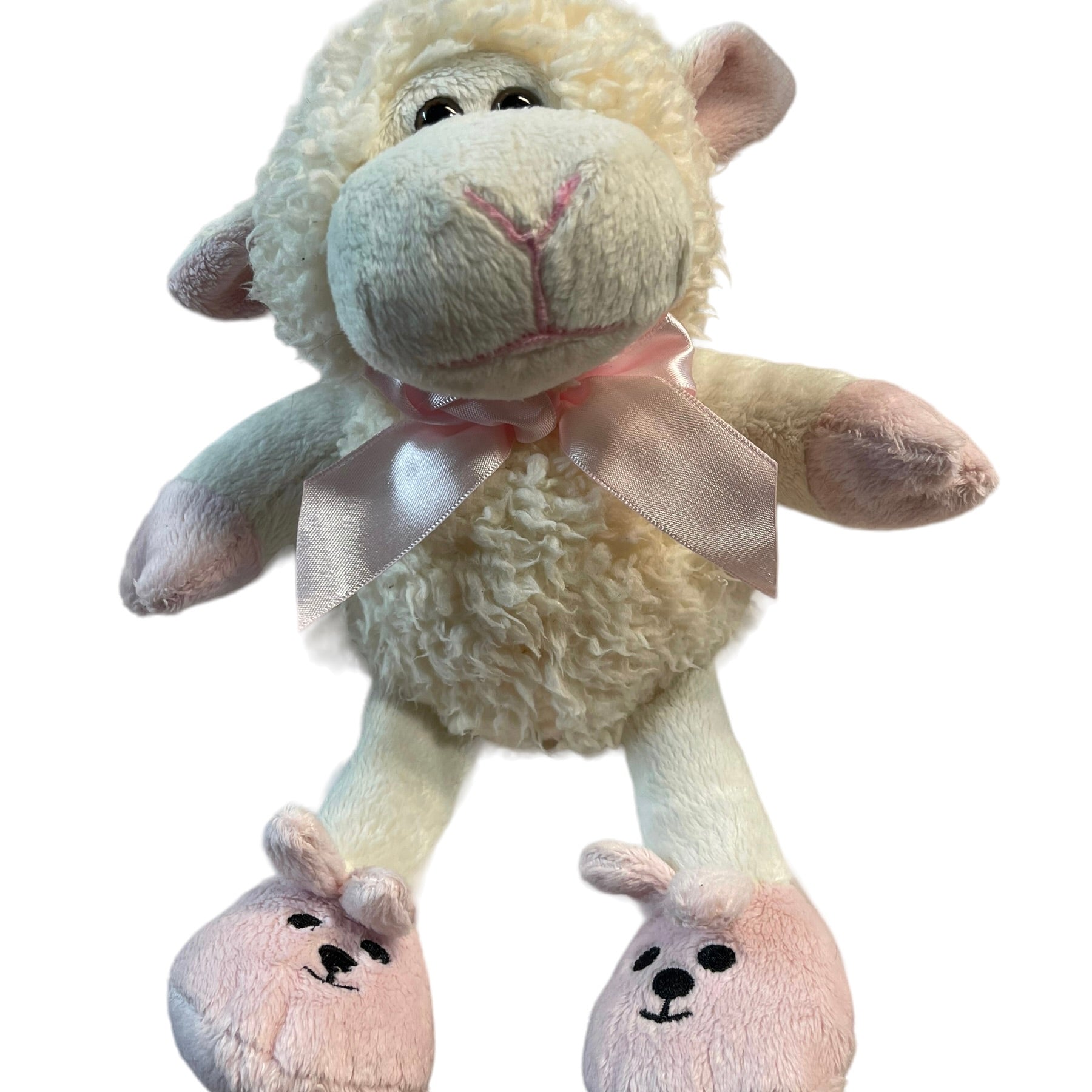 Fiesta 10" Stuffed Fuzzy Sheep With Pink Bunny Slippers and Pink Satin Bow in very good preloved condition.