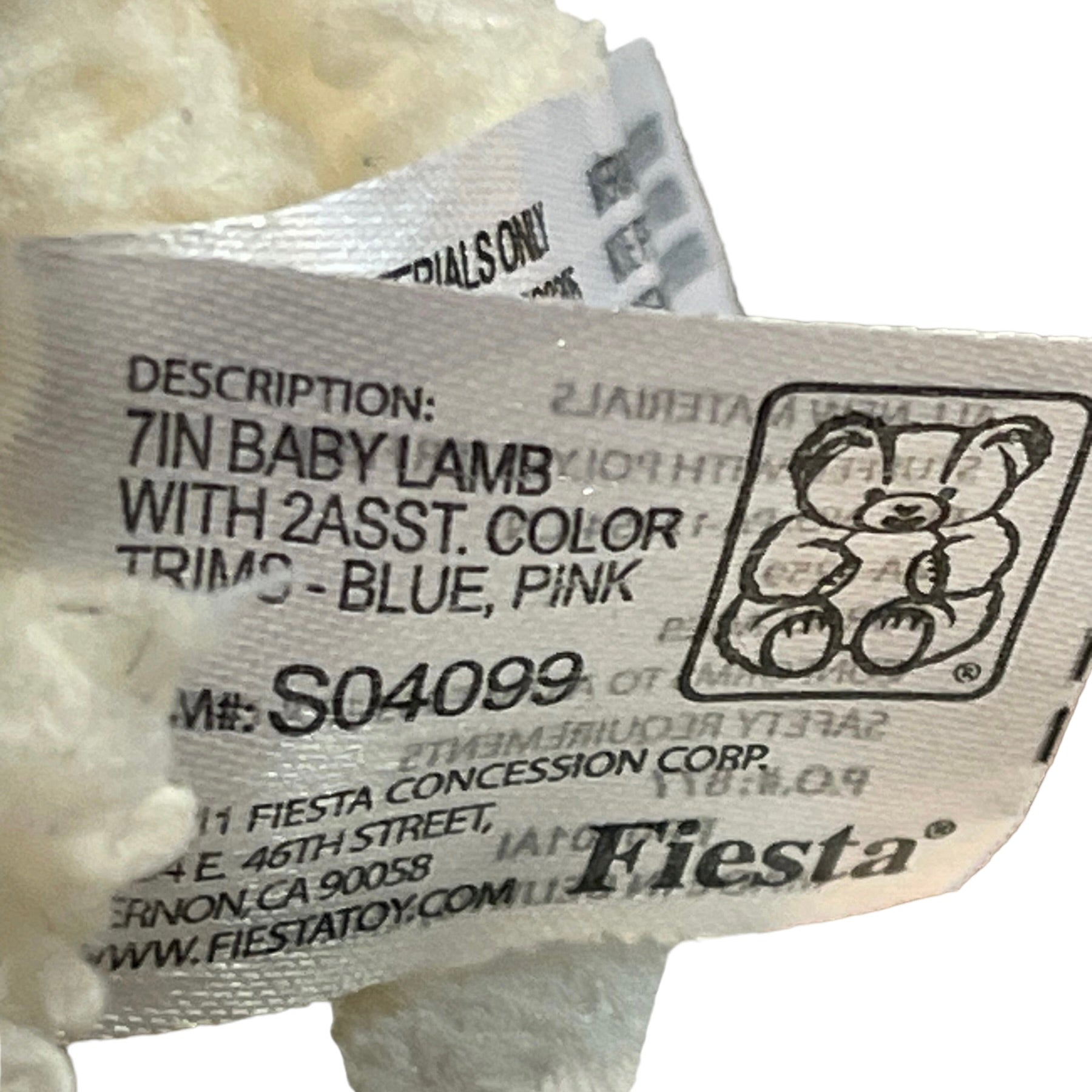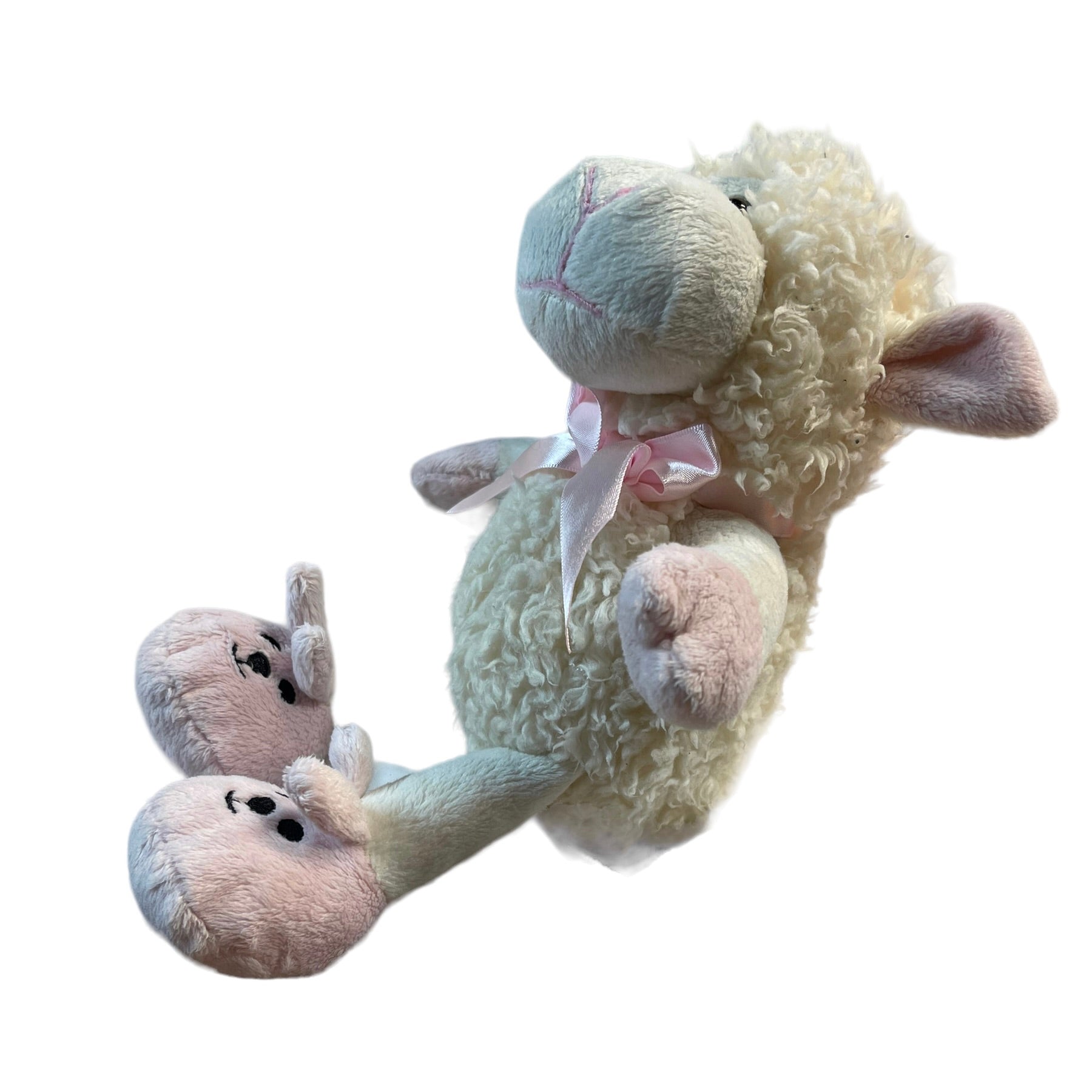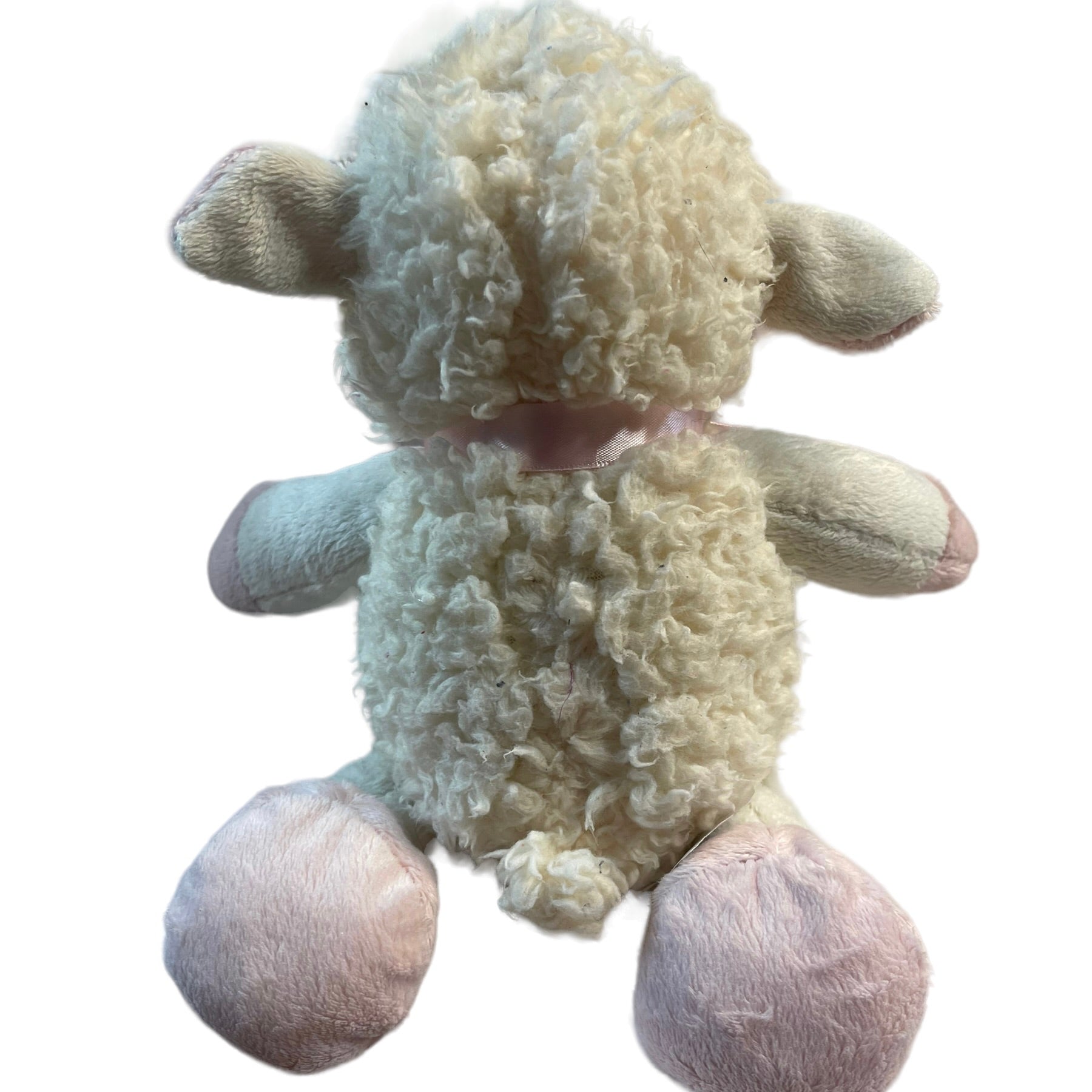 Fiesta 10" Stuffed Fuzzy Sheep With Pink Bunny Slippers and Pink Satin Bow in very good preloved condition.