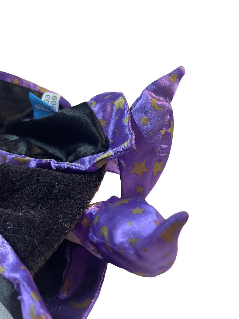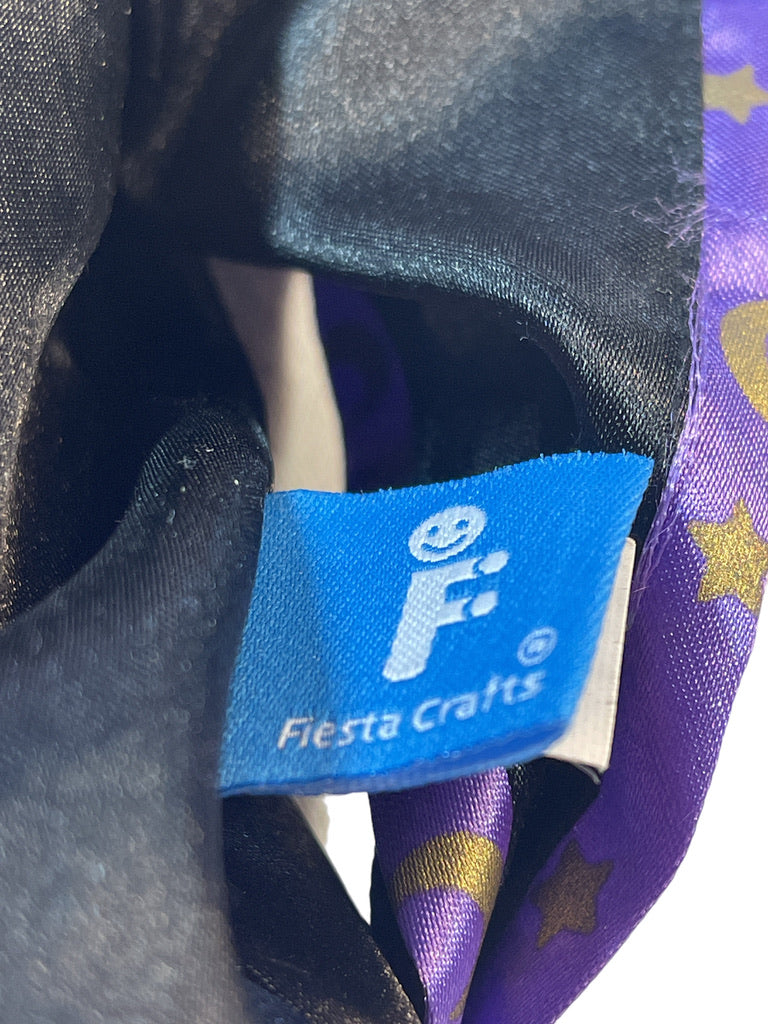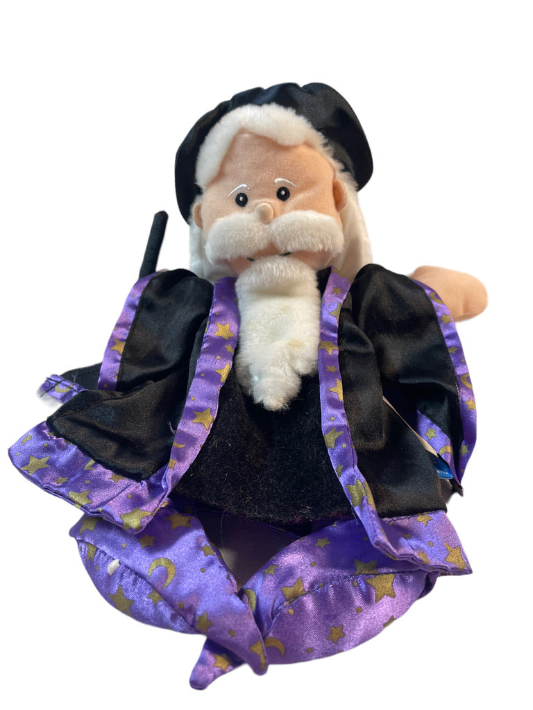 Fiesta Craft Merlin Hand puppet is beautifully dressed in black and purple satin robes and pointy shoes. His long white beard, hair & and black wand add to his mysterious look. A beautiful Wizard for imaginative play.