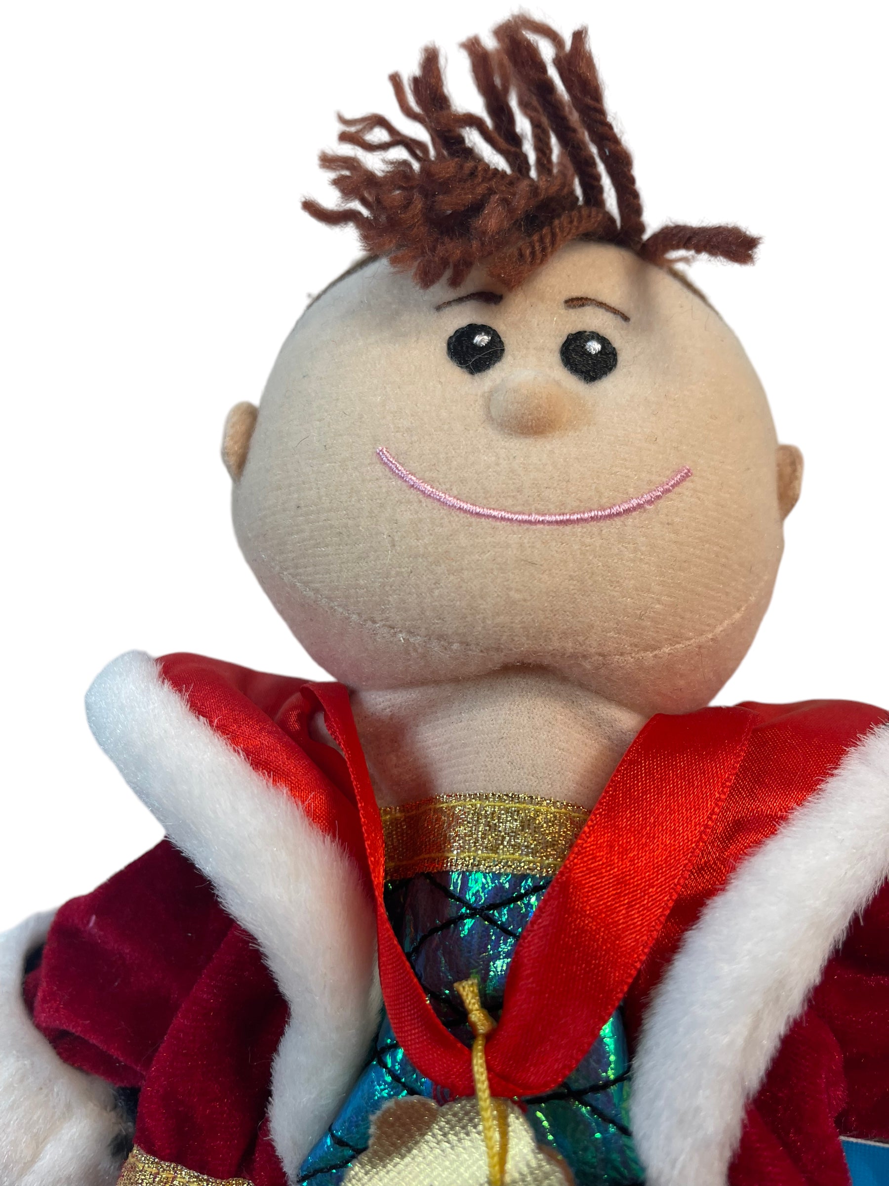 Lovey Royal Queen Fiesta Hand Puppet with a long yarn braid and gold crown. Dressed in Red Velvet & satin with gold accents on top of a sparkly turquoise dress. A lovely puppet for hours of imaginative play.