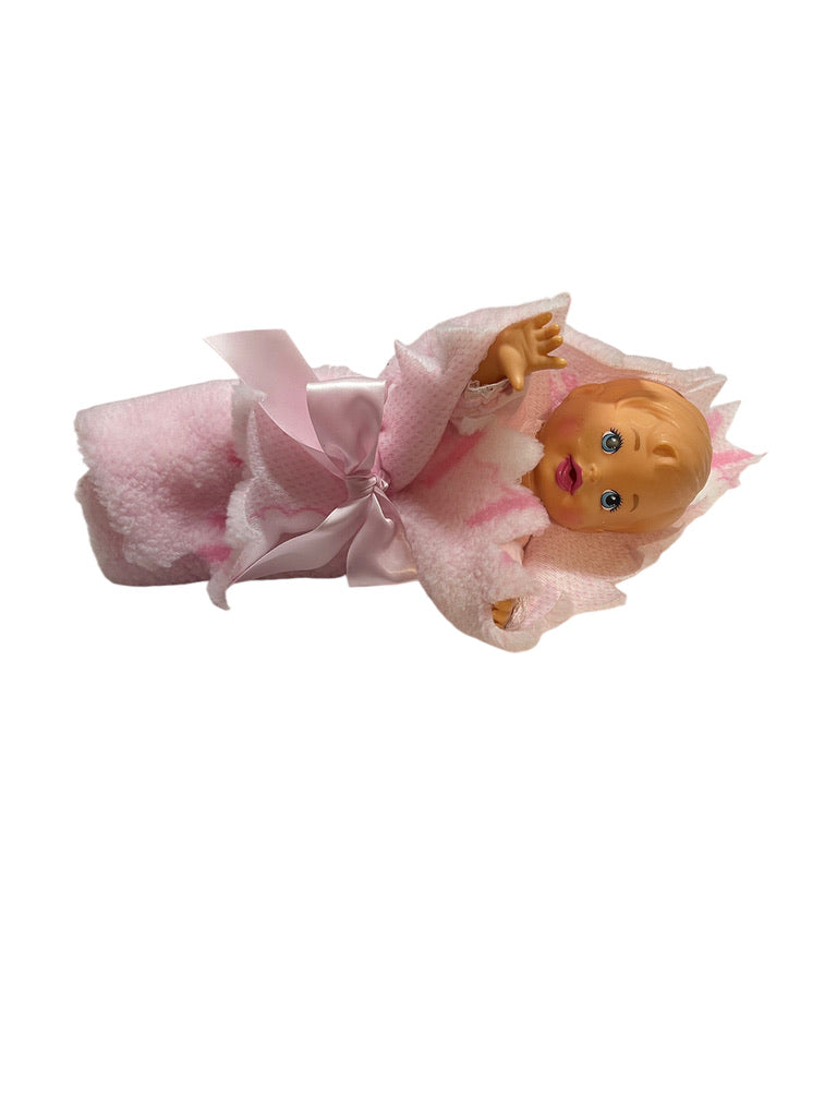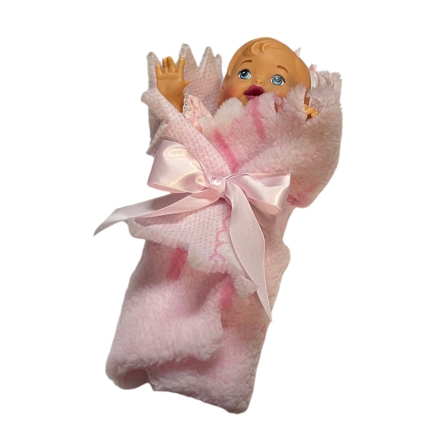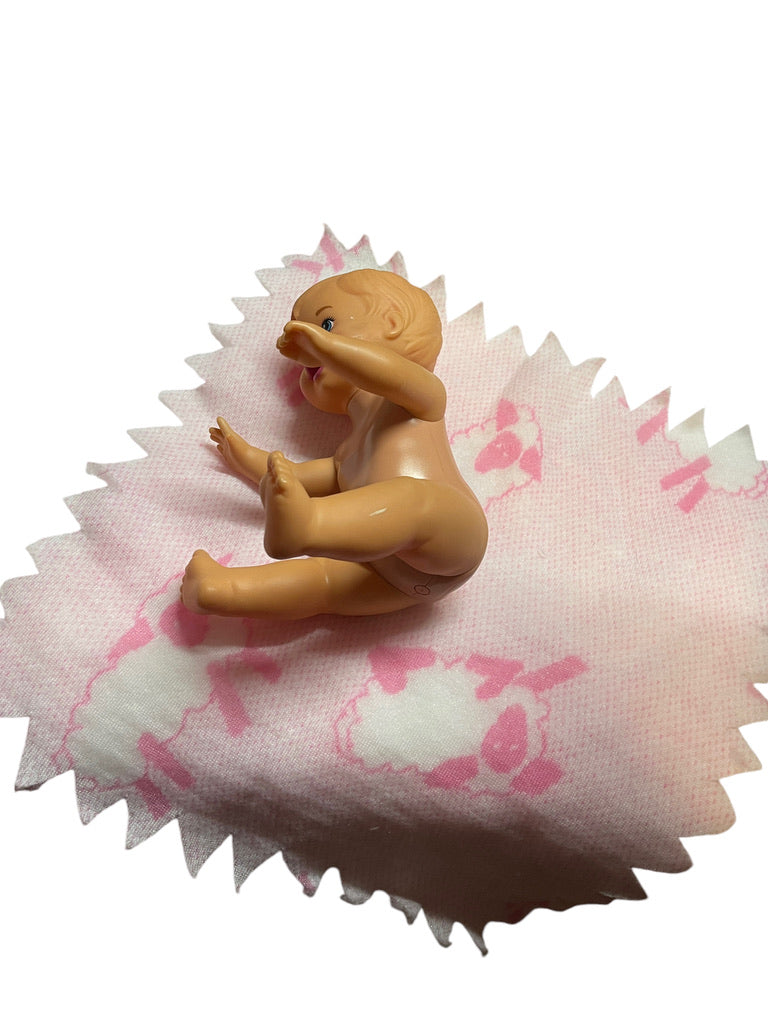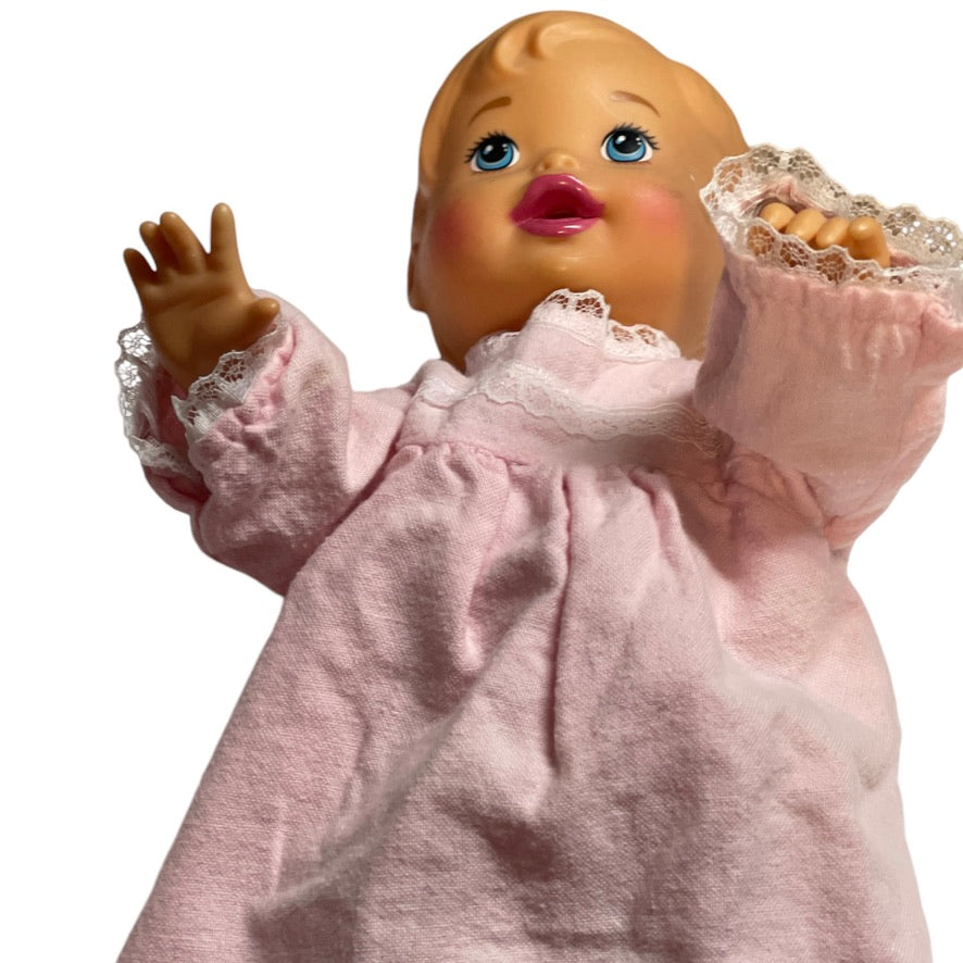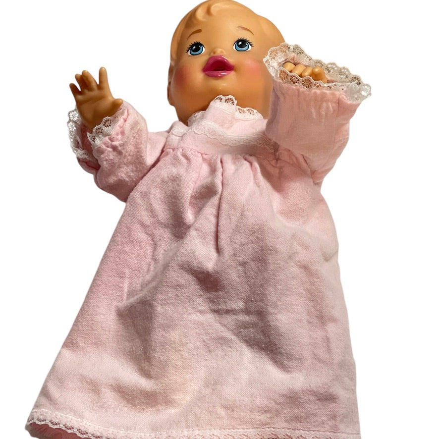 Adorable Mattel, 'Little Mommy' 13" Vinyl Baby Doll with moulded hair and blue eyes is a perfect playmate for doll lovers of all ages. Wearing a vintage pink lace trimmed flannel nightie with metal snaps, this little blue eyed beauty is cozily wrapped in a pretty pink & white blanket. Baby is in very good preloved condition.