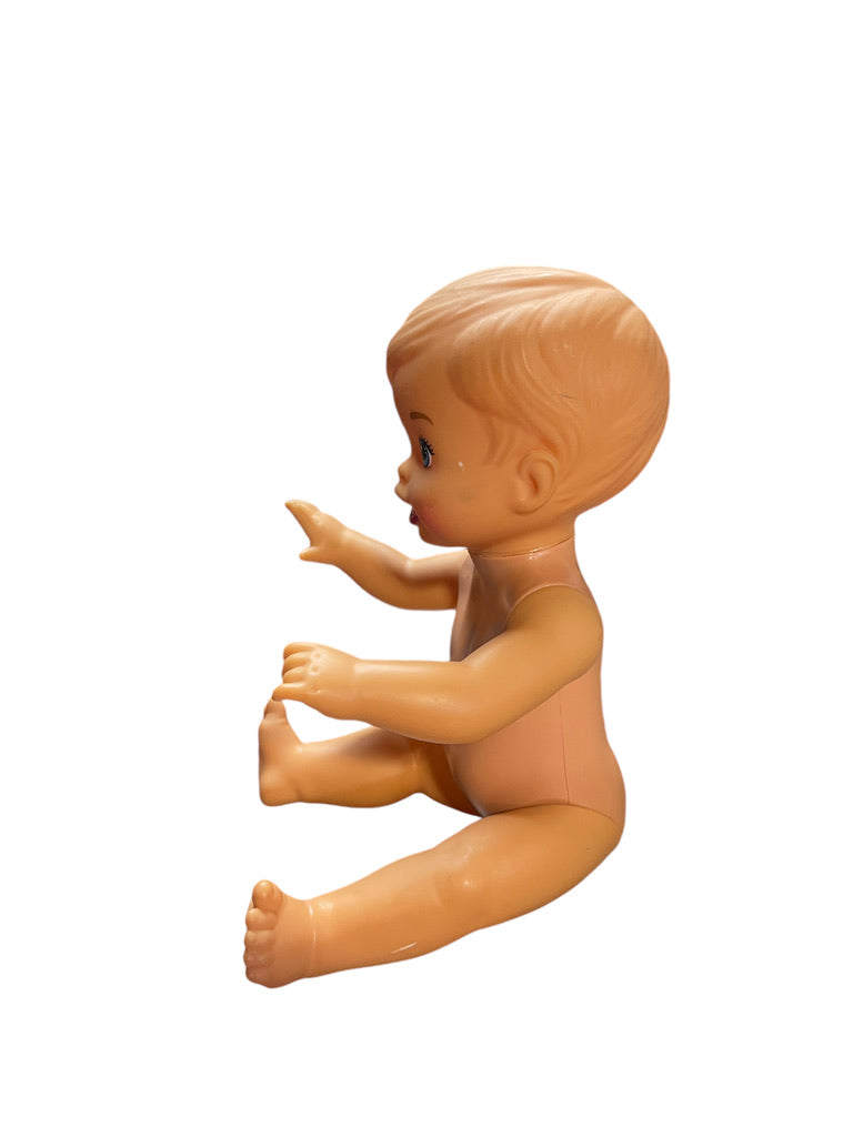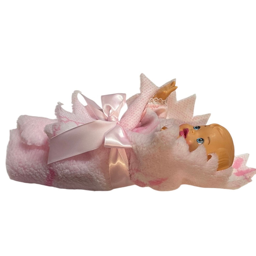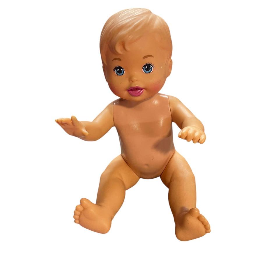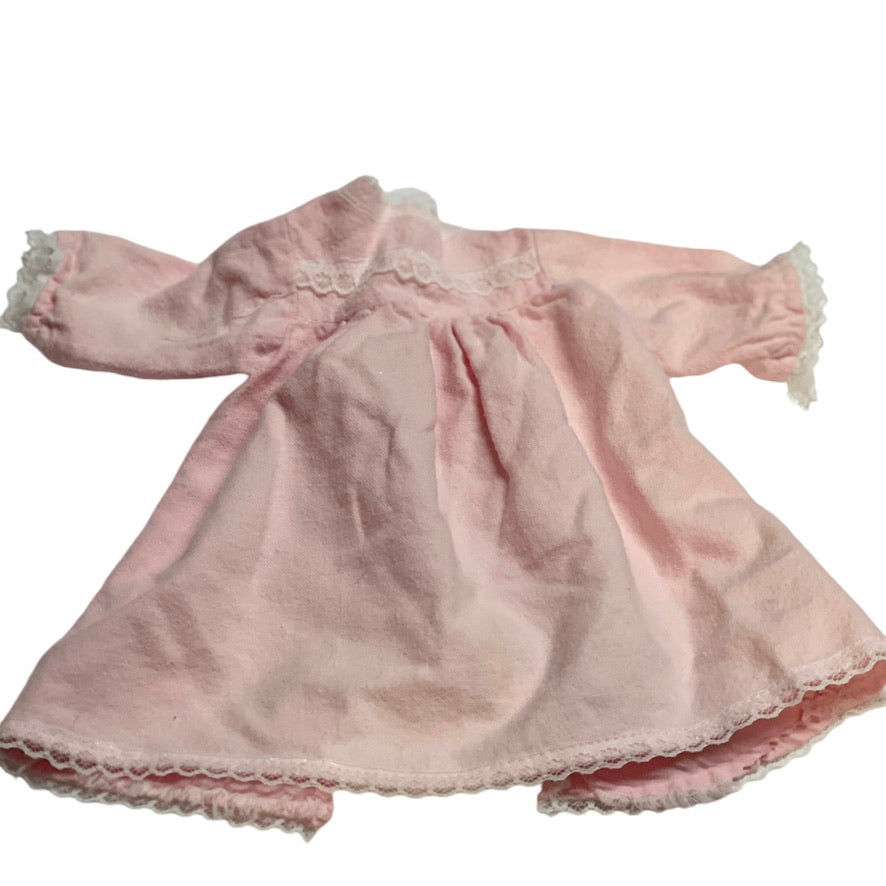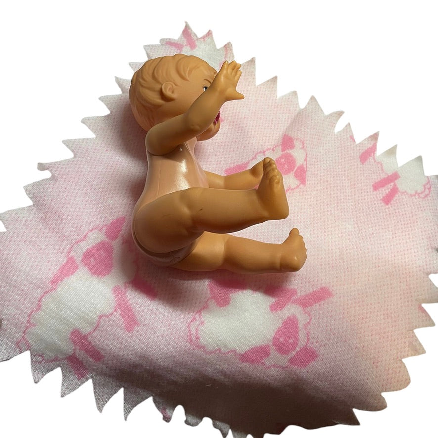 Adorable Mattel, 'Little Mommy' 13" Vinyl Baby Doll with moulded hair and blue eyes is a perfect playmate for doll lovers of all ages. Wearing a vintage pink lace trimmed flannel nightie with metal snaps, this little blue eyed beauty is cozily wrapped in a pretty pink & white blanket. Baby is in very good preloved condition.