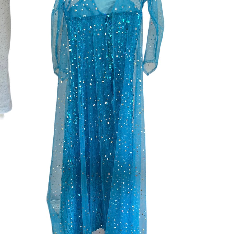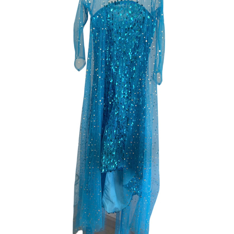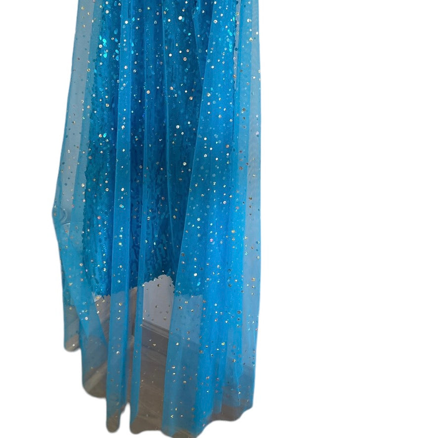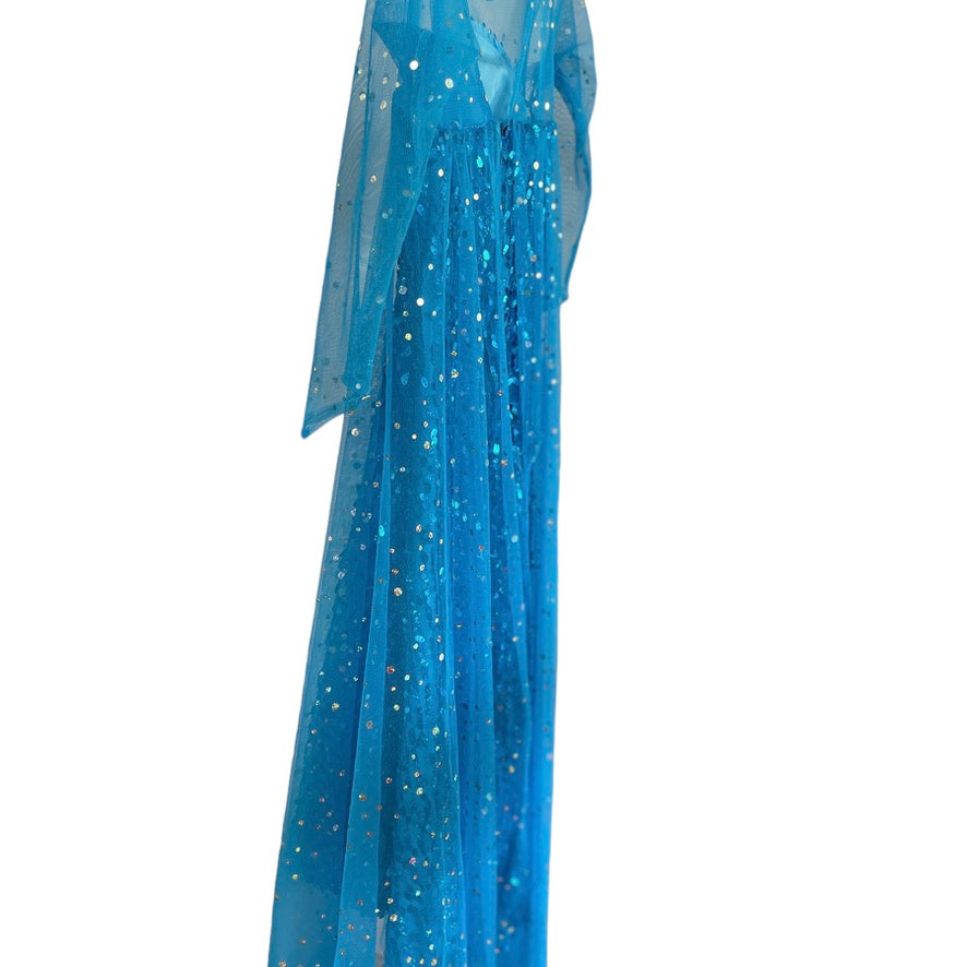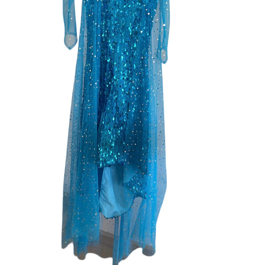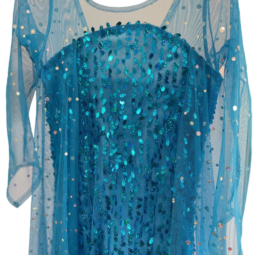 Frozen Turquoise Sequinned Elsa Fancy Dress with Sparkly Mesh Sleeves and Train EUC