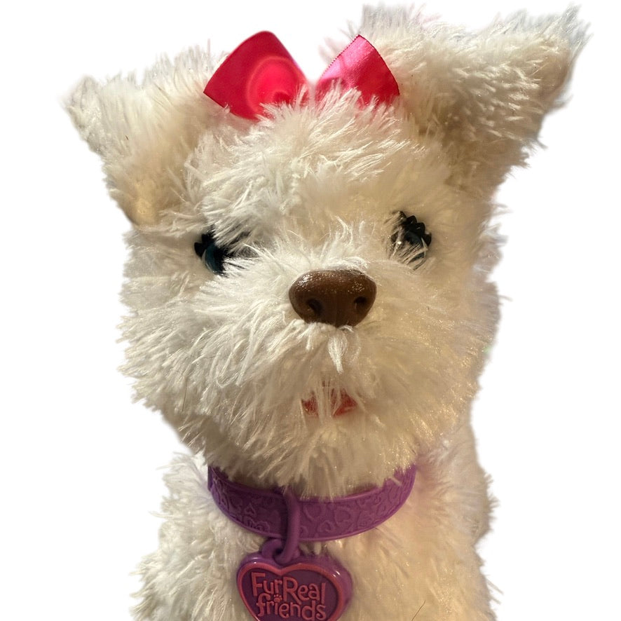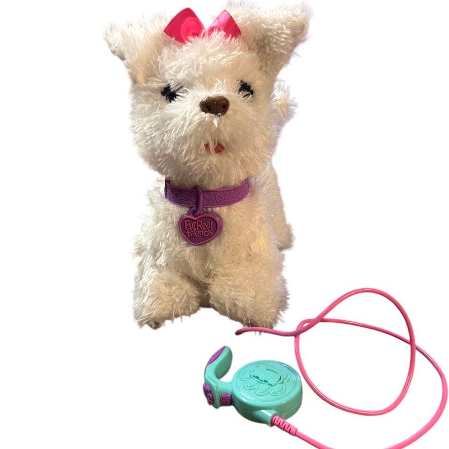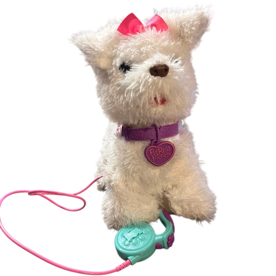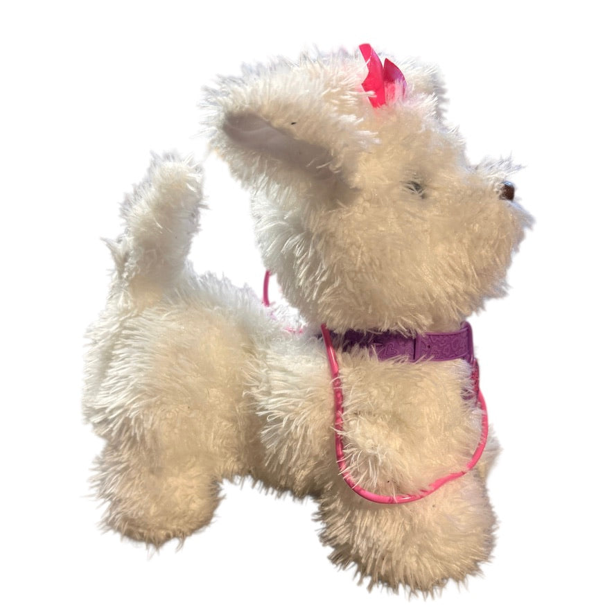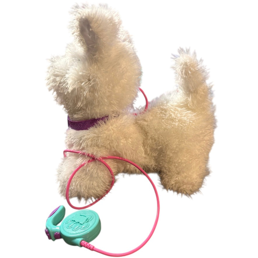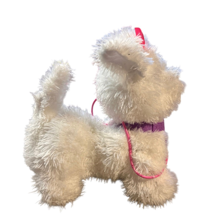 Adorable white fluffy, furry terrier with jaunty pink bow, wearing a purple and pink collar and medallion with pink leash and aqua control. This sweet baby in interactive and can sit, pant, bark and walk/run. A very special toy!