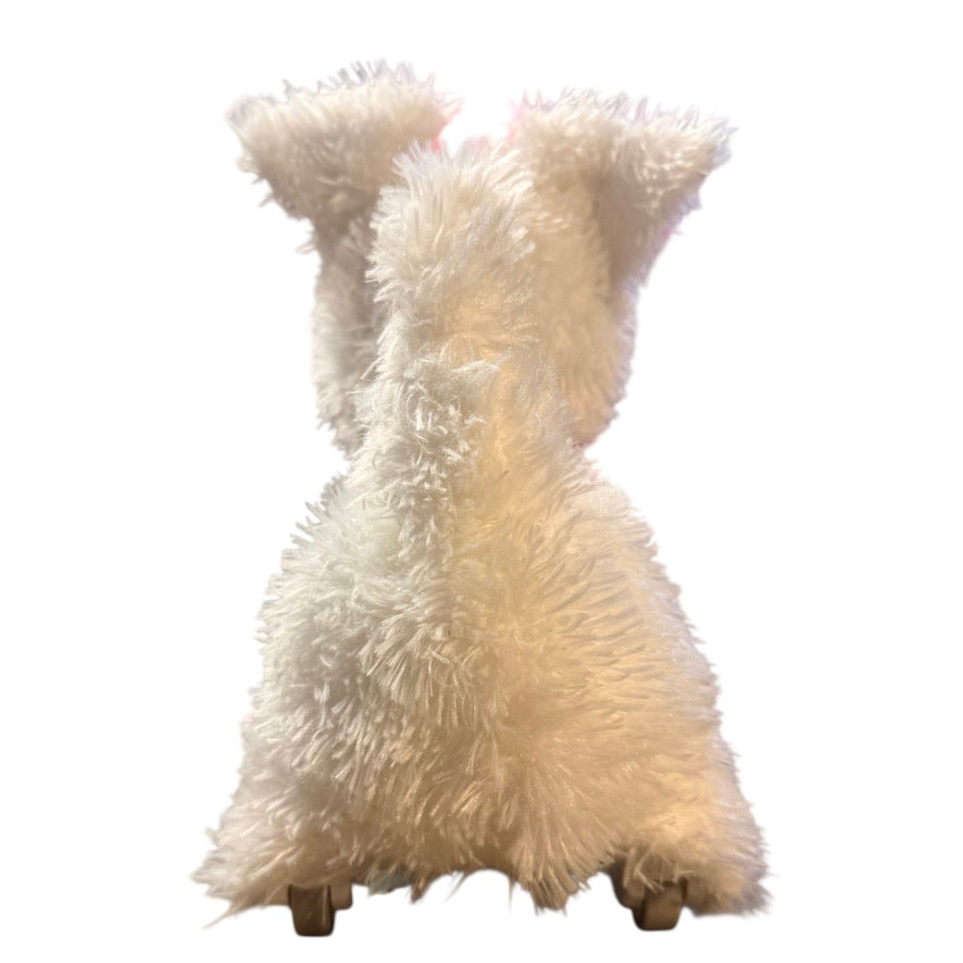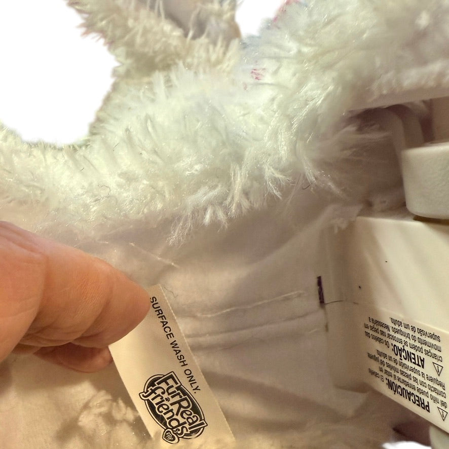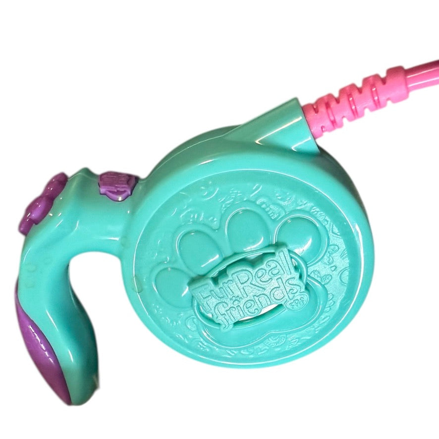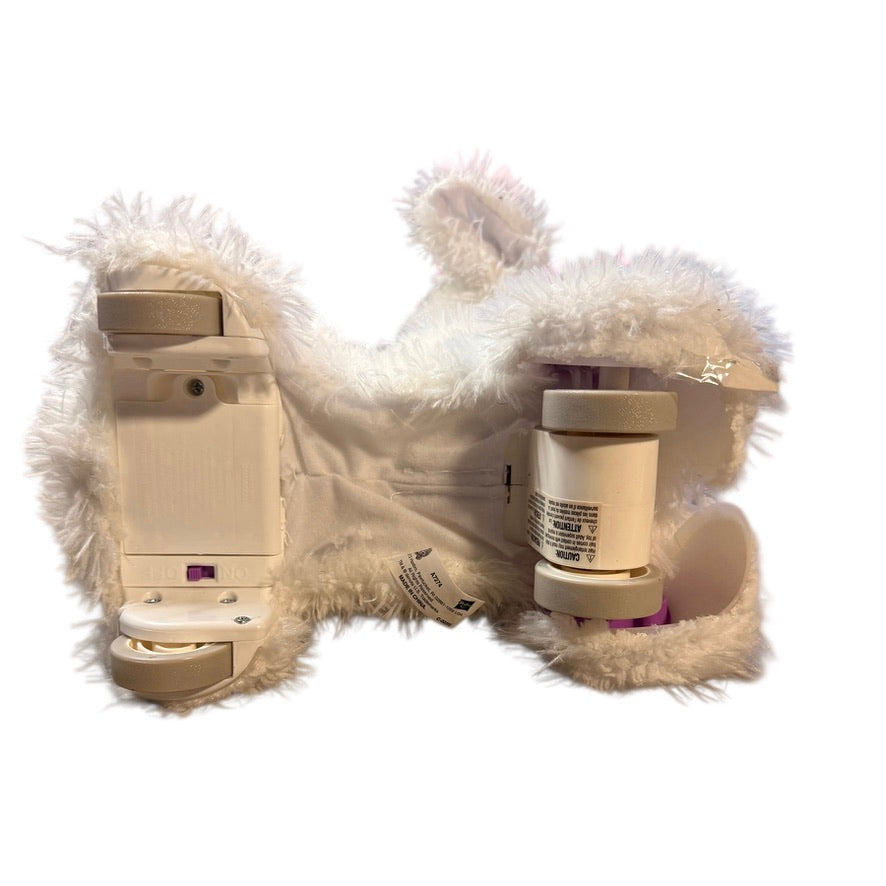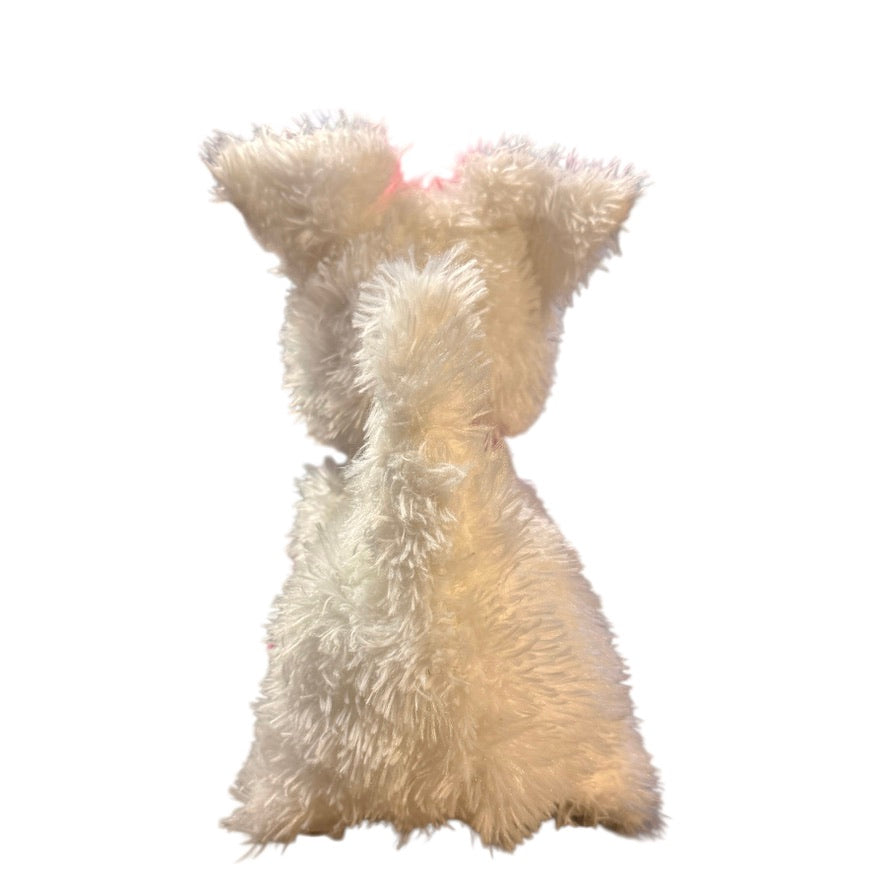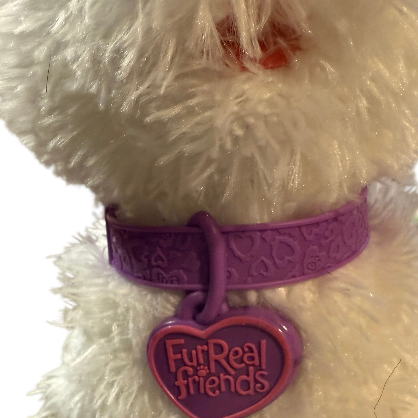 Adorable white fluffy, furry terrier with jaunty pink bow, wearing a purple and pink collar and medallion with pink leash and aqua control. This sweet baby in interactive and can sit, pant, bark and walk/run. A very special toy!