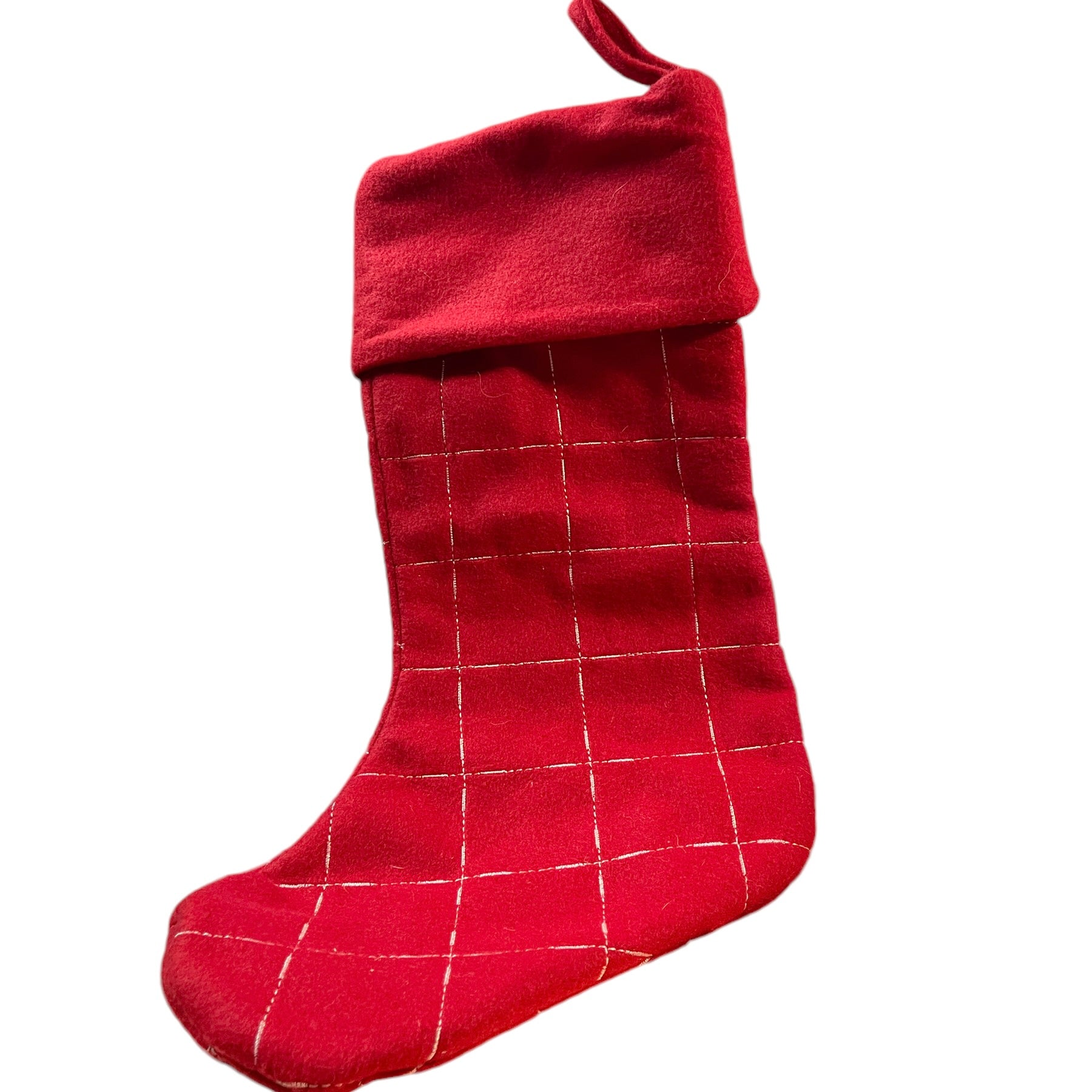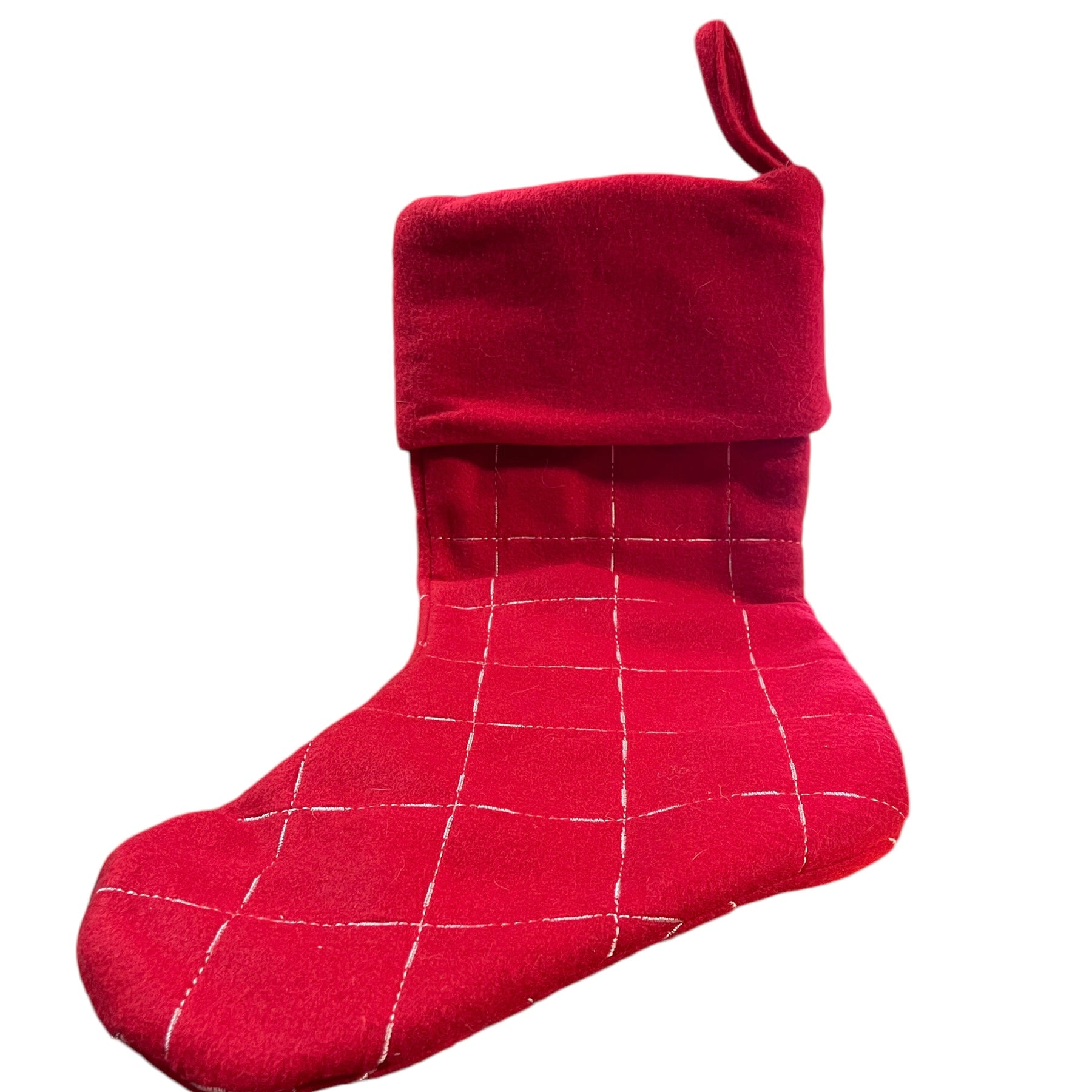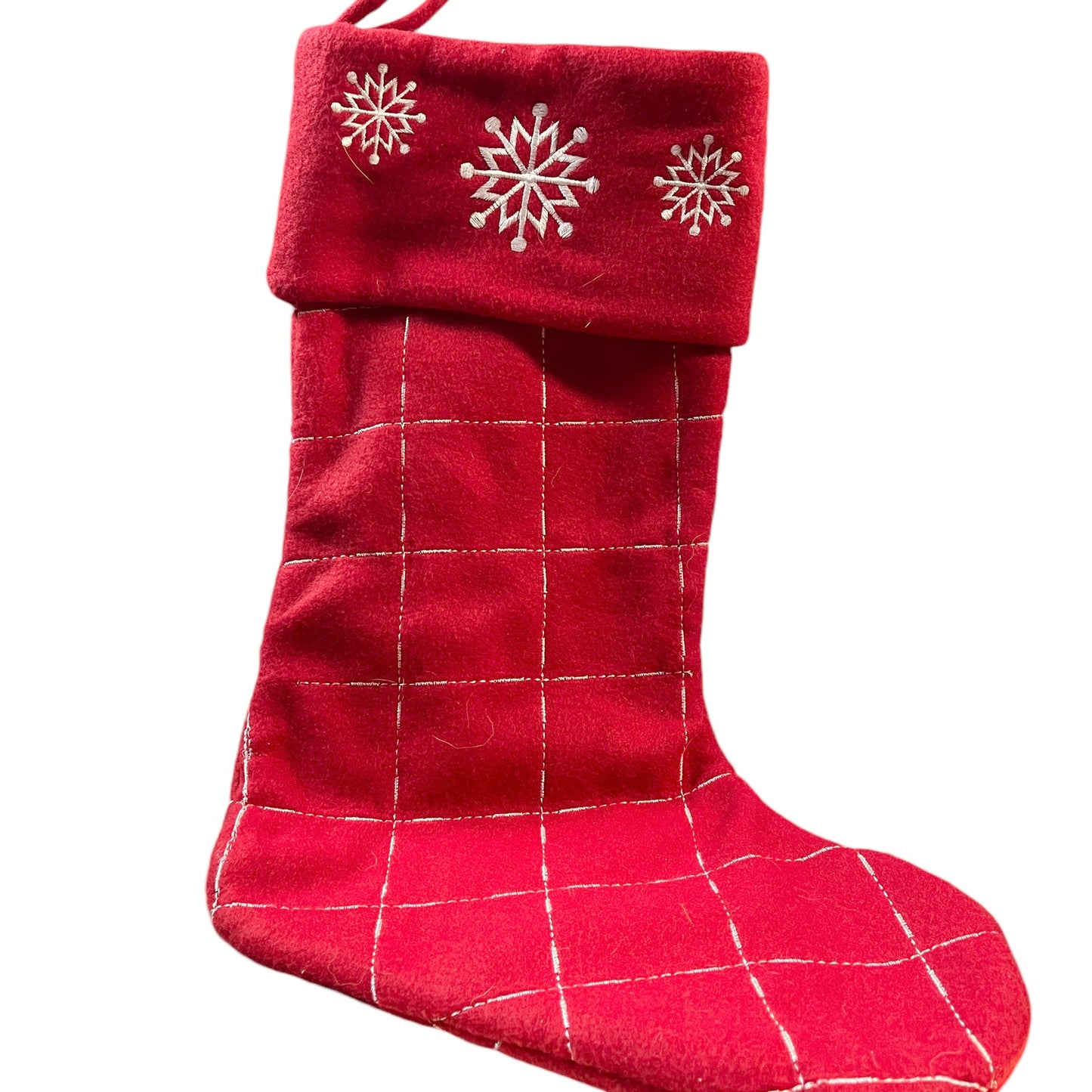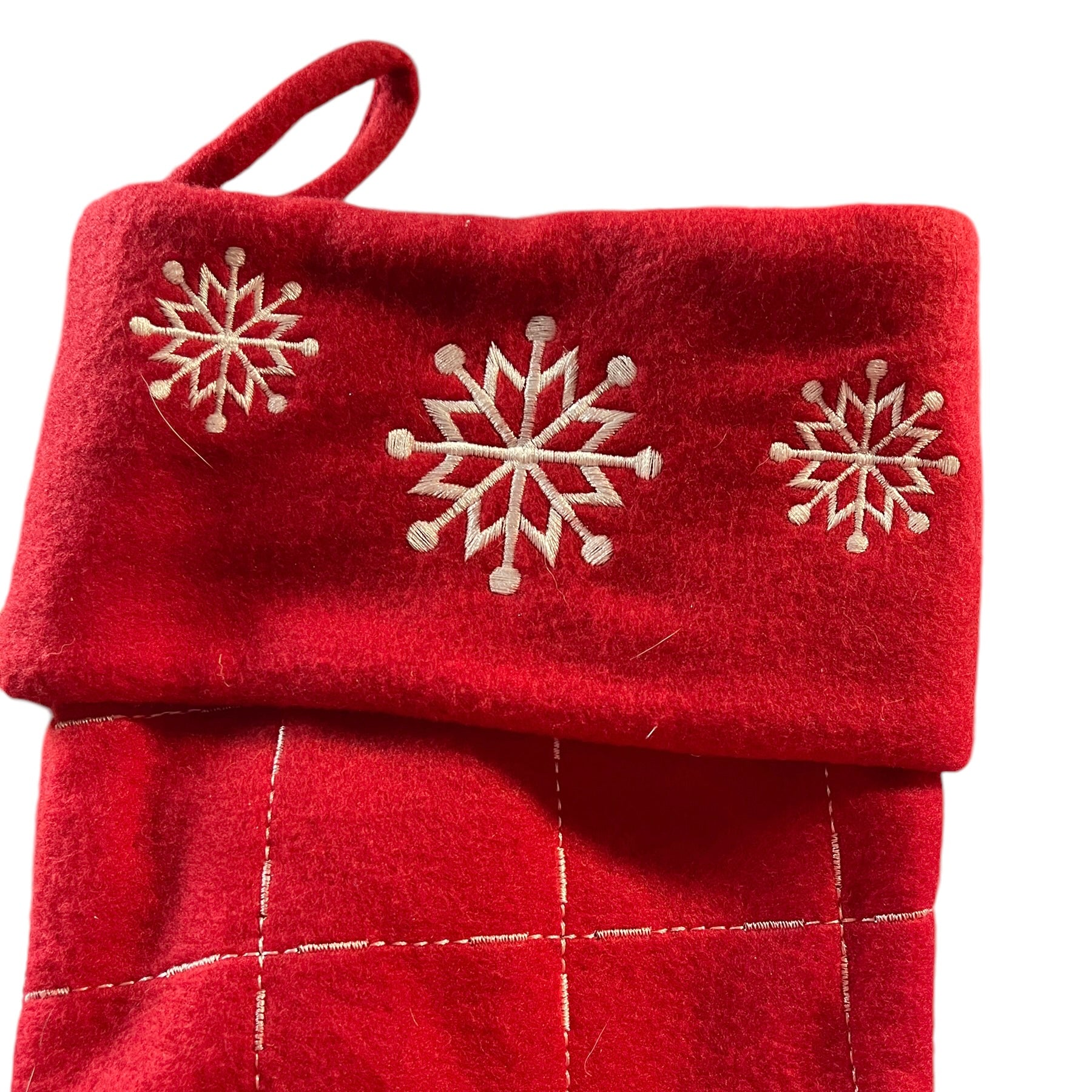 Generous Red Fleece Christmas Stocking, Gold Stitching and Embroidered Snowflakes in EUC