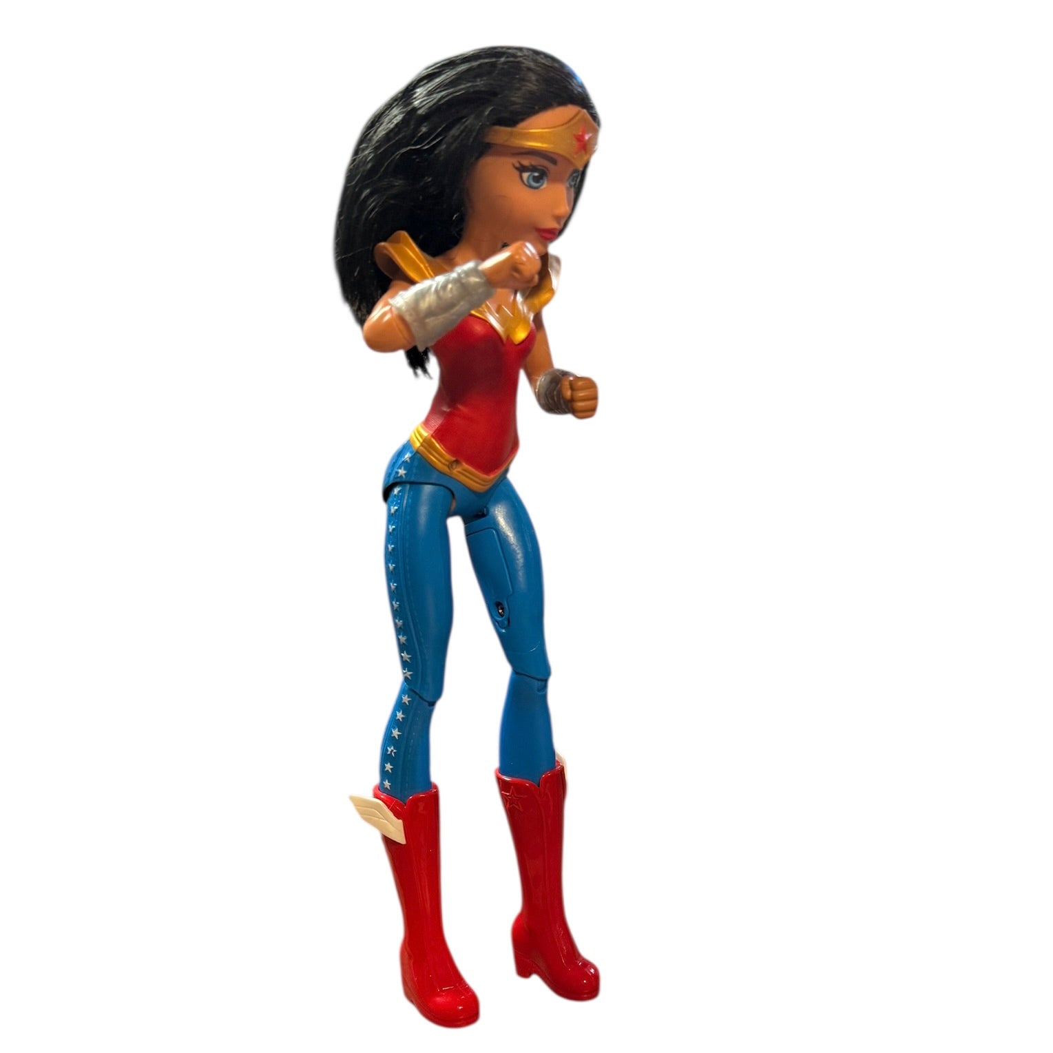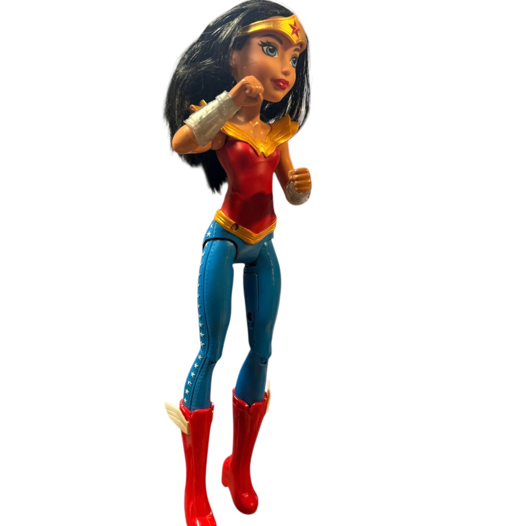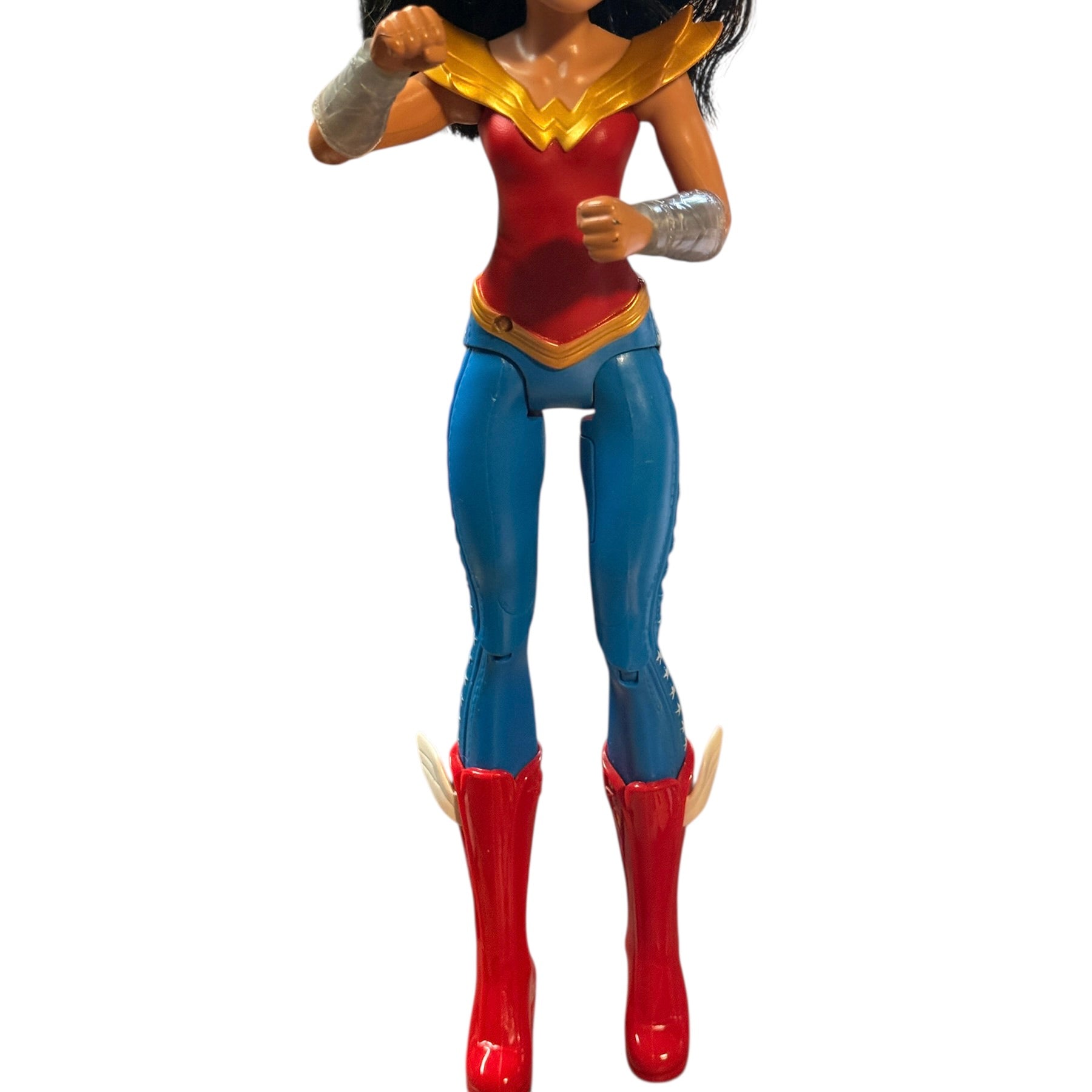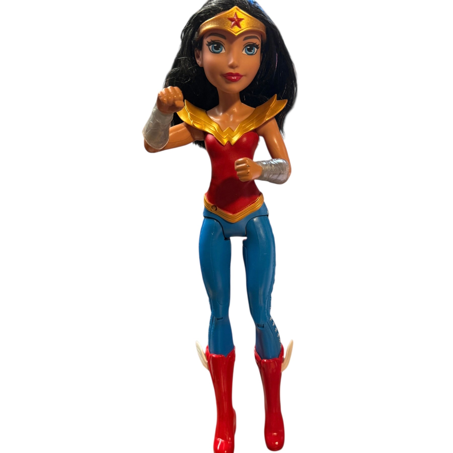 Classic Wonder Woman in a 12" Action Figure Doll with great winged boots, slim blue pants & gold crown complete with red star. She also has arm movements, light up wrist bands, sounds, and she speaks 4 phrases. A lovely doll in great preowned condition.