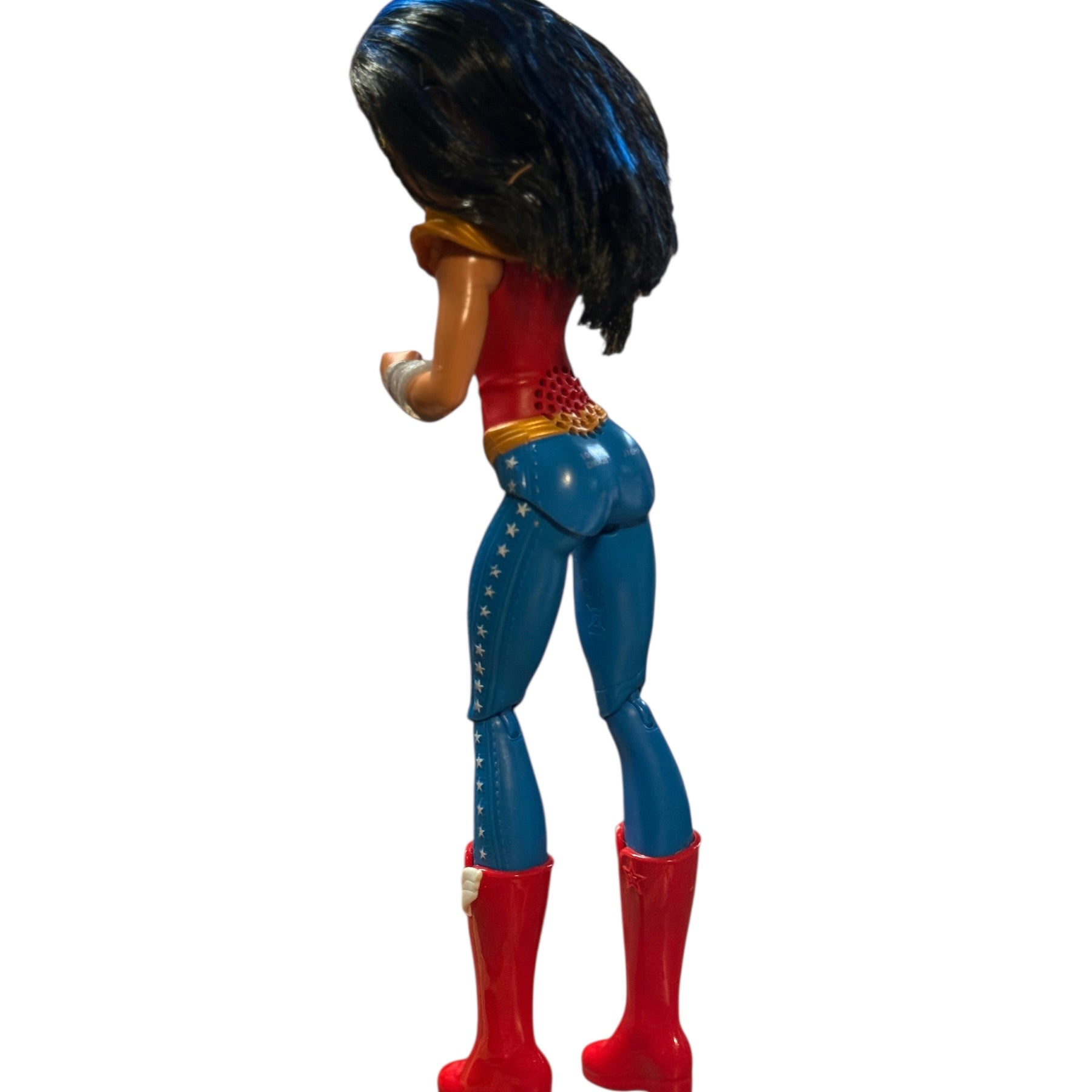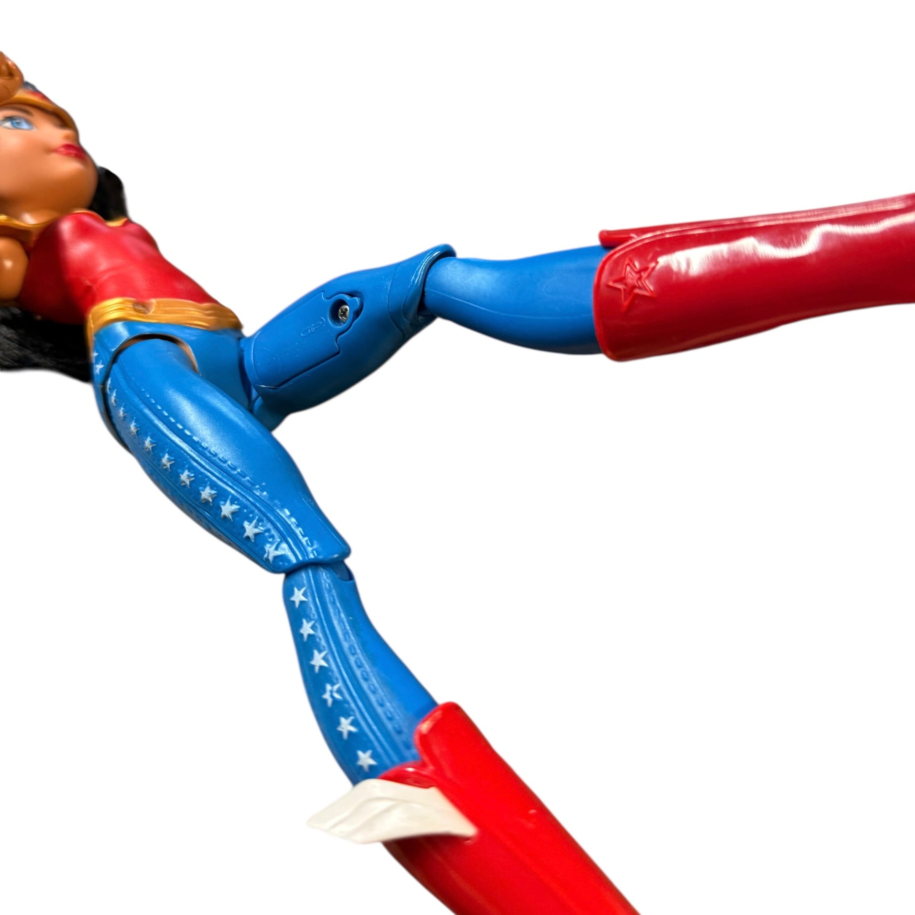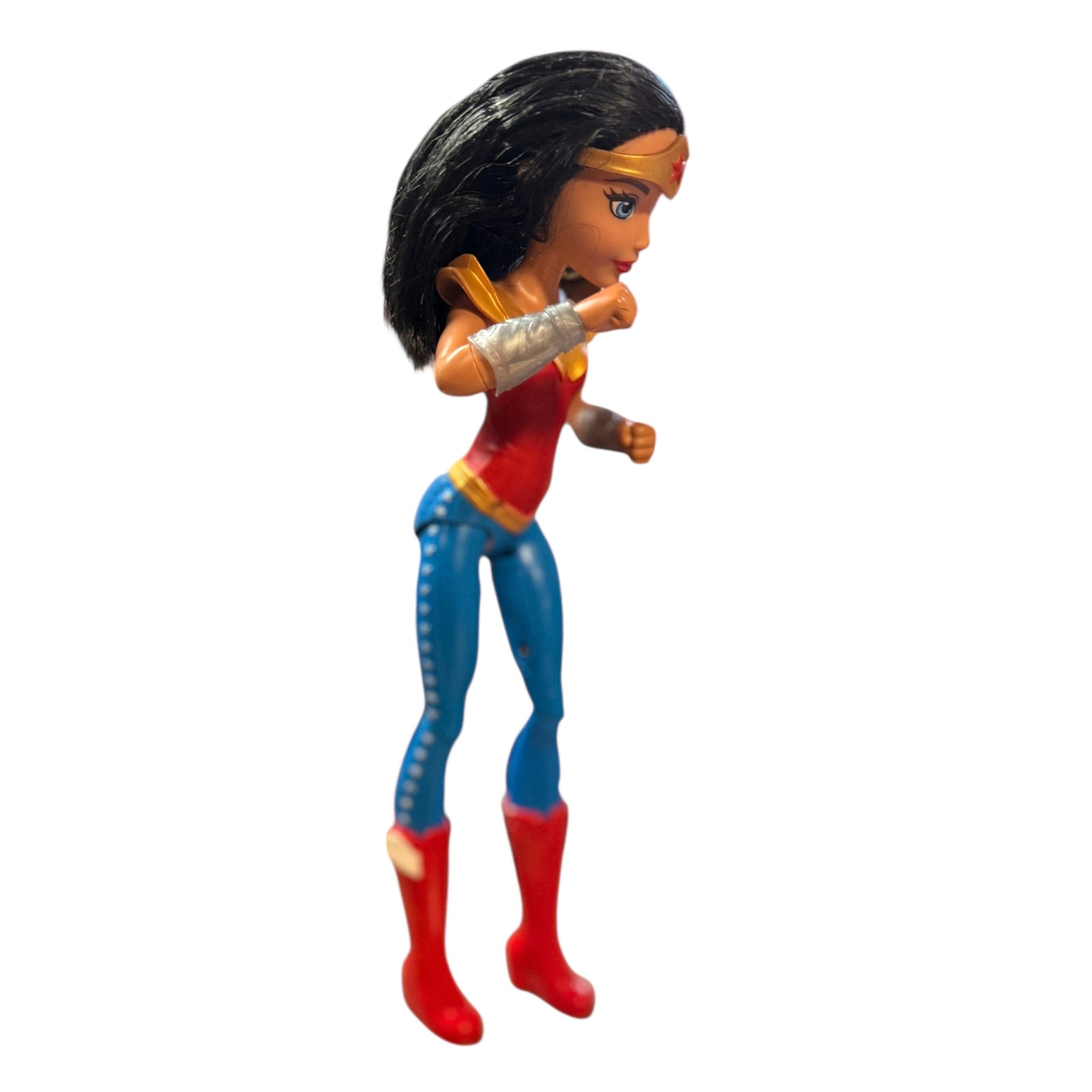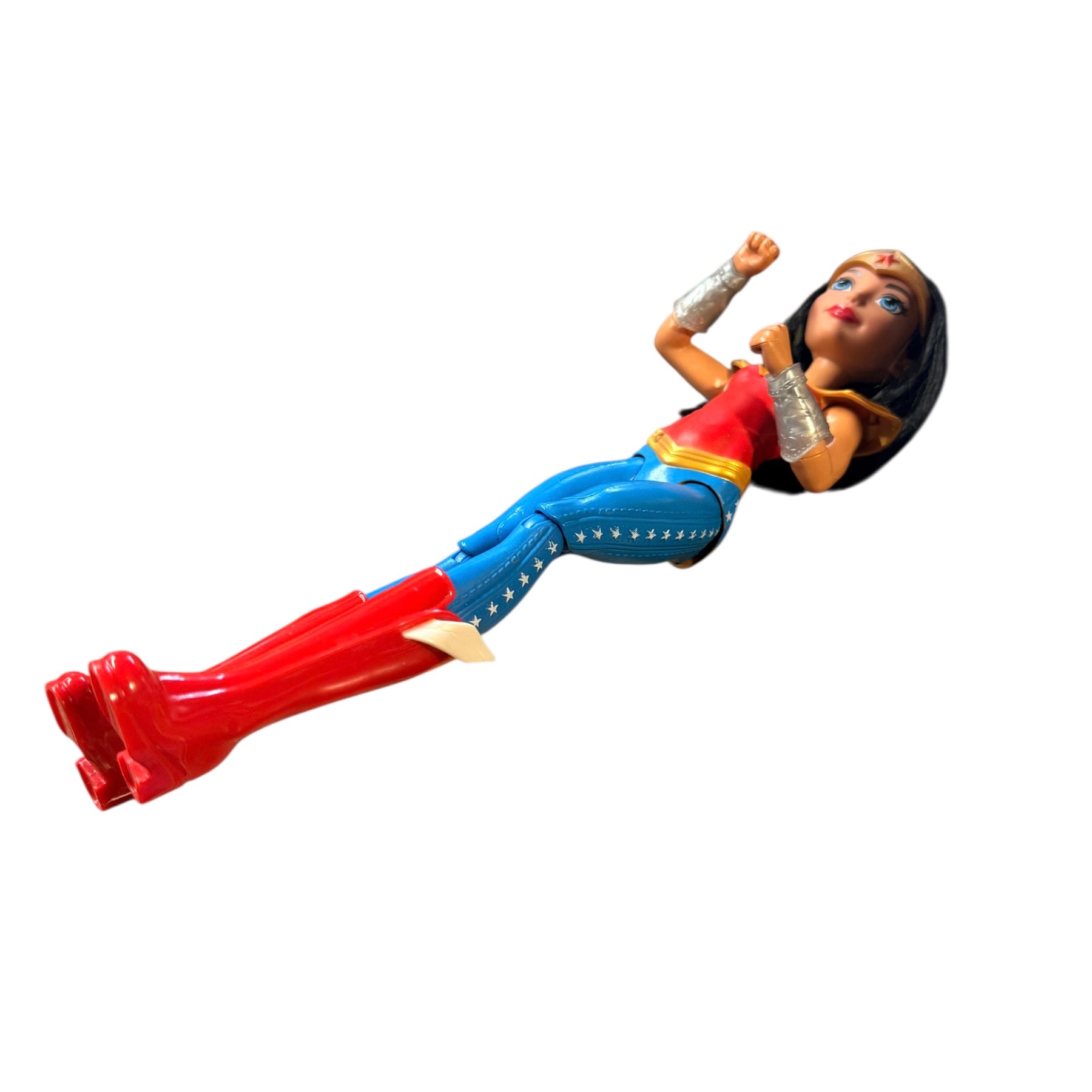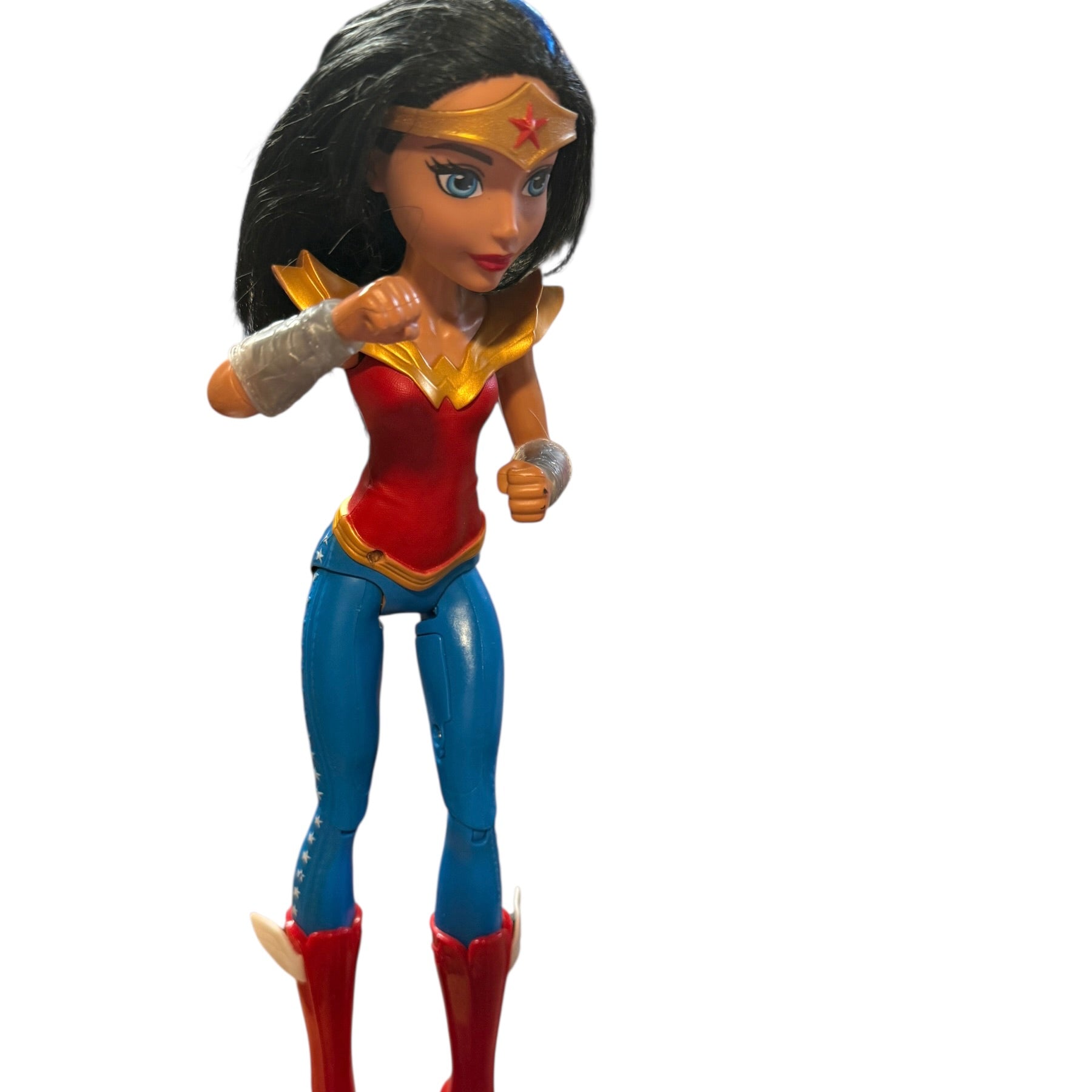 Classic Wonder Woman in a 12" Action Figure Doll with great winged boots, slim blue pants & gold crown complete with red star. She also has arm movements, light up wrist bands, sounds, and she speaks 4 phrases. A lovely doll in great preowned condition.