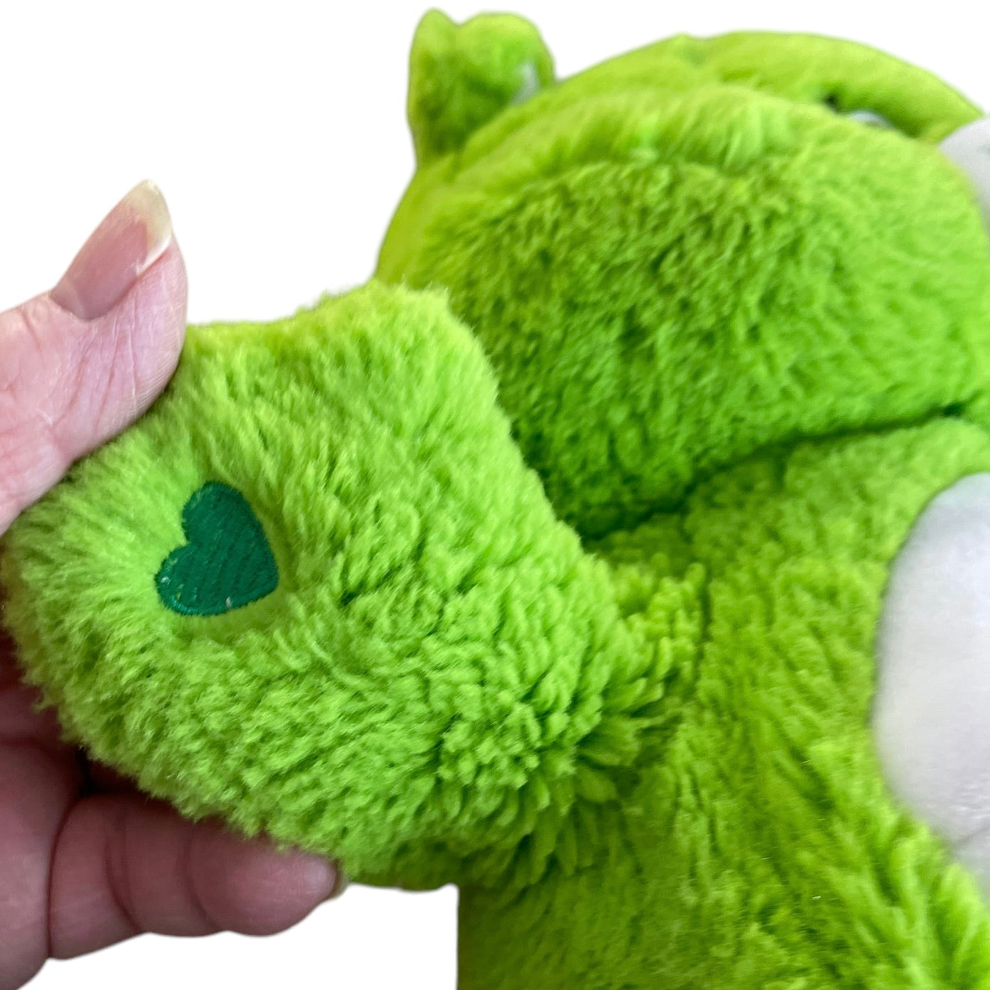 Lucky Shamrock 14" Care Bear with a green heart button nose is bright green has an appliqued shamrock on its chest and hearts on its paws. This sweet, ultra soft bear is in great preowned condition.
