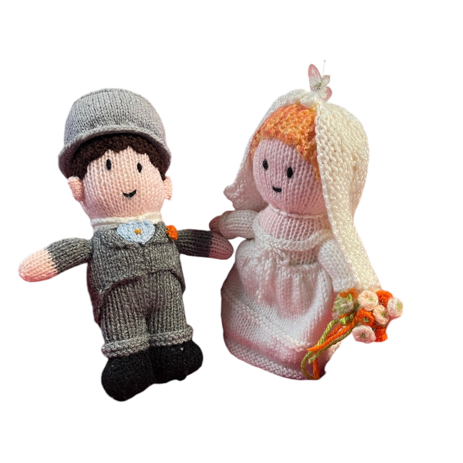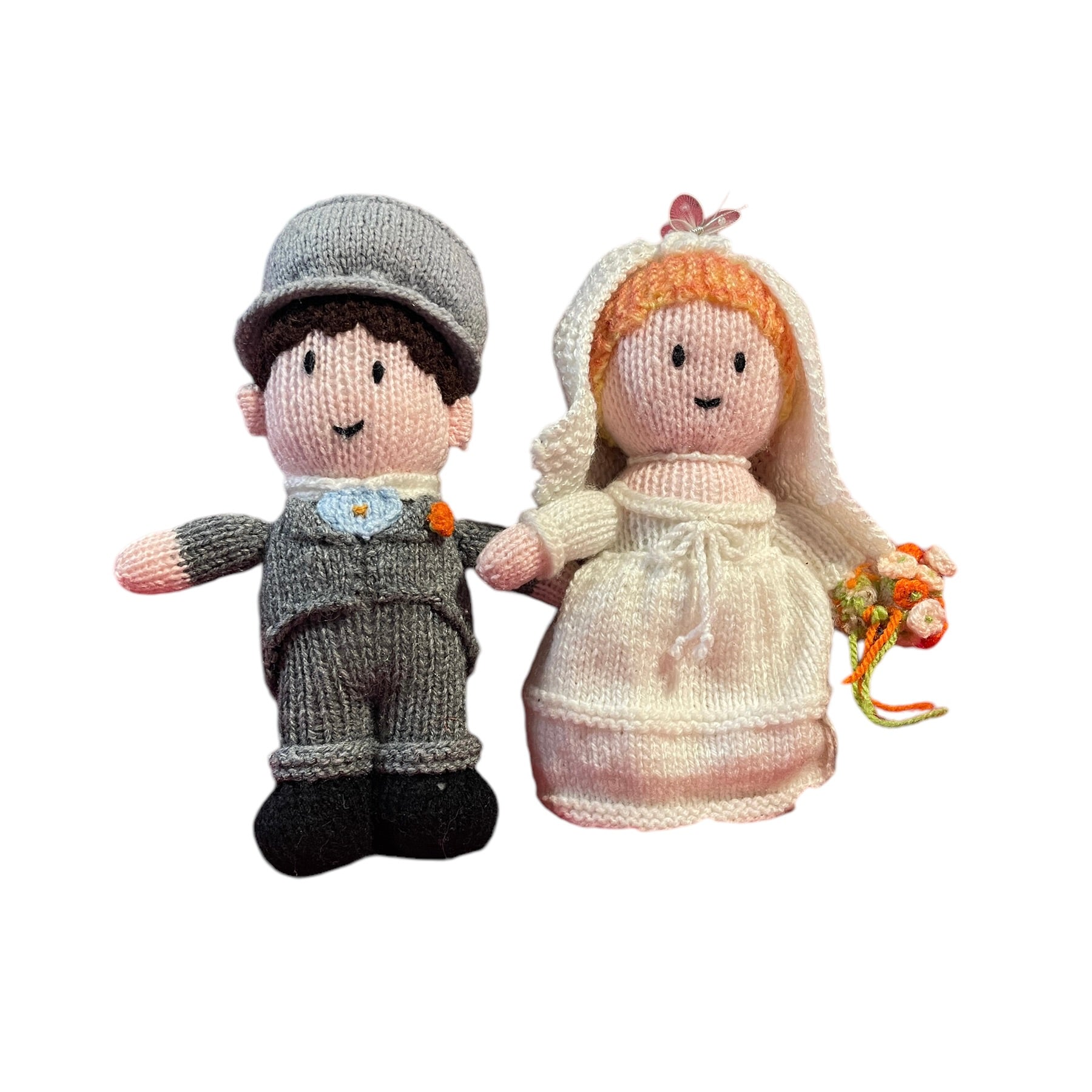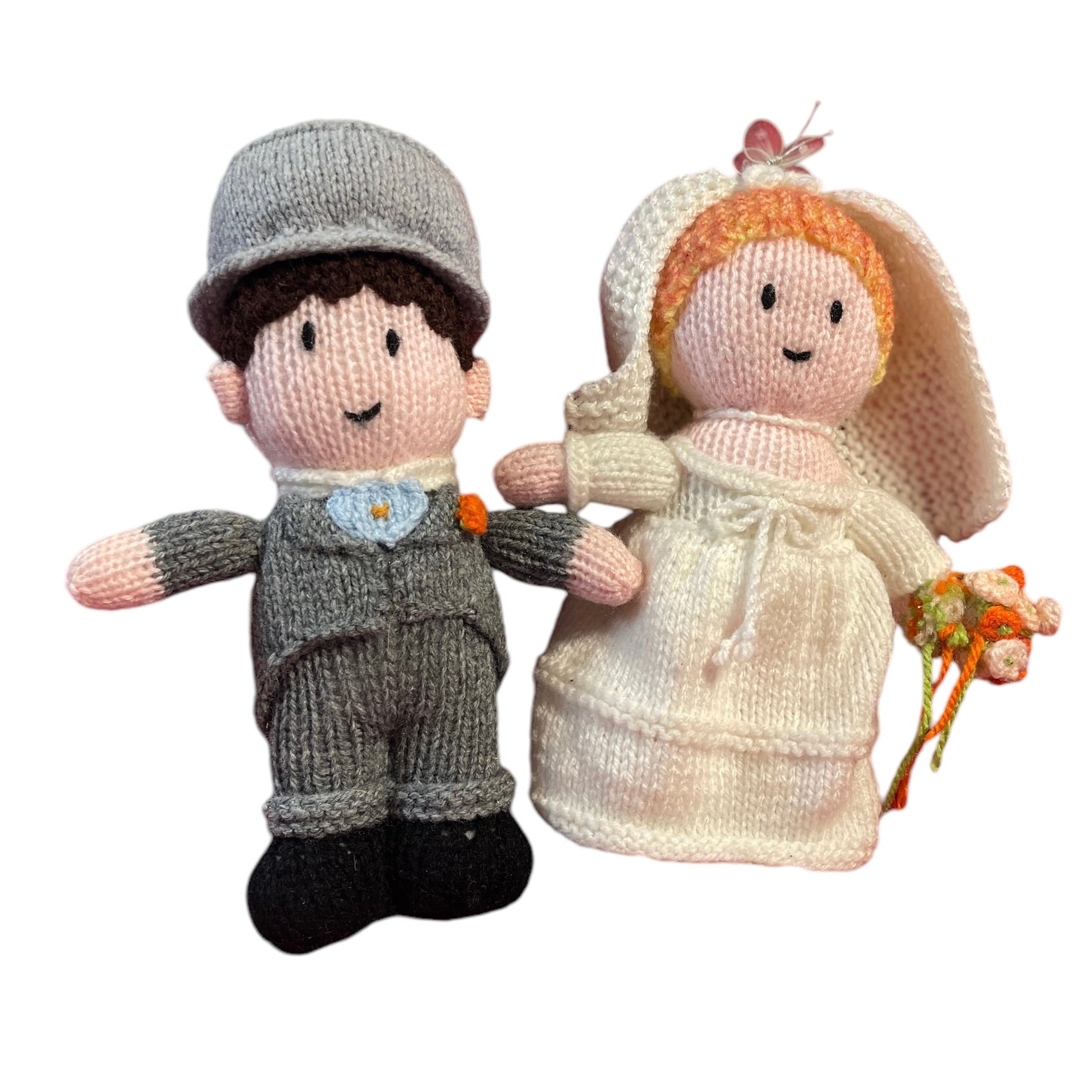 Hand Knit Bride & Groom 9-9.5" Dolls Designed by Jean Greenough , Beautifully Made and in excellent preowned condition.