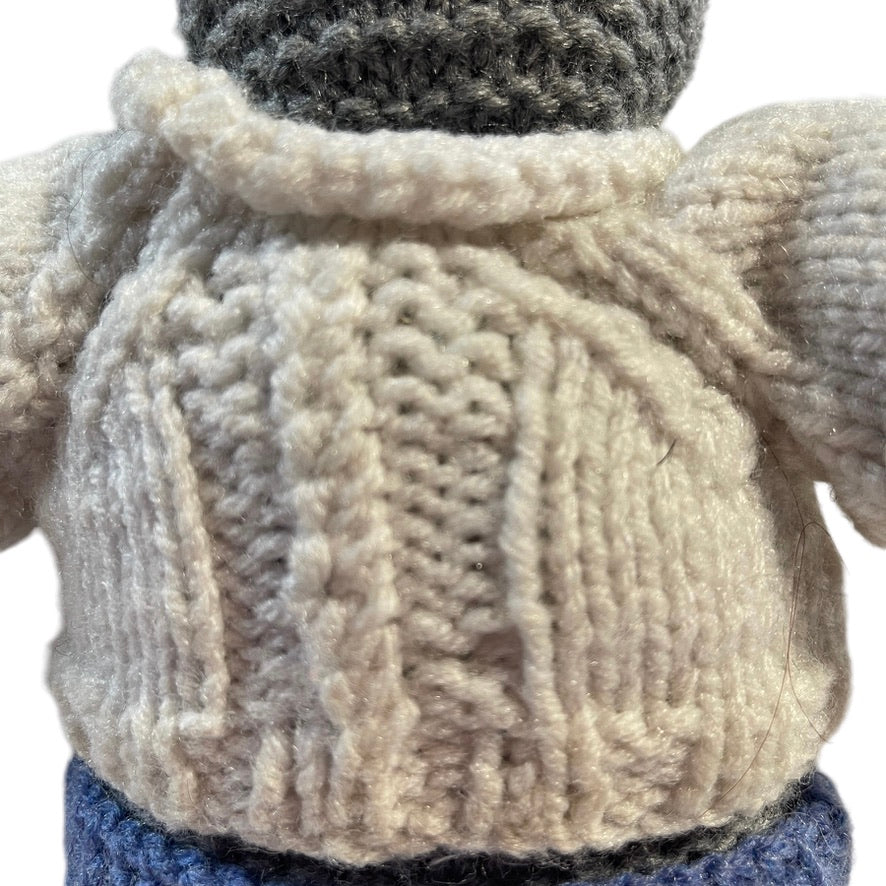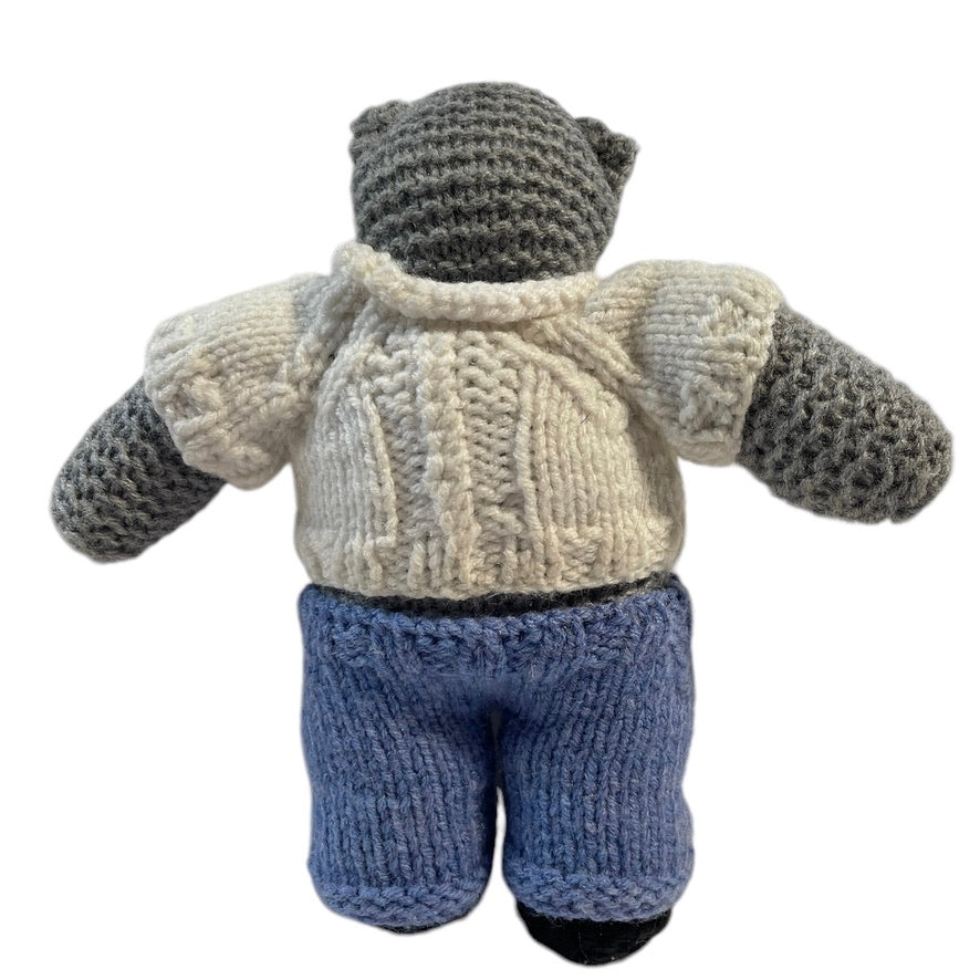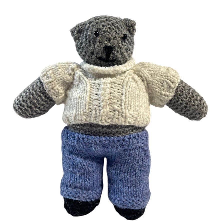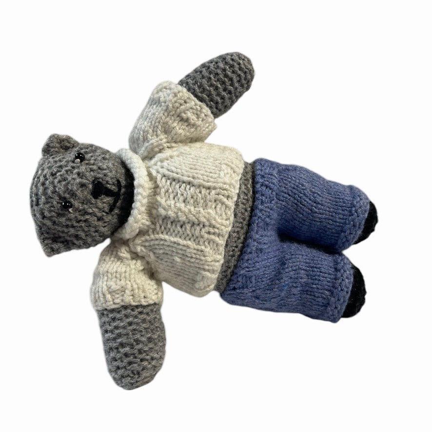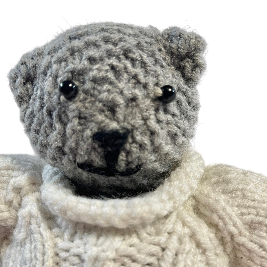Hand Knitted/Crocheted Overstuffed 9.5" Grey Bear in Cream Knit Sweater and Blue Knit 'Jeans'