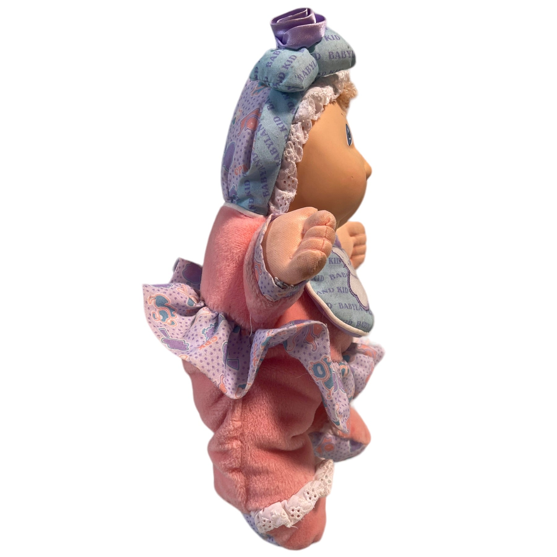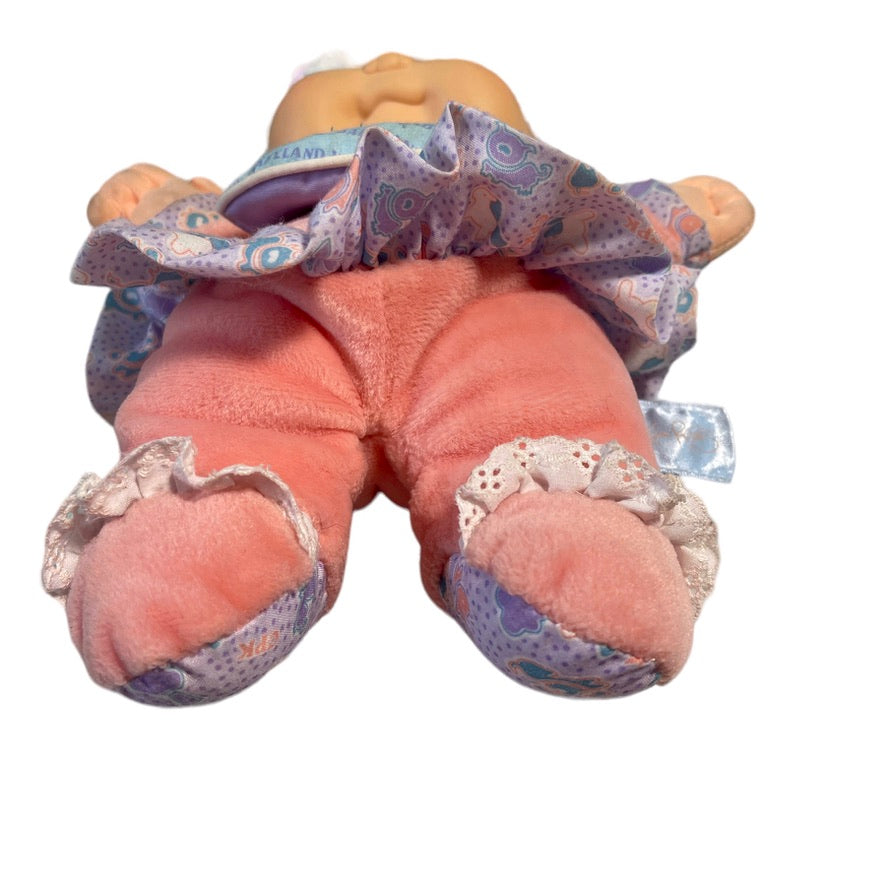 Sweet Cabbage Patch Vintage 1988 Baby Doll with ruffled skirt and rattle bib. Blond, blue eyed and adorable! Purple satin rose on her ruffled cap. So cute!