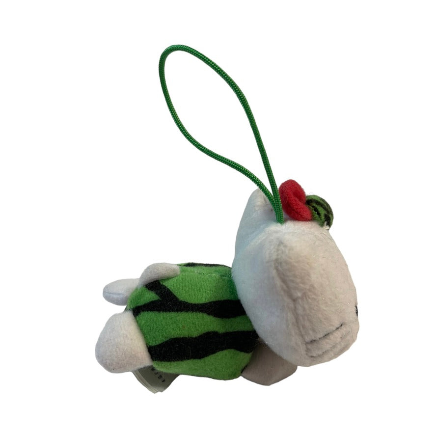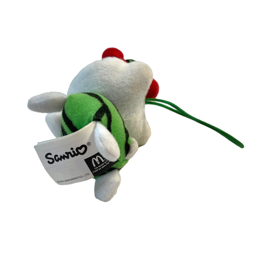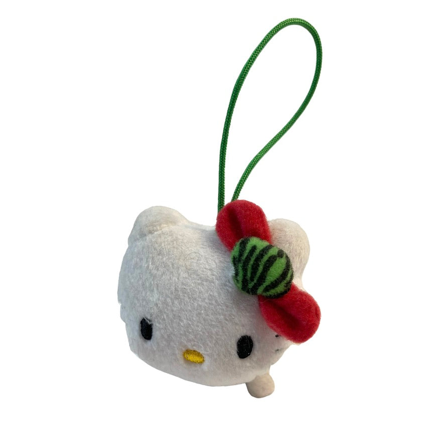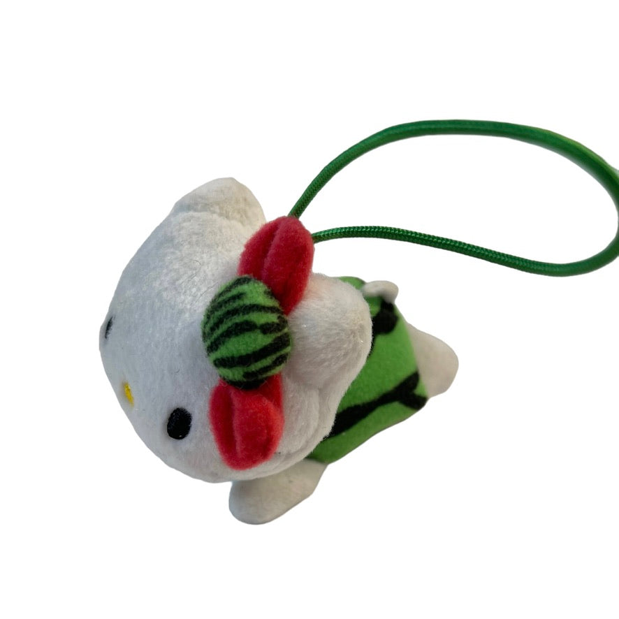 Sweet Hello Kitty 4" Sanrio Plush Dangler with red & green bow and striped green & black shirt. A lovely tiny Hello Kitty for a special collector.