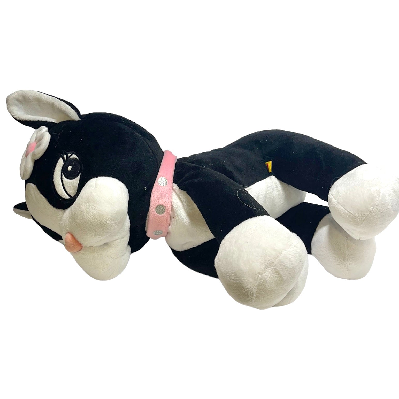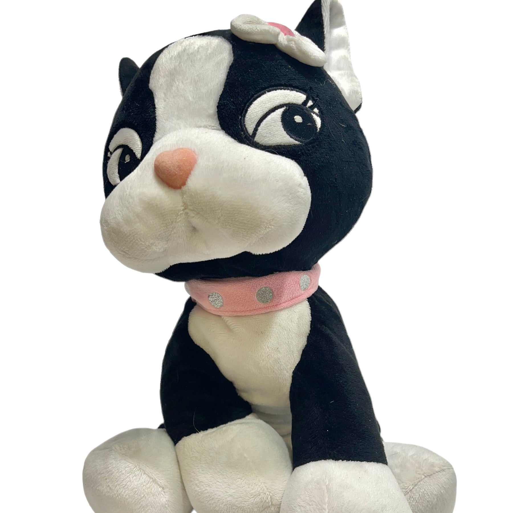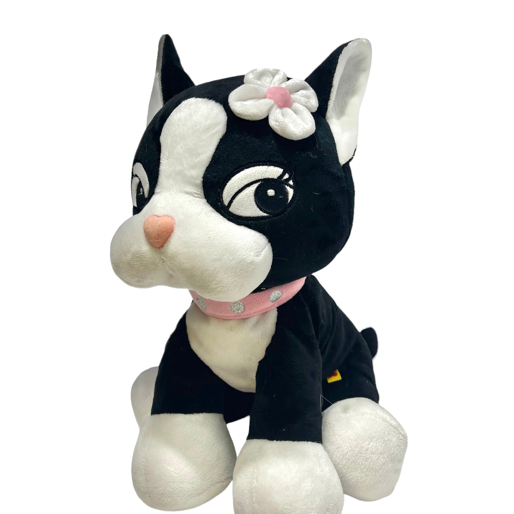 Rebecca BonBon Hello Kitty Sanrio Build a Bear Plush 'Frenchie' French Bulldog with Pink collar embellished with shiny silver dots. Flower embellishment on head. This sweet , hard to find pup is in terrific preloved condition.