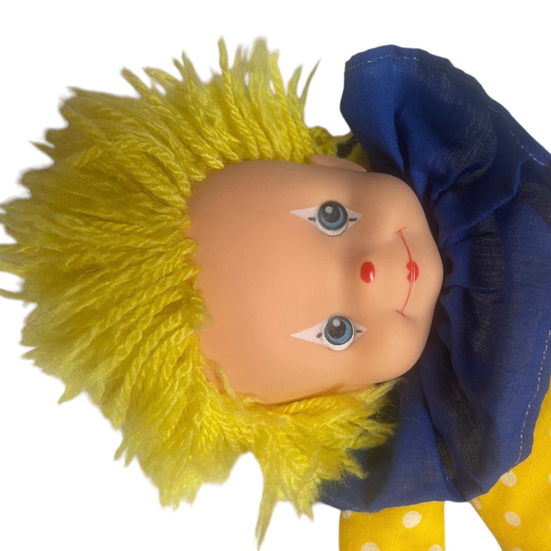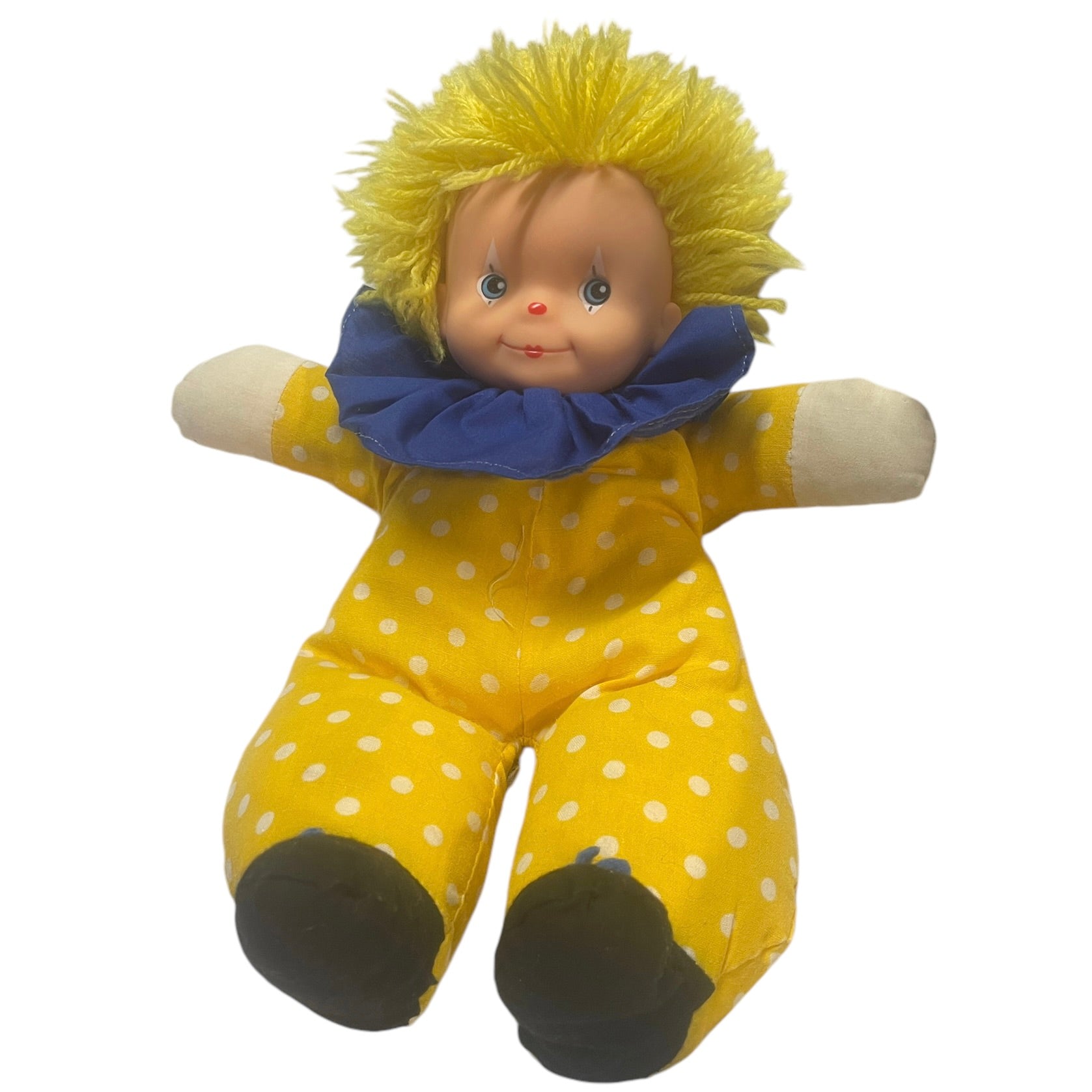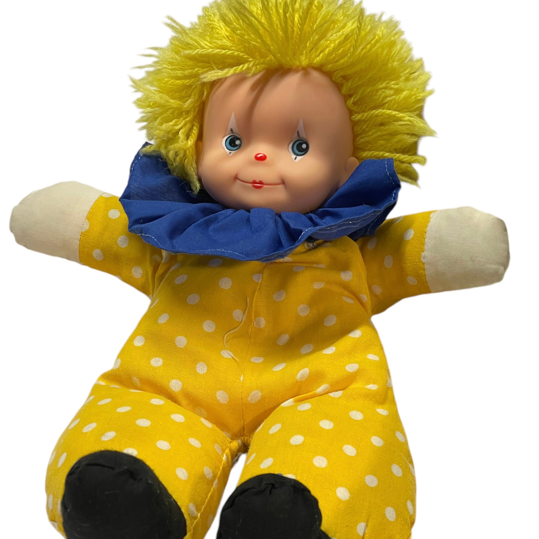 Incredibly sweet handmade 12" plush clown doll has a painted vinyl face and is in very good preowned vintage condition .This cuddly baby doll has a lovely painted face with bright blue eyes. A really lovely toy!