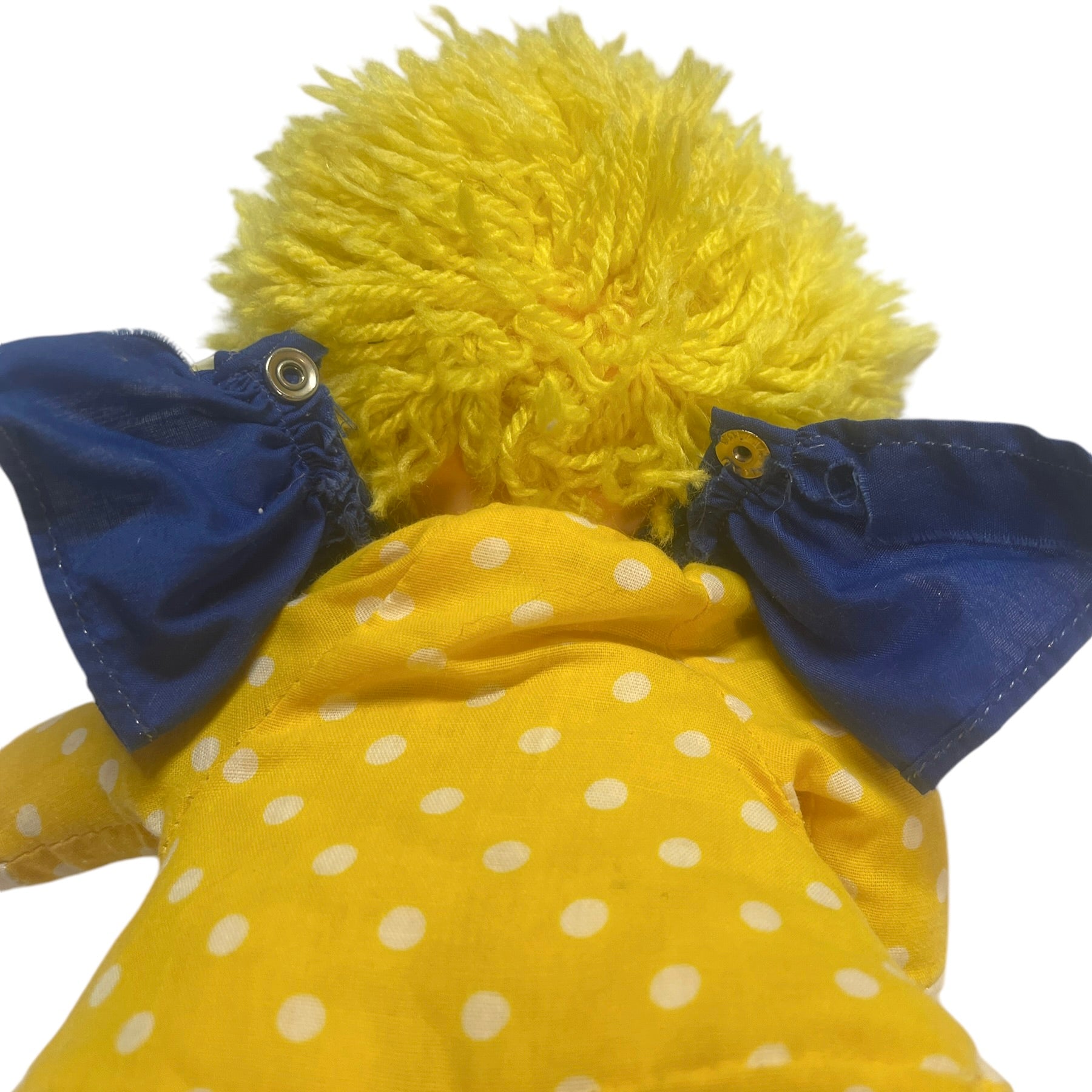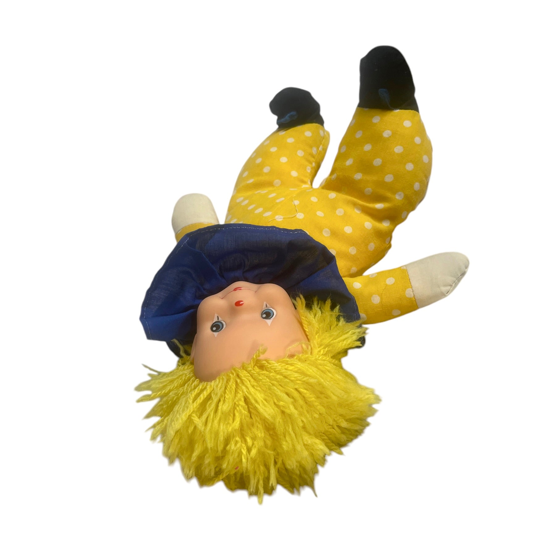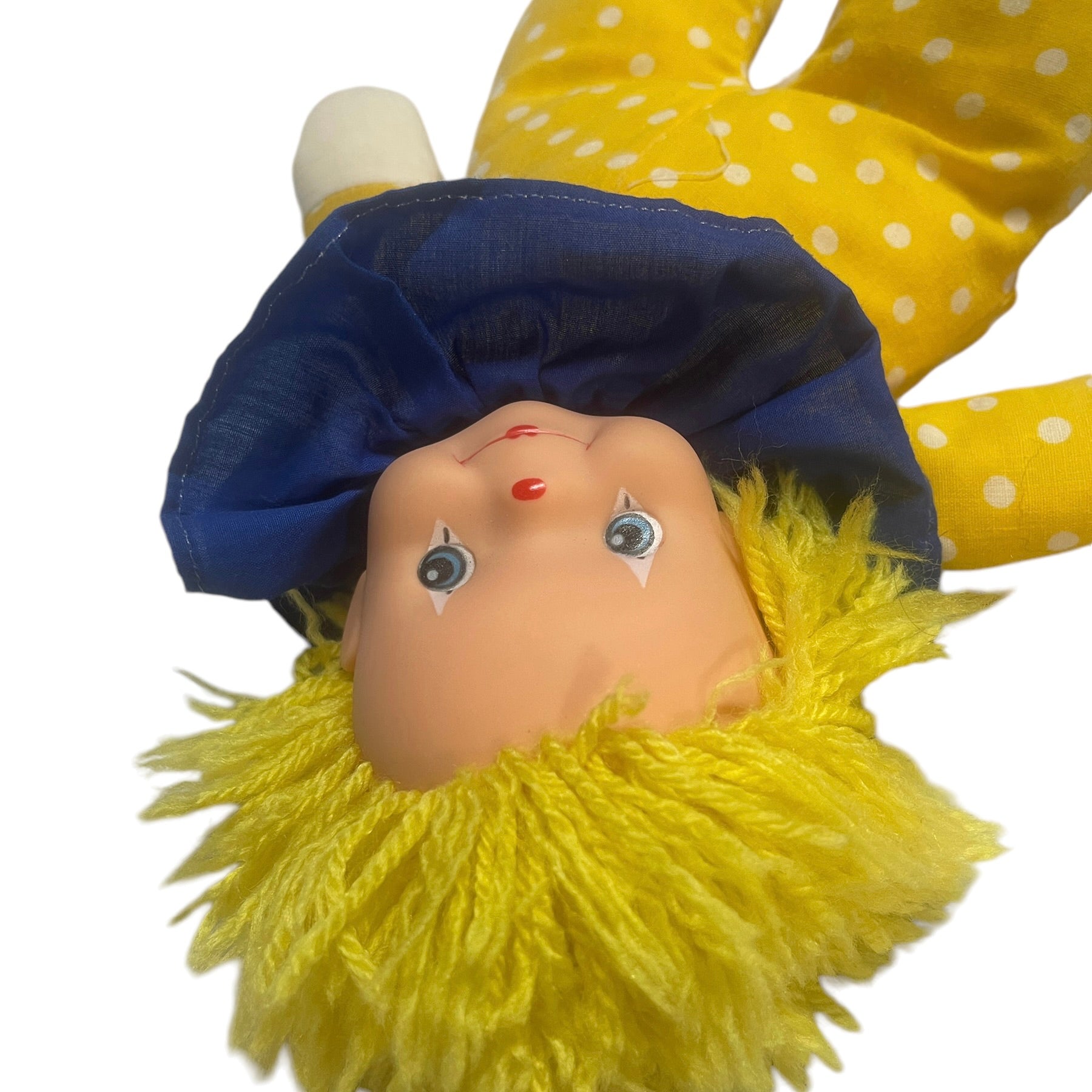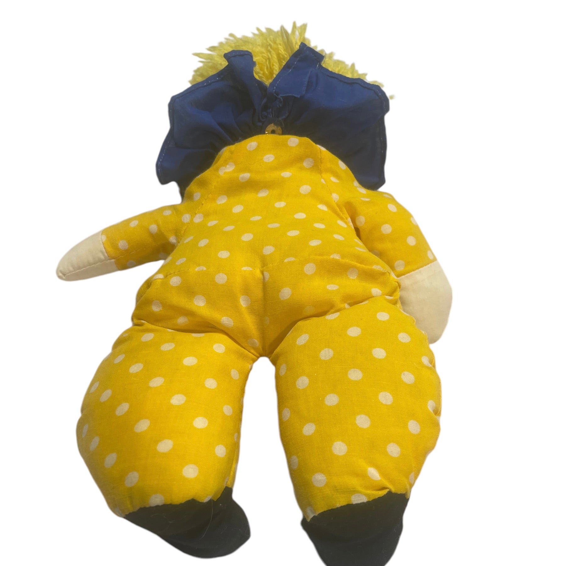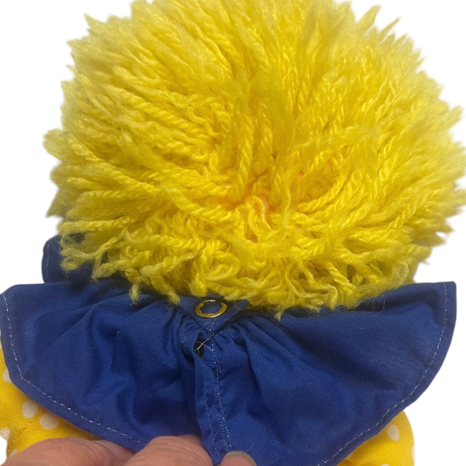 Handmade Vintage Plush Clown, Doll, Yellow Yarn Hair & Polka Dot Body with Navy Accents GUC