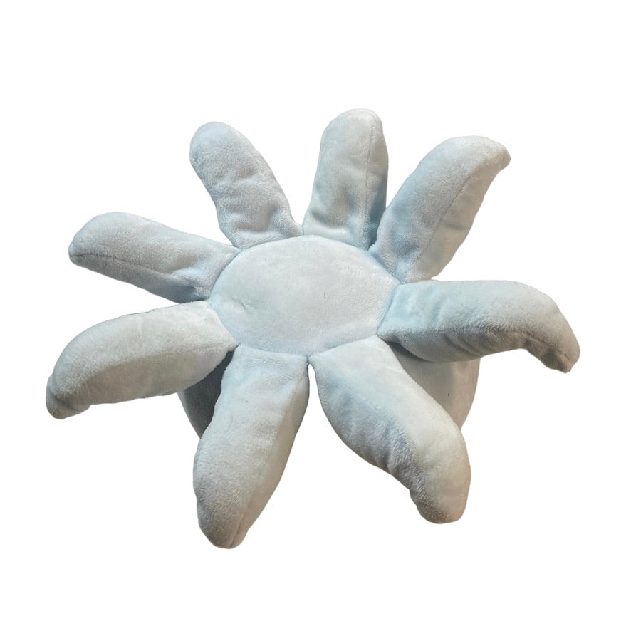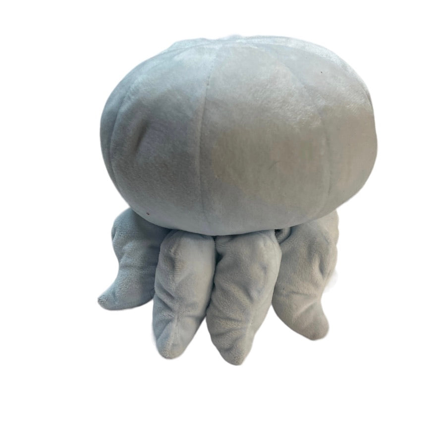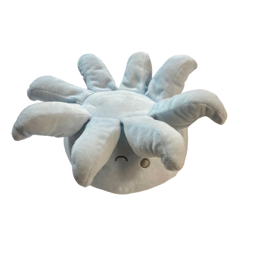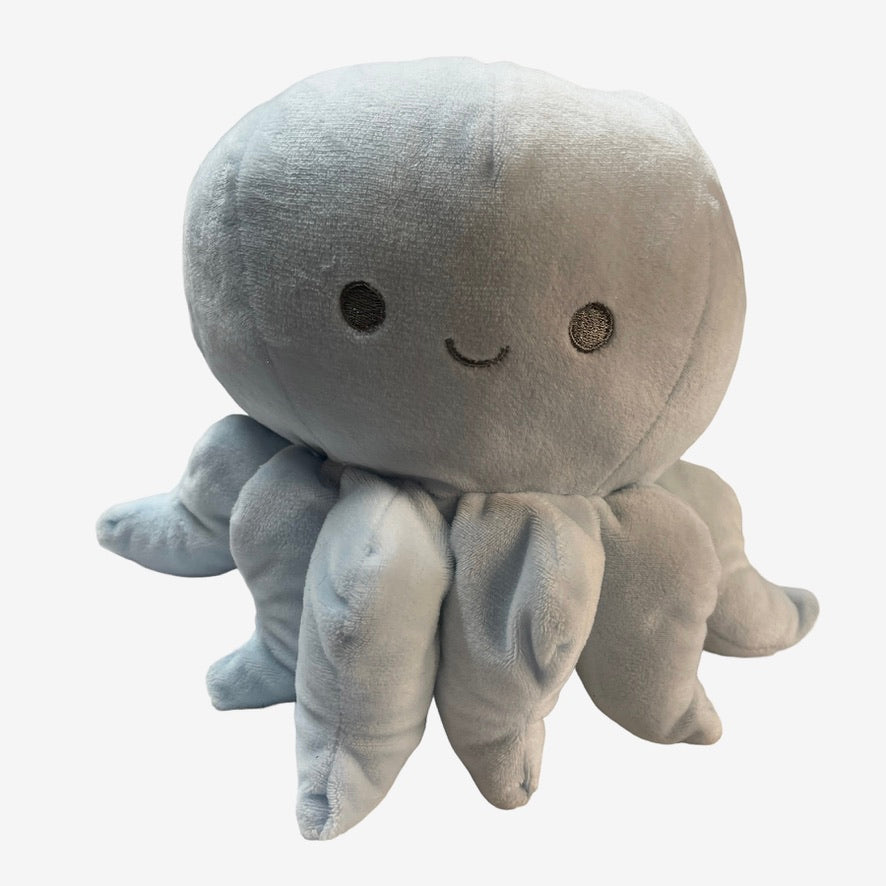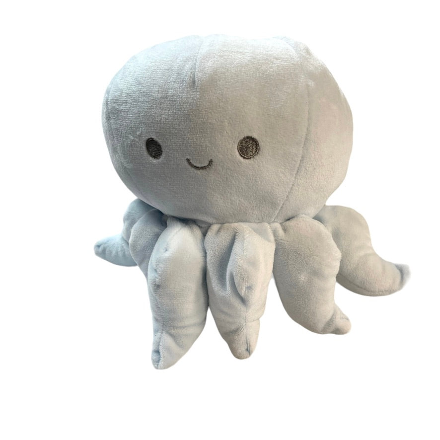Adorable icy blue cuddly stuffed octopus rattle with 8 tentacles and a happy, embroidered face. A very special preloved toy, no tag.
