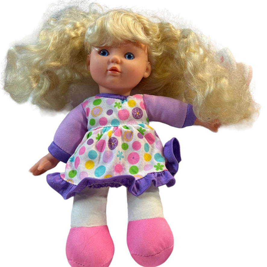 Sweet Baby Doll, Kid's Connection 12" Soft bodied doll with Luxurious Blond hair and Cheerful Pink and Purple Polka Dots! Good Used Condition.