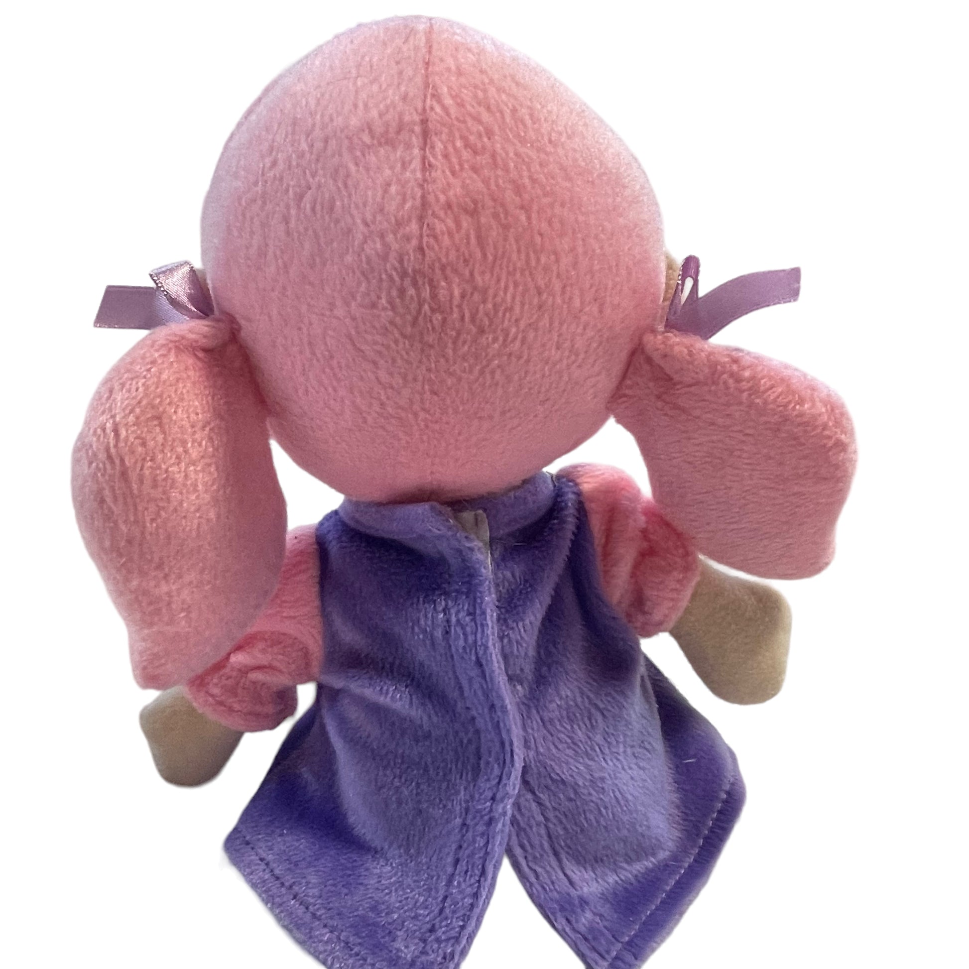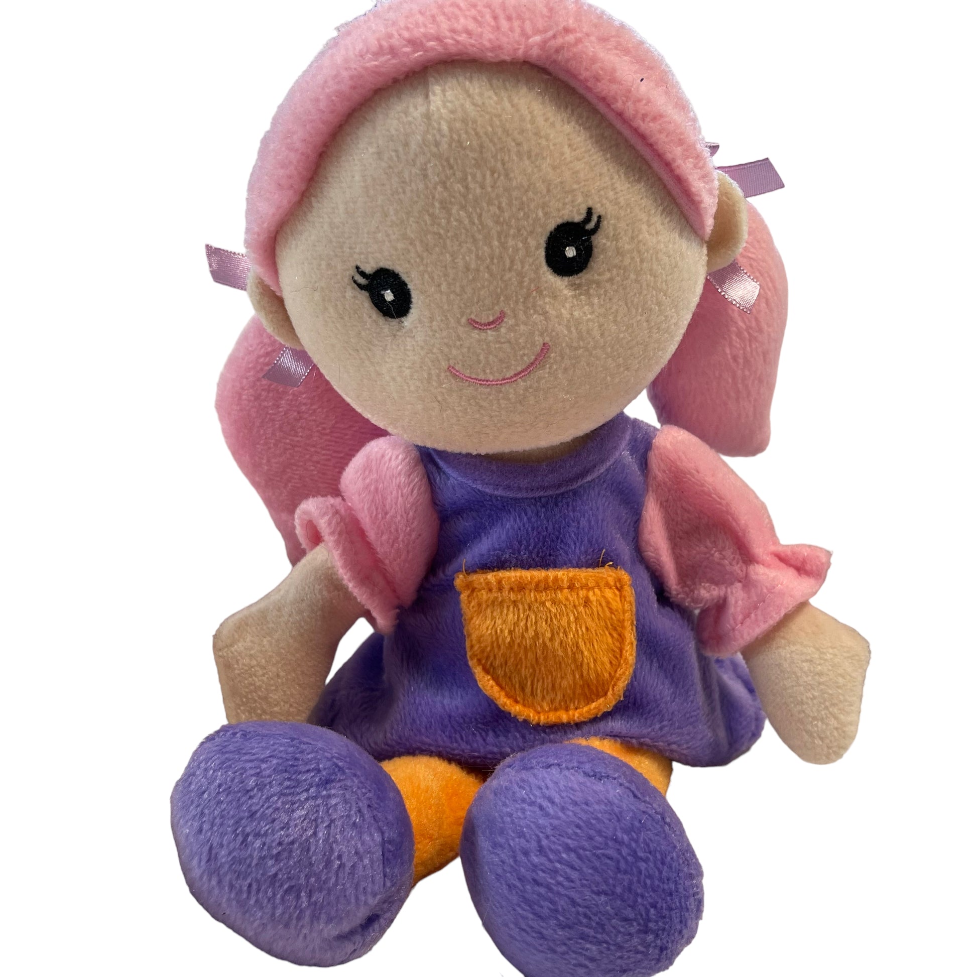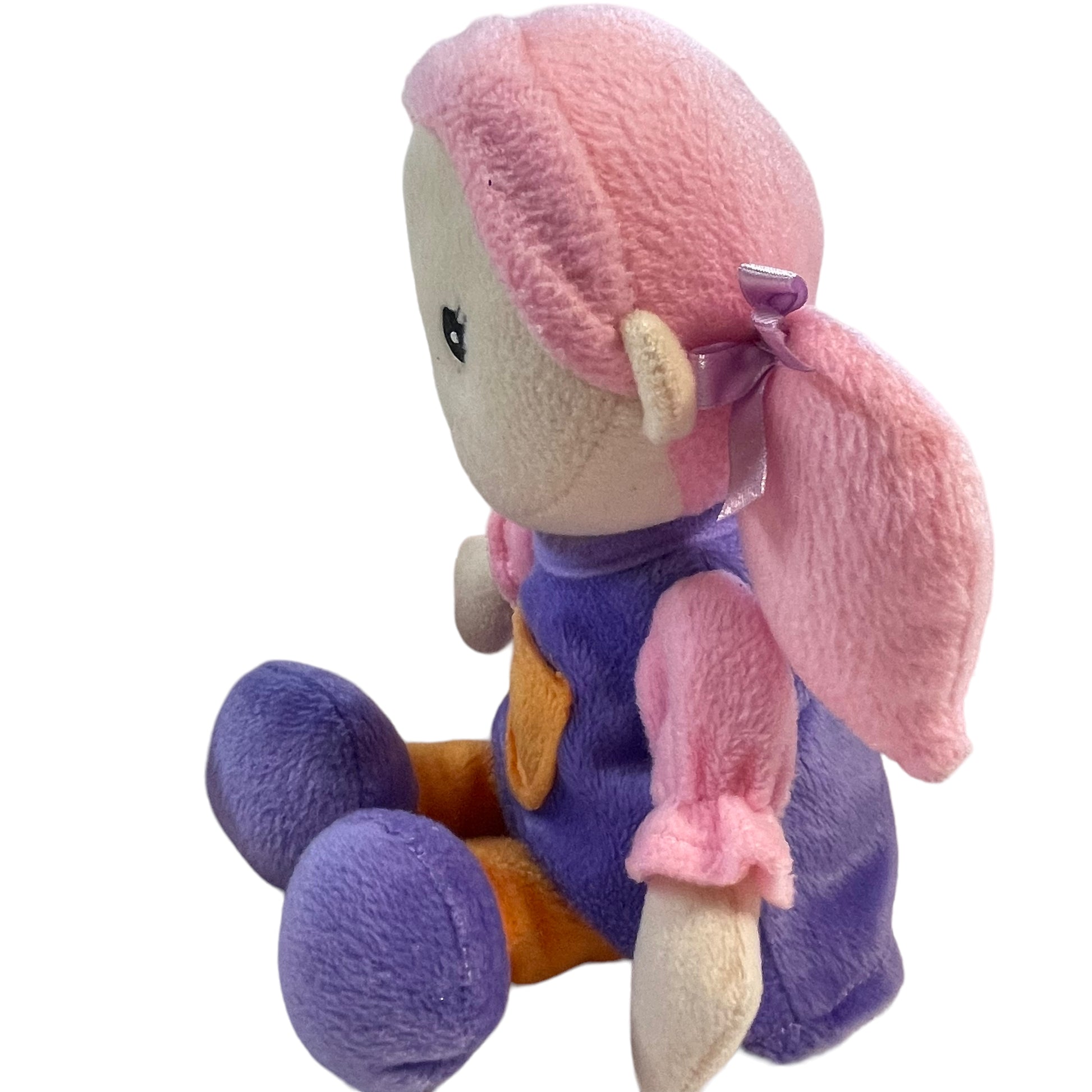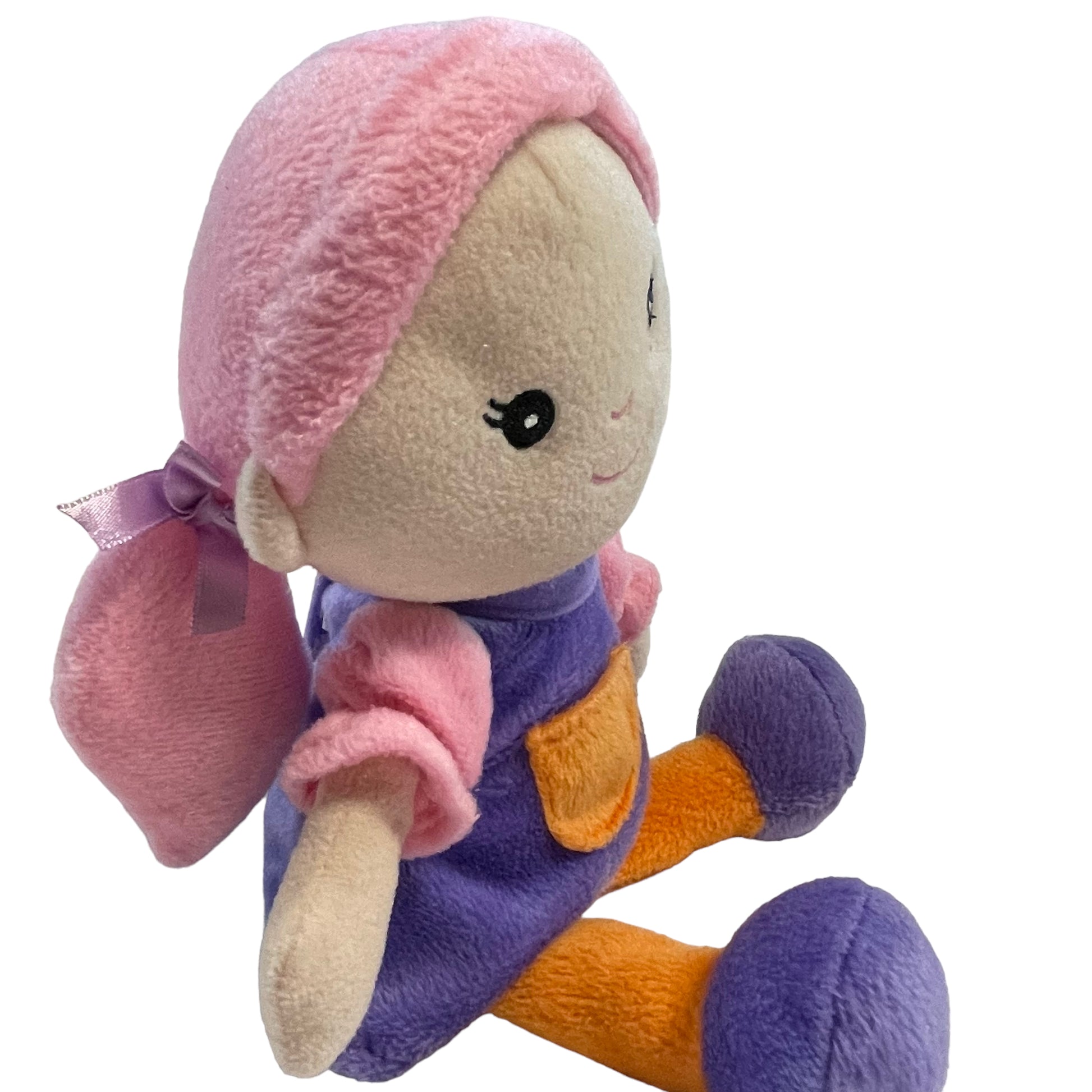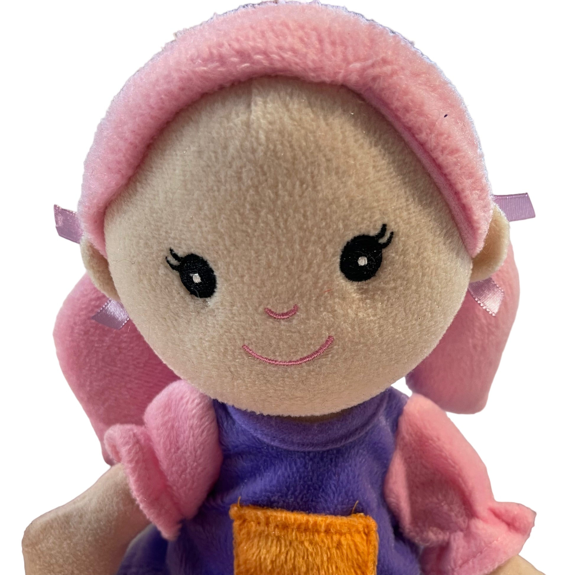 Adorable Brown eyed 12" Rag Doll with pink plush hair and sweet minky outfit in pink/purple and orange. Preowned and gently used.