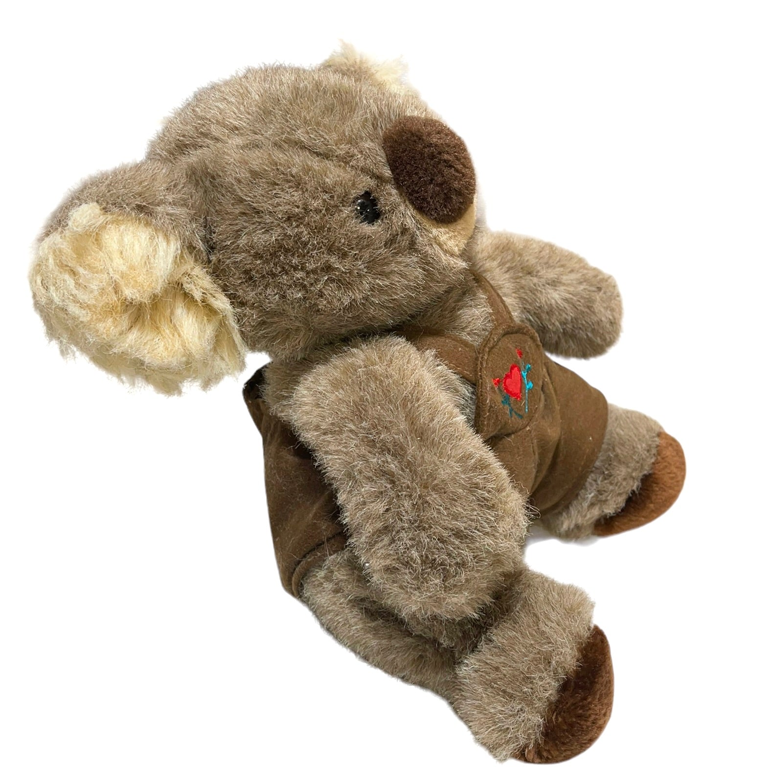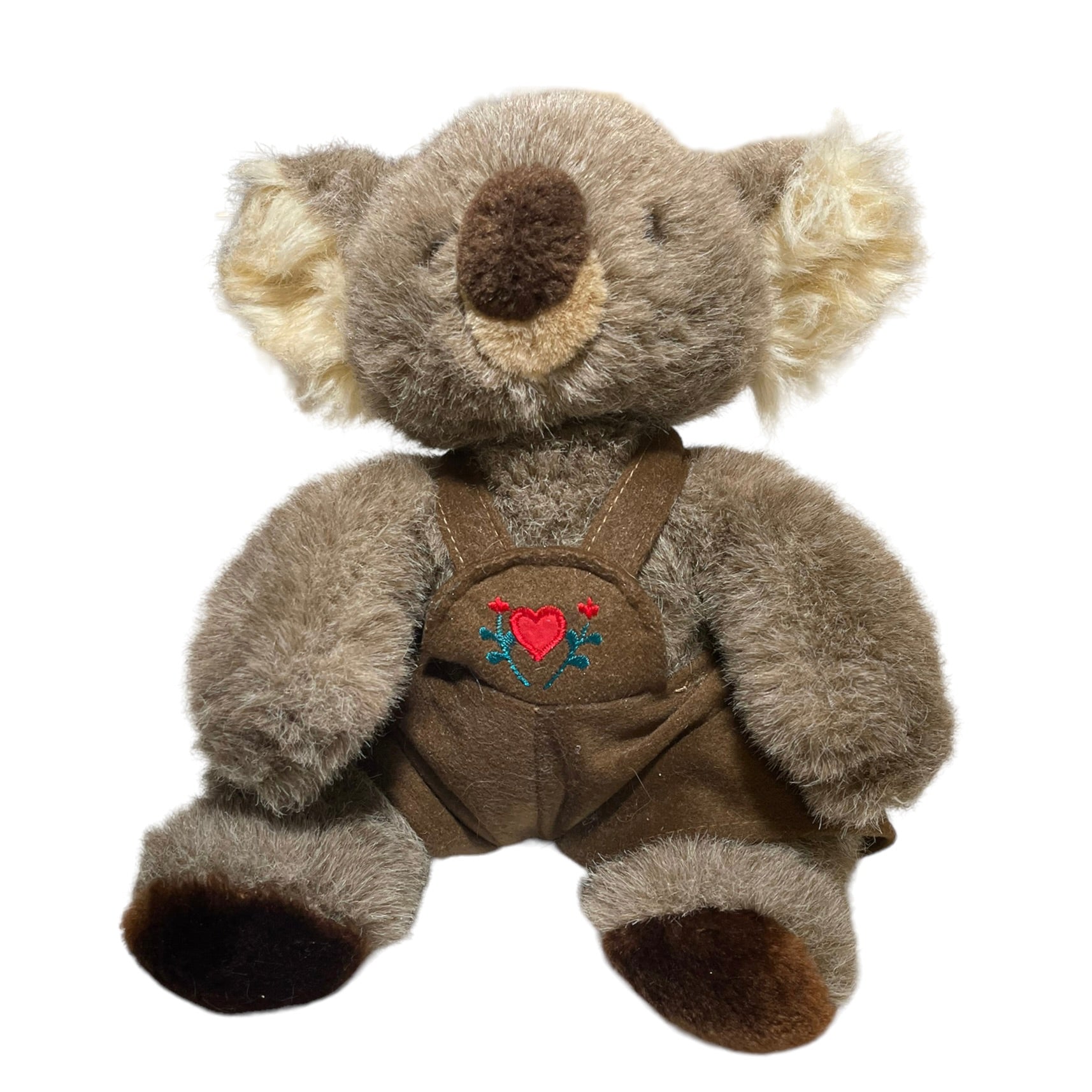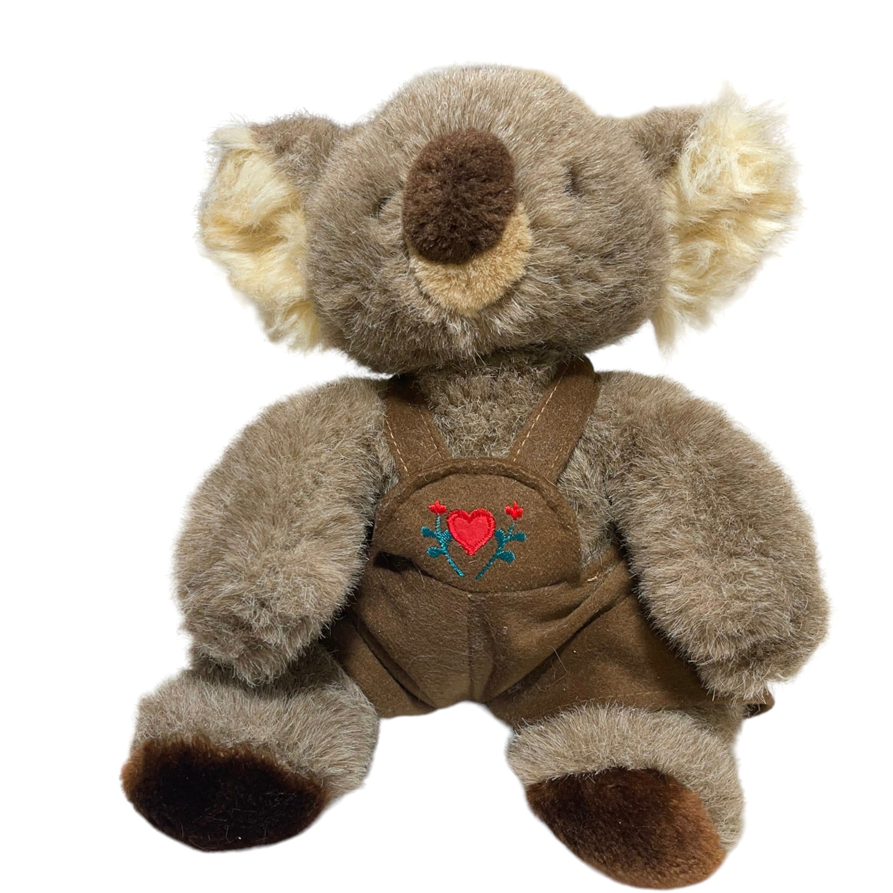 Adorable Vintage 10" Seated Koala Plush, Brown Coveralls with Red Heart & Flowers Applique