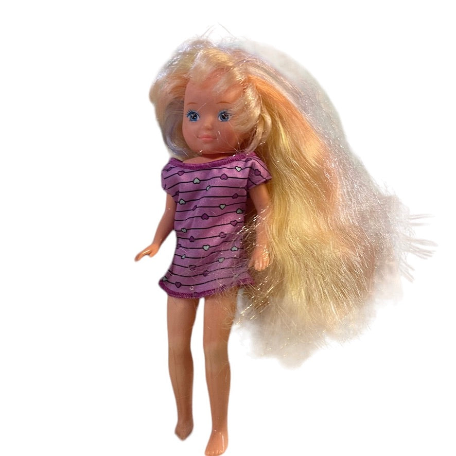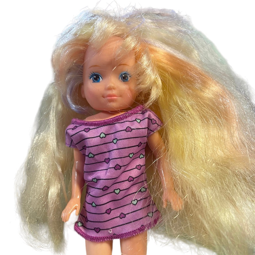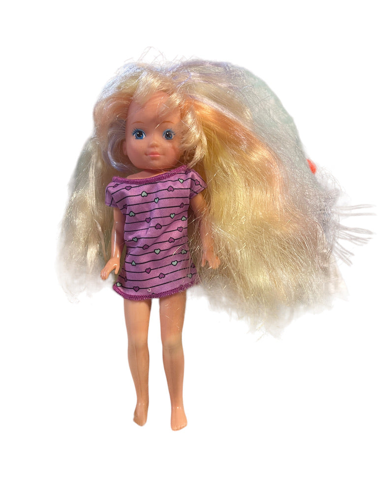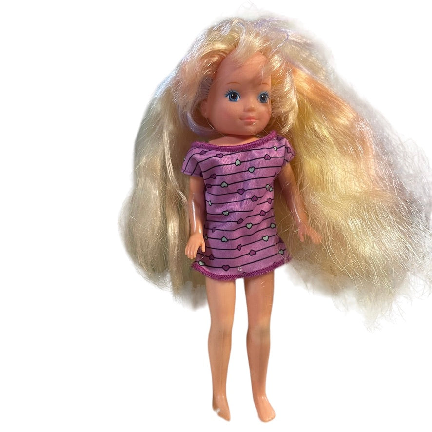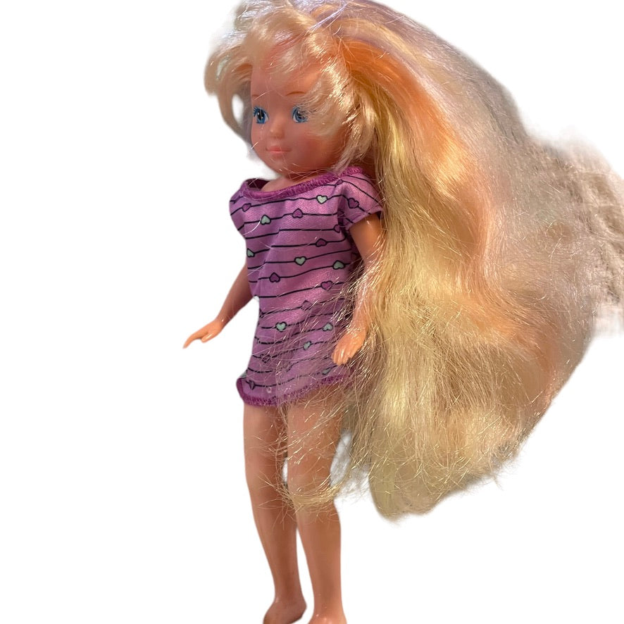In beautiful condition, this pretty vinyl 8" doll has amazing, luxurious blond hair faintly streaked with pastel colours. Wearing s short, purple tunic, this little doll would be a special addition to a vintage doll collection.