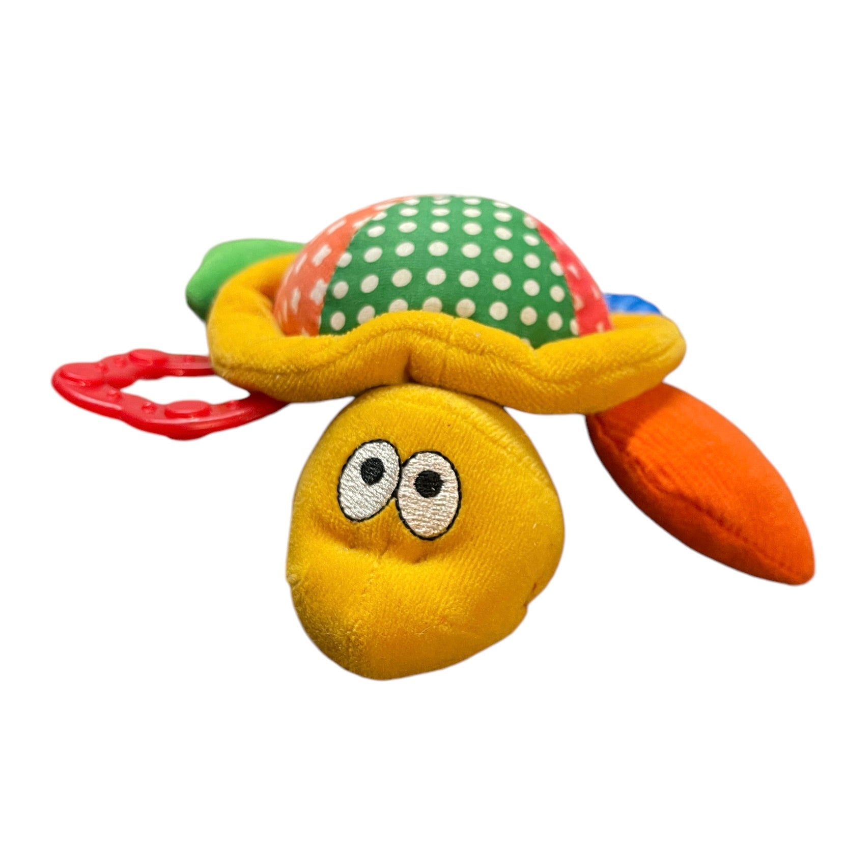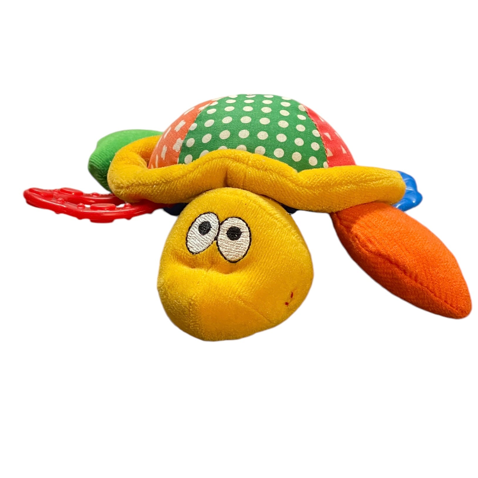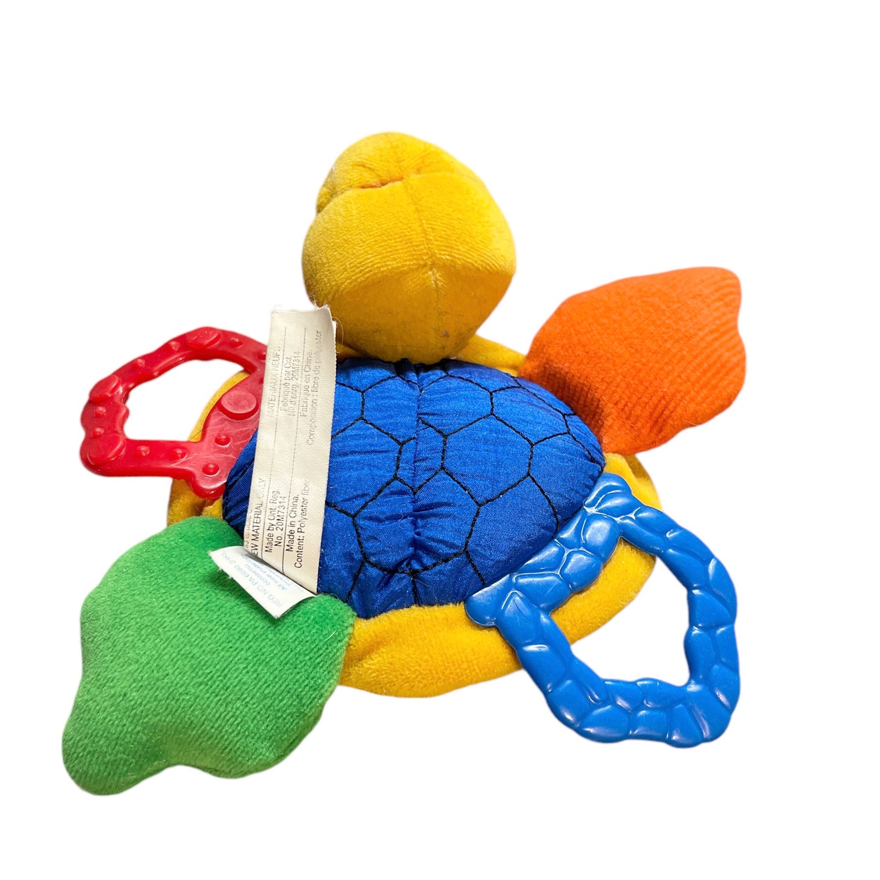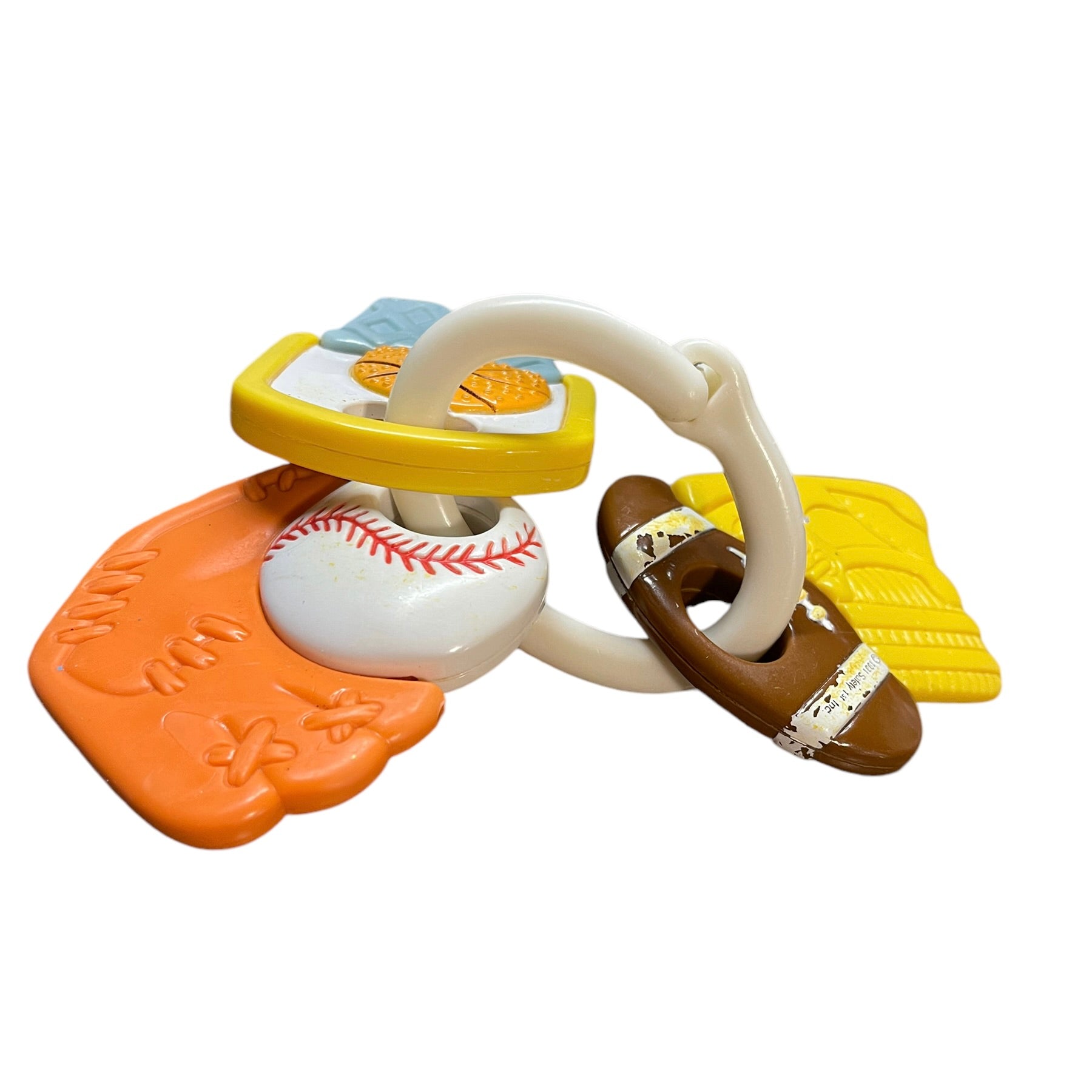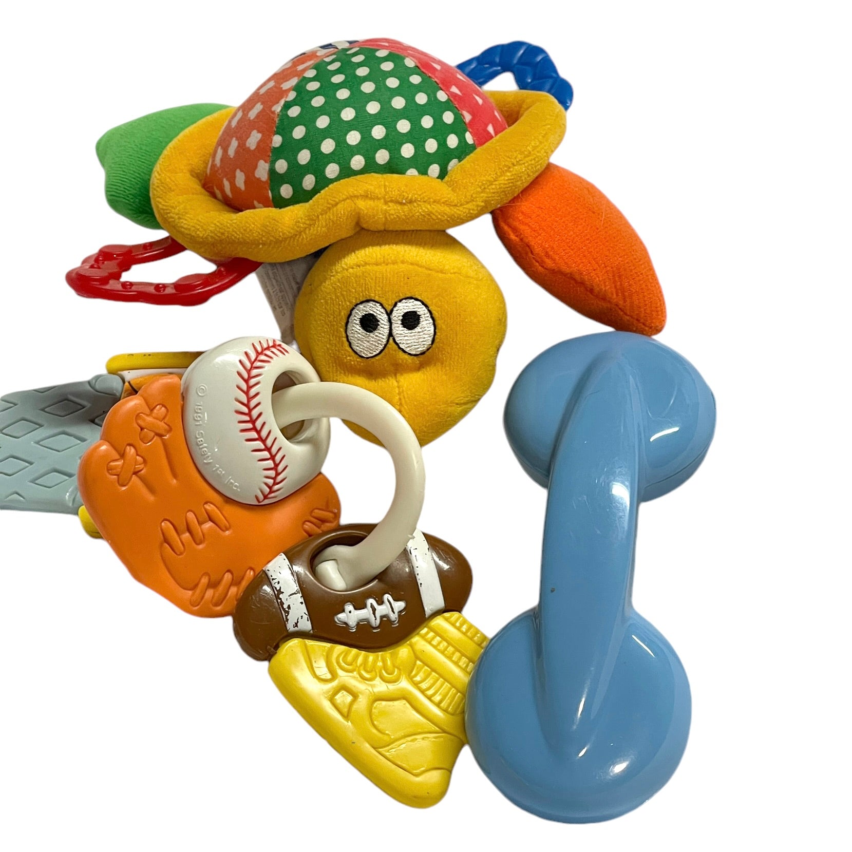 A terrific lot of tried and true baby toys, including vintage telephone receiver rattle with dial for fine motor practice, Safety 1st Rubber Flexible Sports Themed Teether, and a sweet, Vintage Avon Plush Turtle Toy with teether, rattle and crinkle toes! Clean and ready for play!