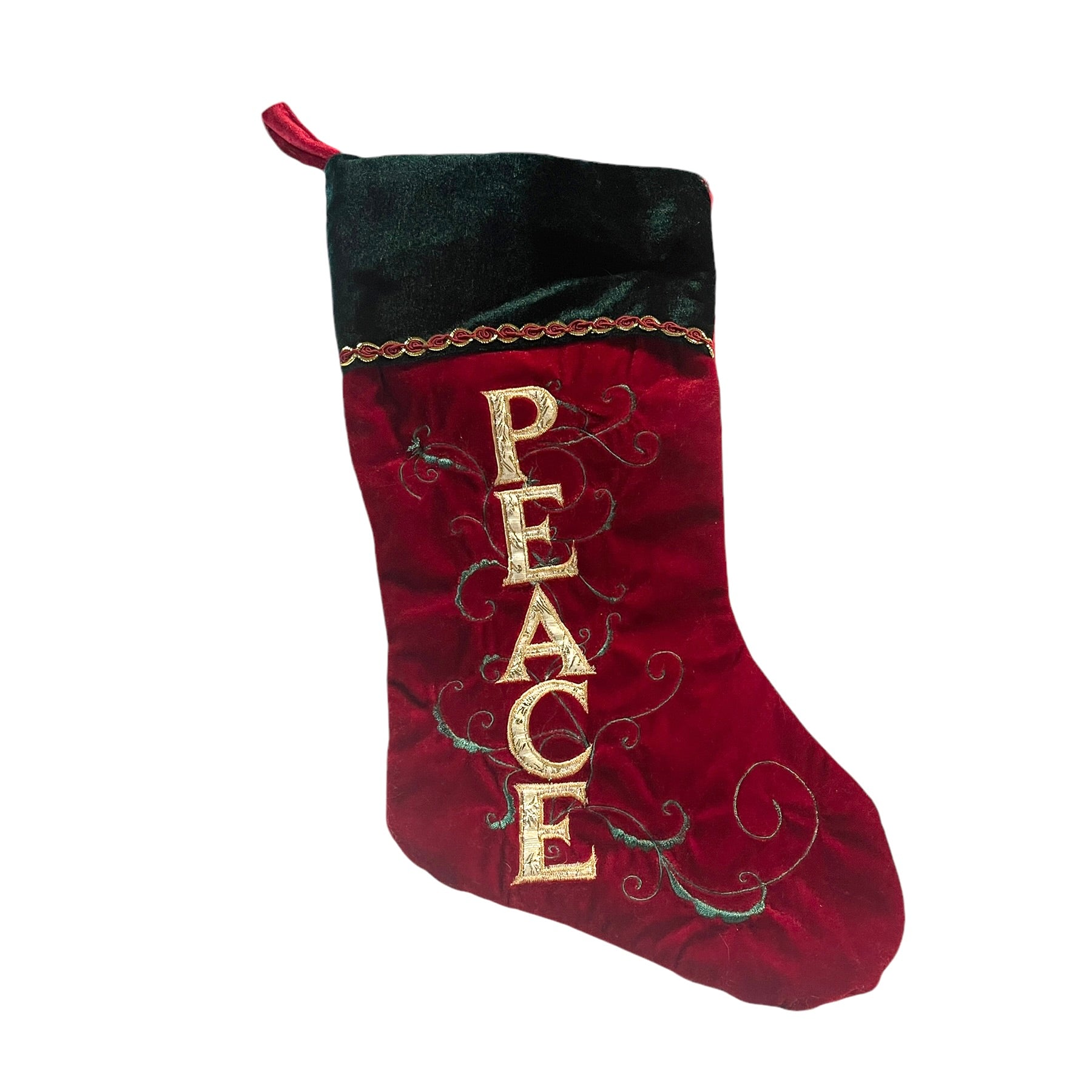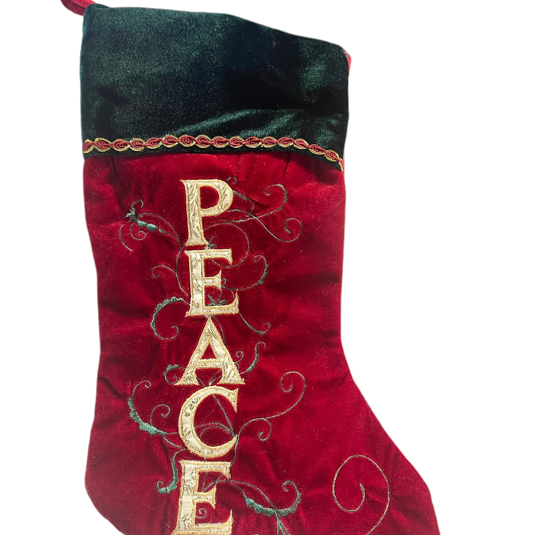 `Lovely Deep Red and Green Velvet Christmas Stocking, delicately embroidered in green, with PEACE spelled out in sparkly gold appliqued letters. Accented in red and gold braid, this lovely stocking will be a beautiful addition to holiday decor.