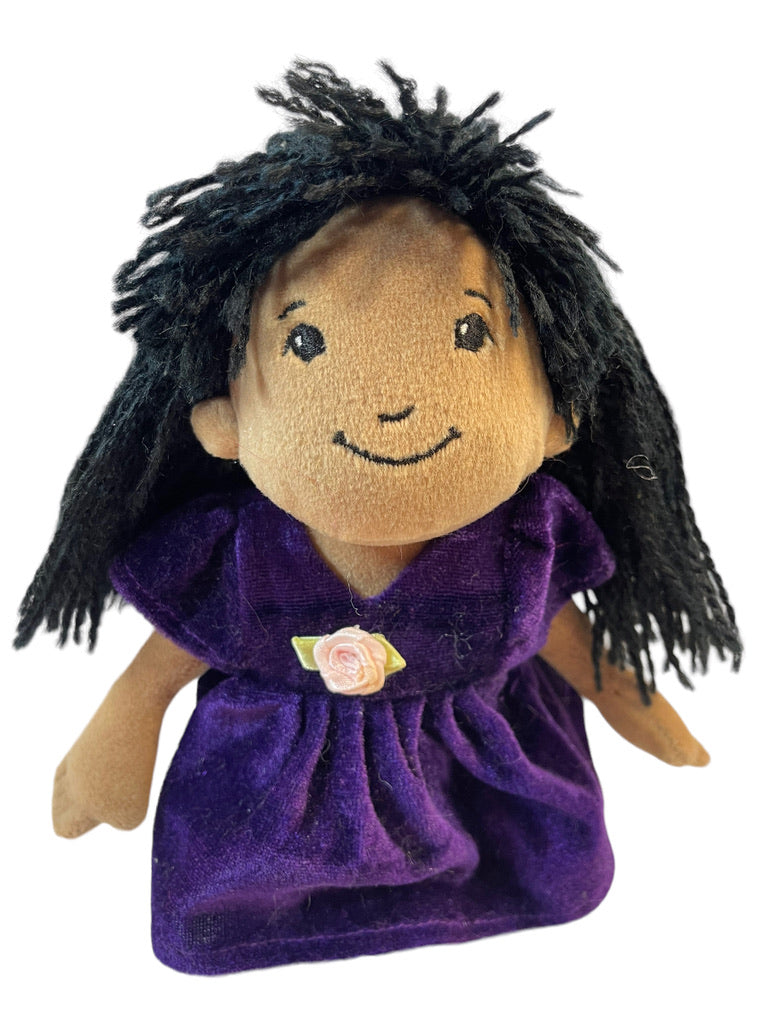 Groovy Kendra is dressed in a purple velvet top embellished with a rosebud . Good used condition. Bottom of one foot has been marked with a 'D'.