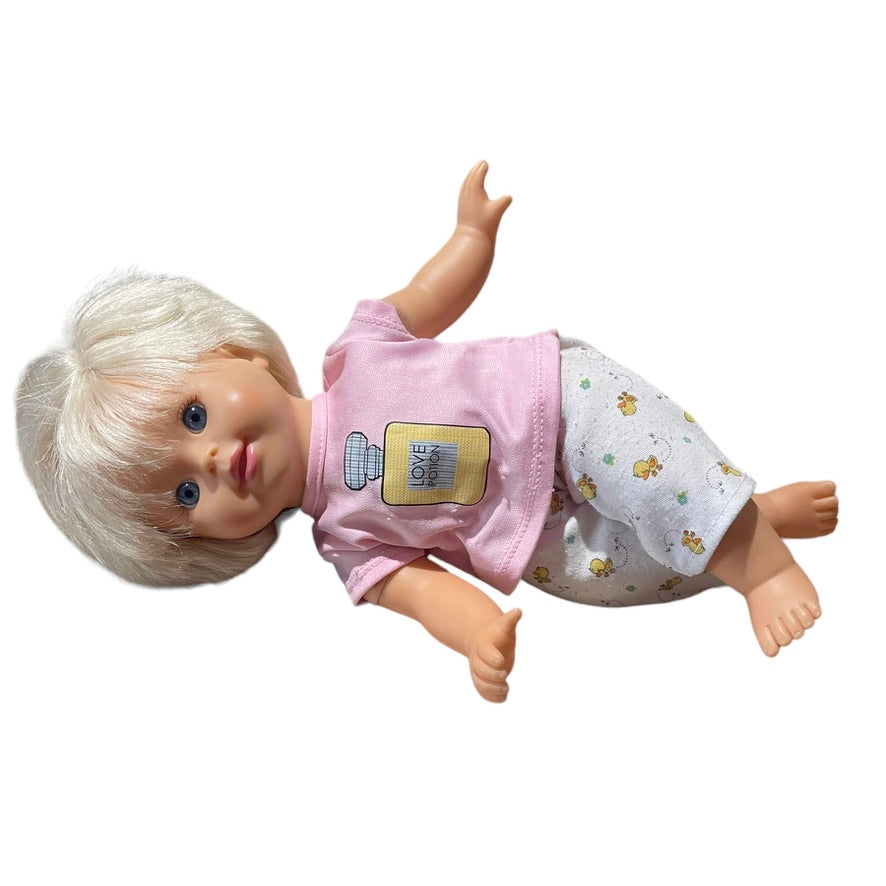 Beautiful 14"Baby Doll with full blond hair and bright blue glass eyes. Not in original clothing. Doll in very good condition. Clothing has some snags.
