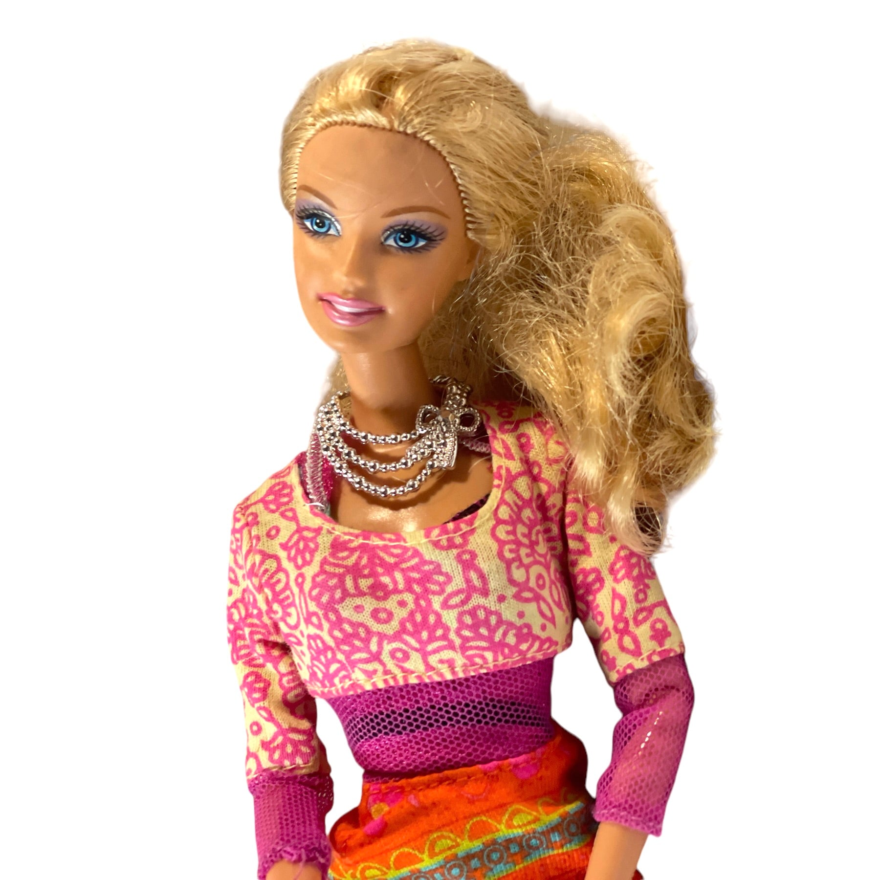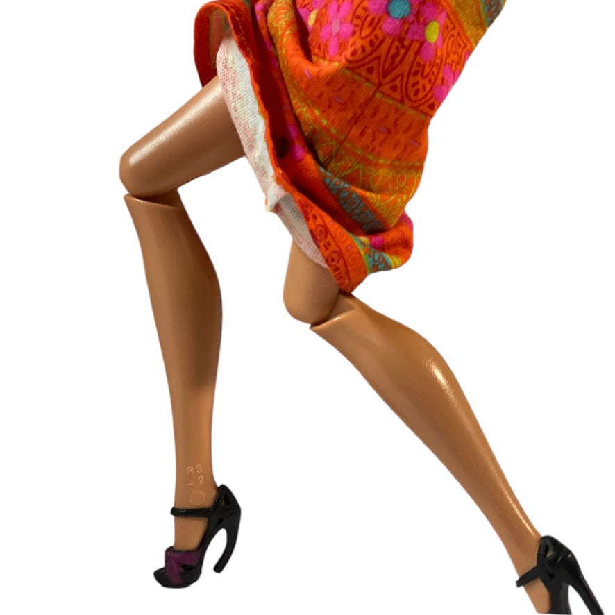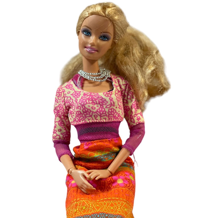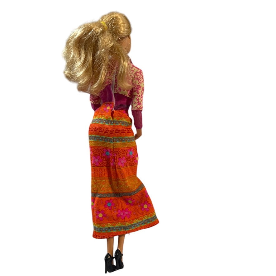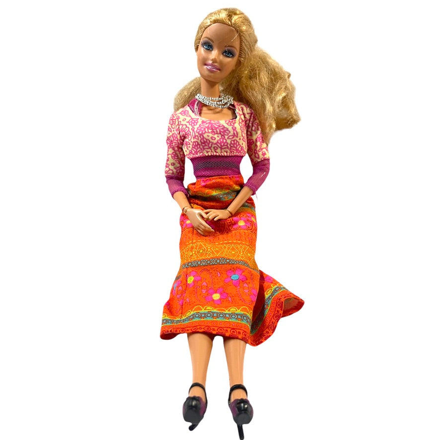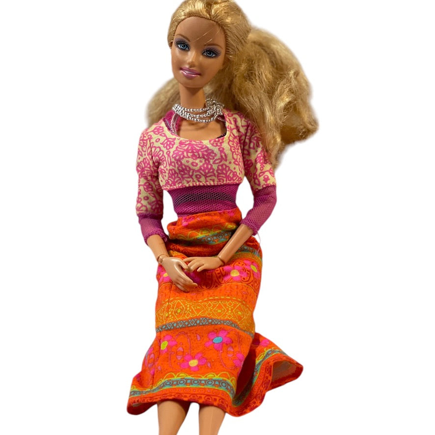 2009 Barbie paired with a vintage Hippy Style Flower Power Pink and Orange 2000 Dress in Excellent preowned condition. This beautiful doll has a prettu silver necklace and high black shoes to complete her outfit. A great mix of collectibles!