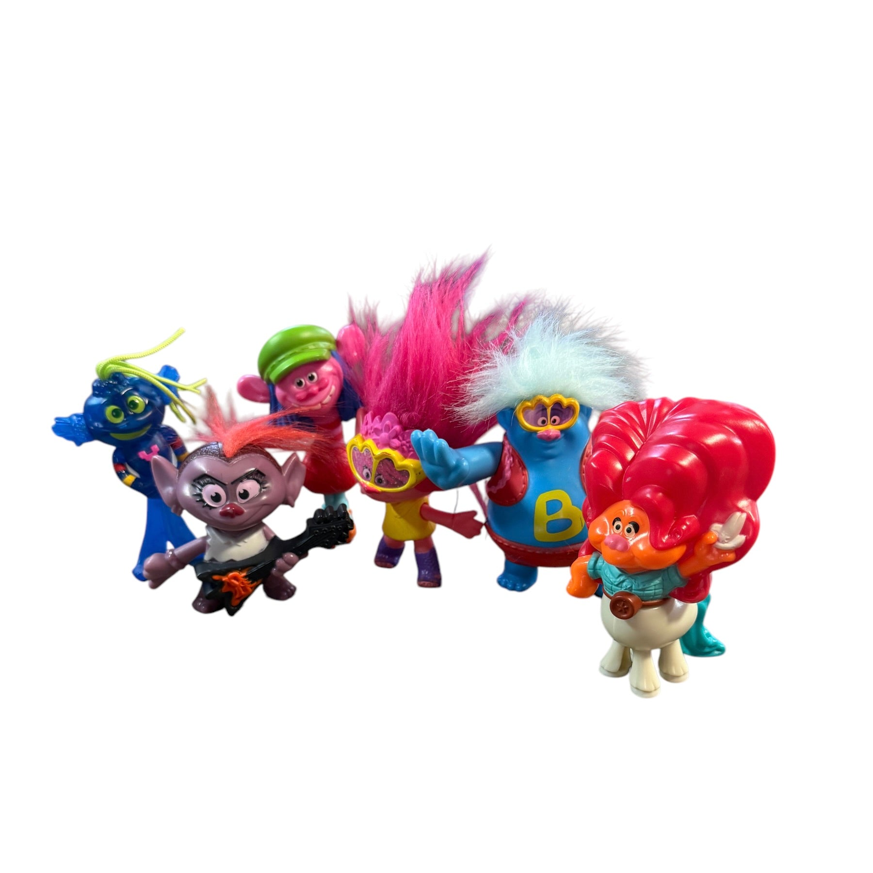 Lot includes Poppy Troll, Biggie, Delta Dawn, King Trollex & Guitar Playing Queen Barb 4" Happy Meal Toys. An instant collection for the collector or all friends of trolls!