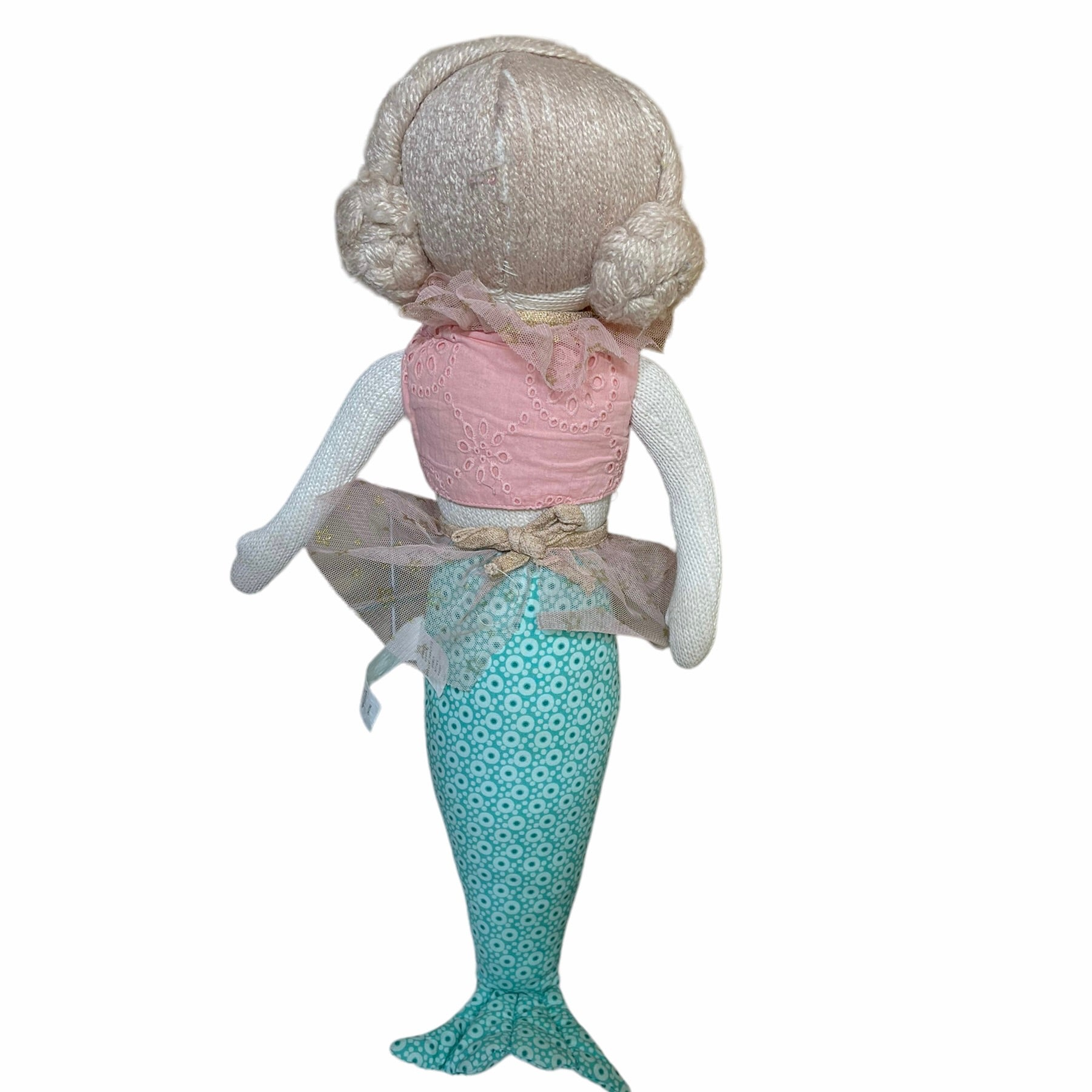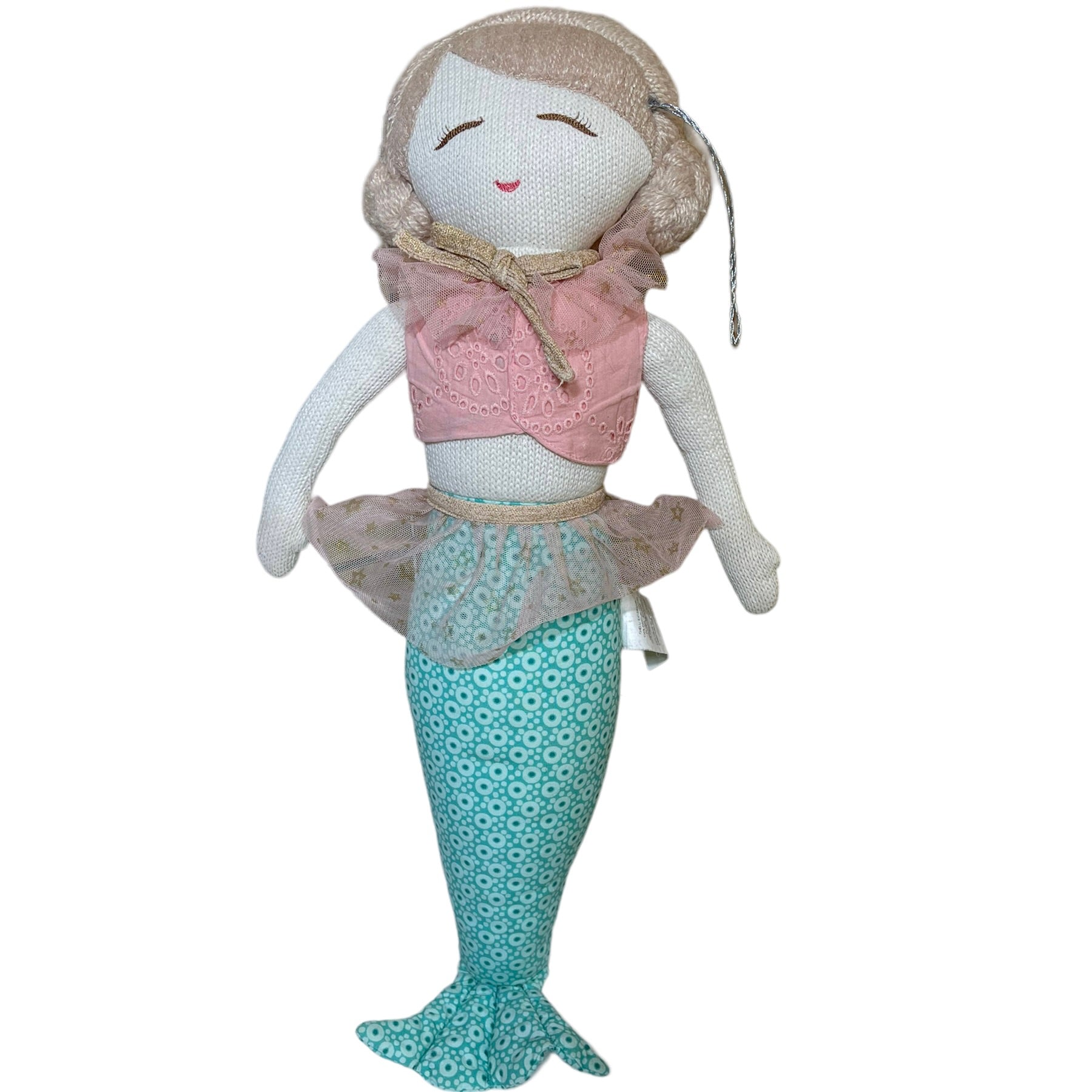 Dainty knit Mermaid pillow, complete with pink eyelet vest and turquoise bubble body & fins. Her sweet embroidered face and tulle collar and tutu make this a totally enchanting toy. Great preowned condition.