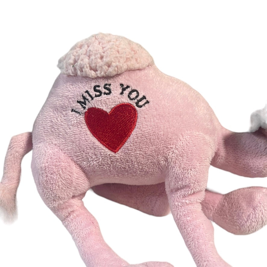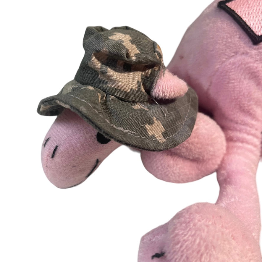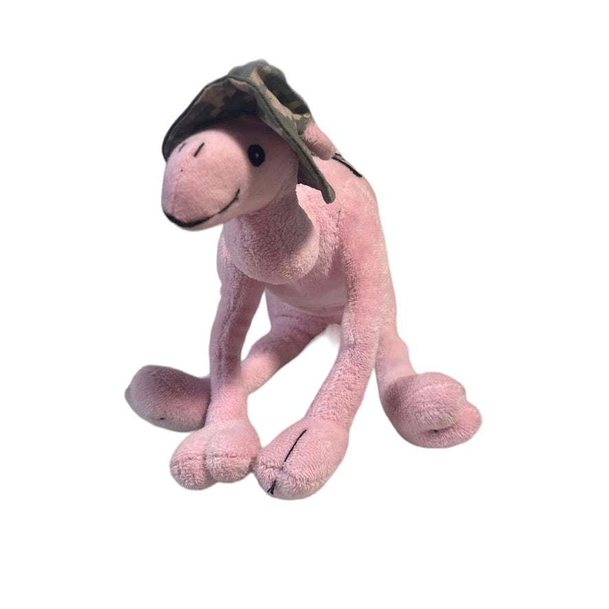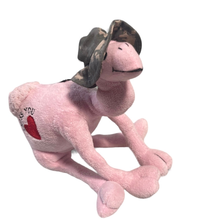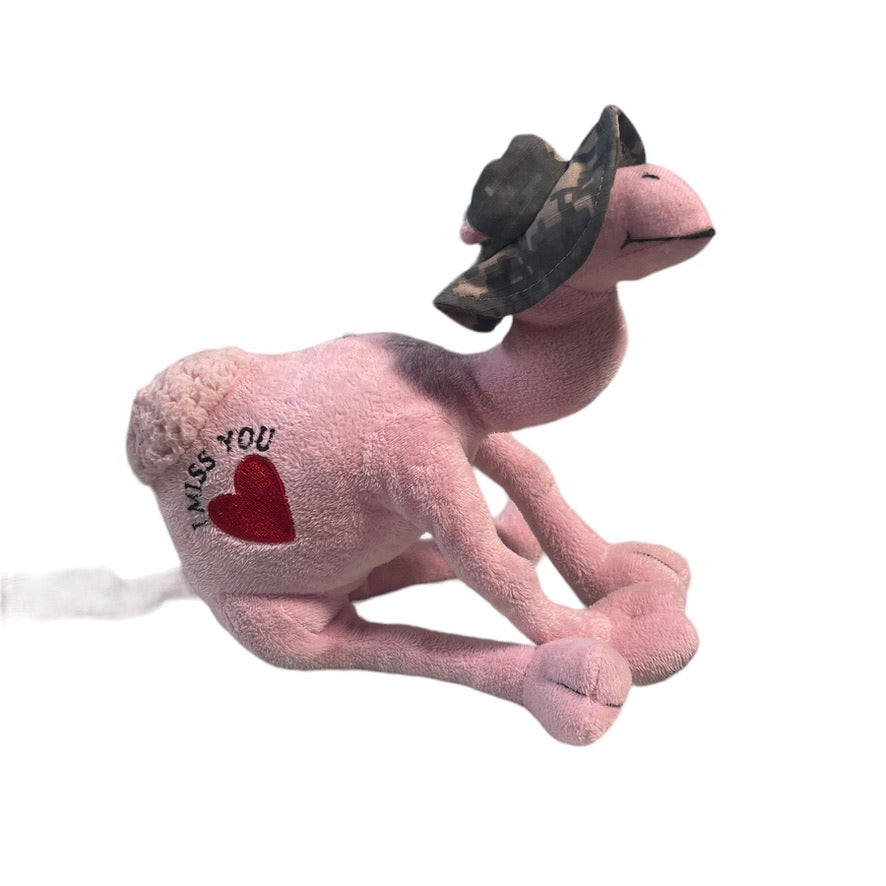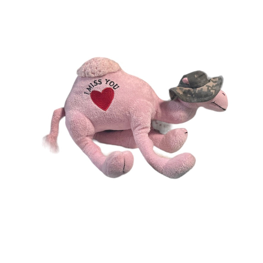 This sweet & wobbly, pink baby camel is decked out in a camo sun hat with, 'I Miss You' and a red heart embroidered on its side. A special Military Souvenir.