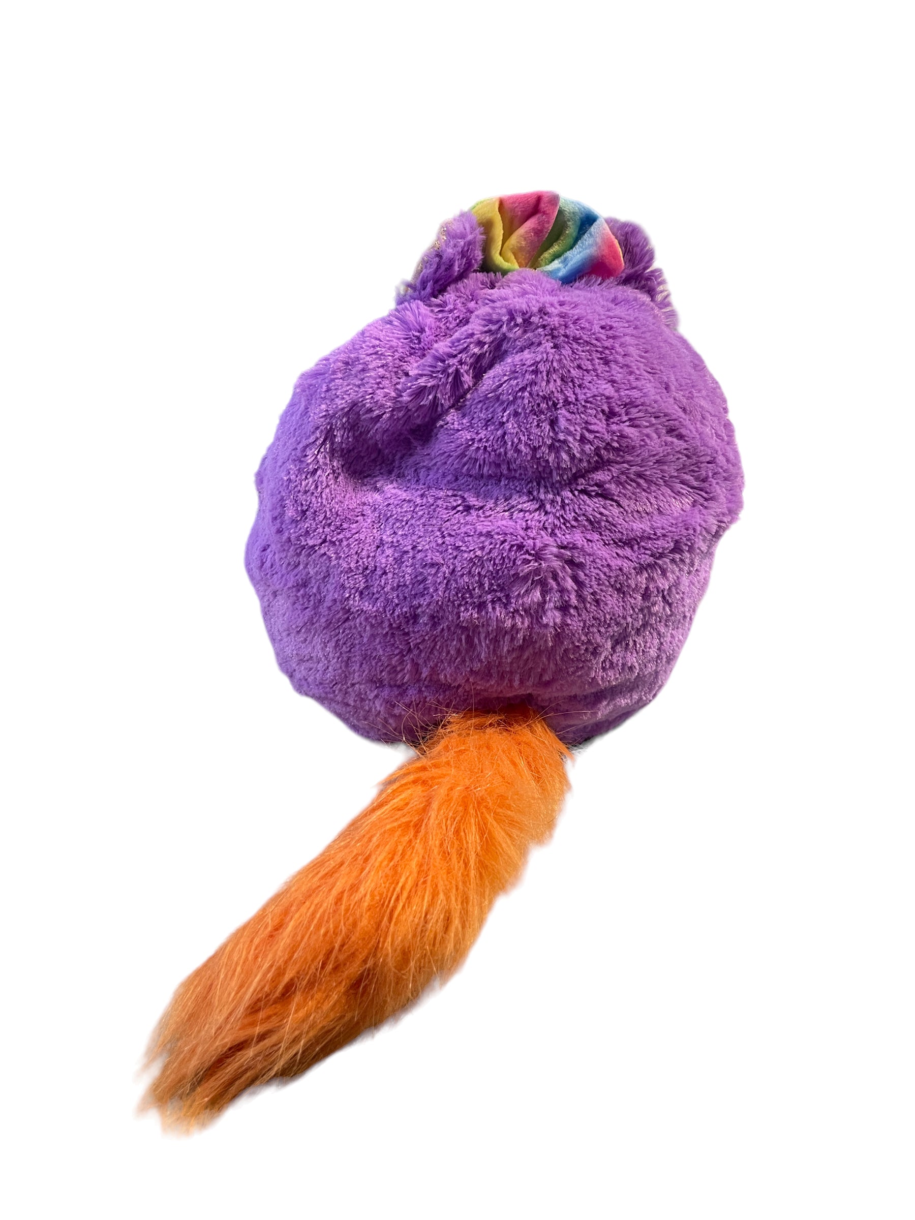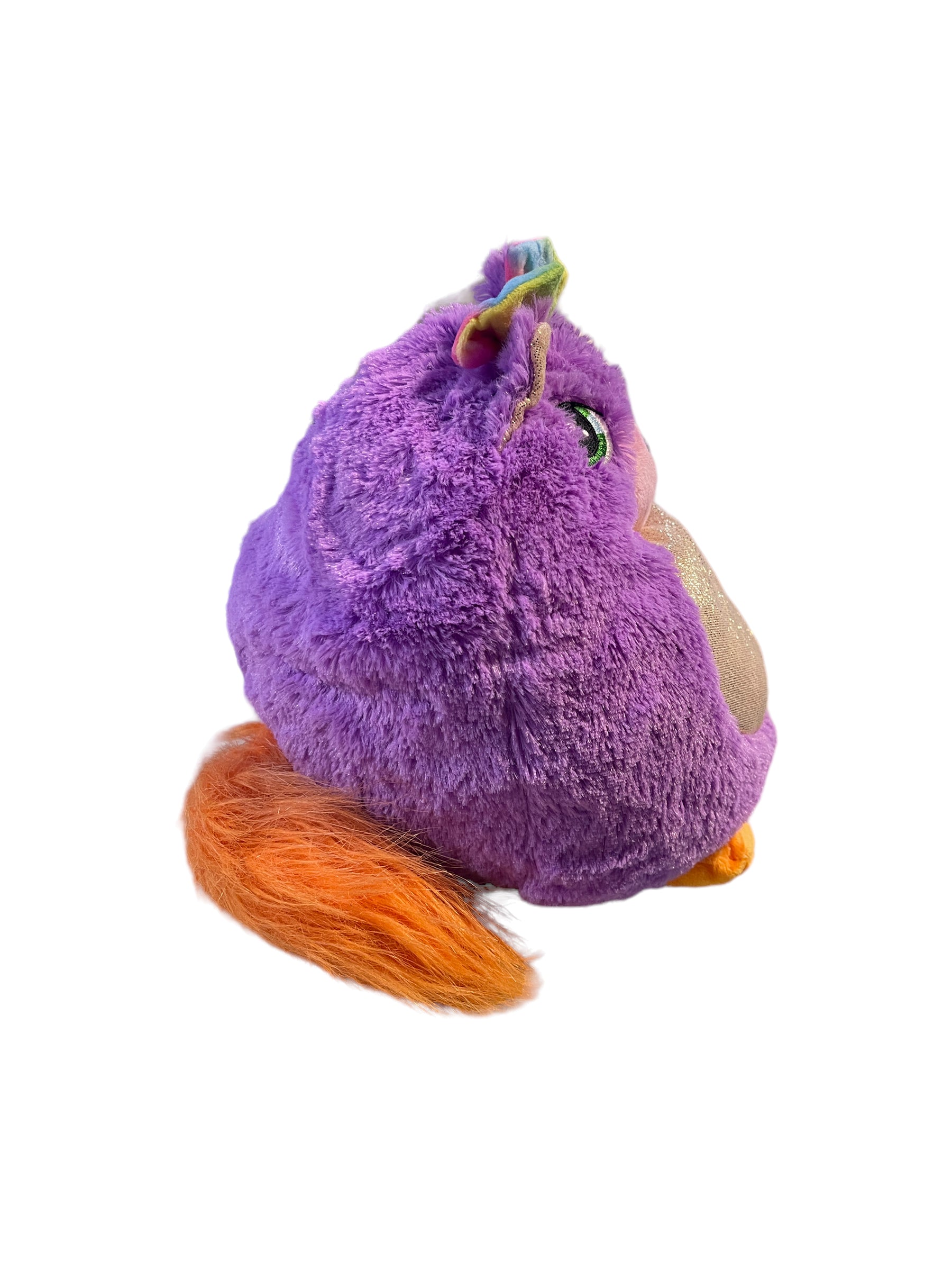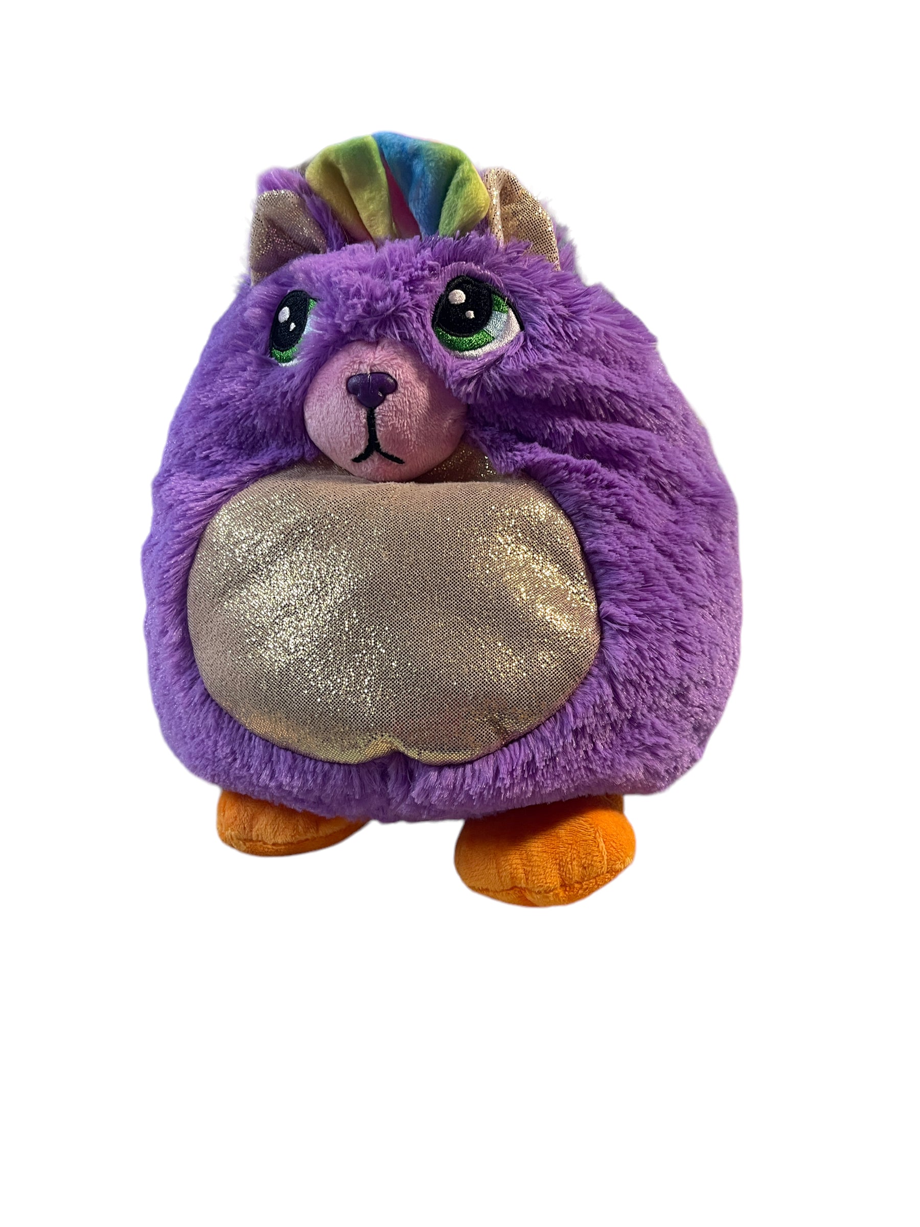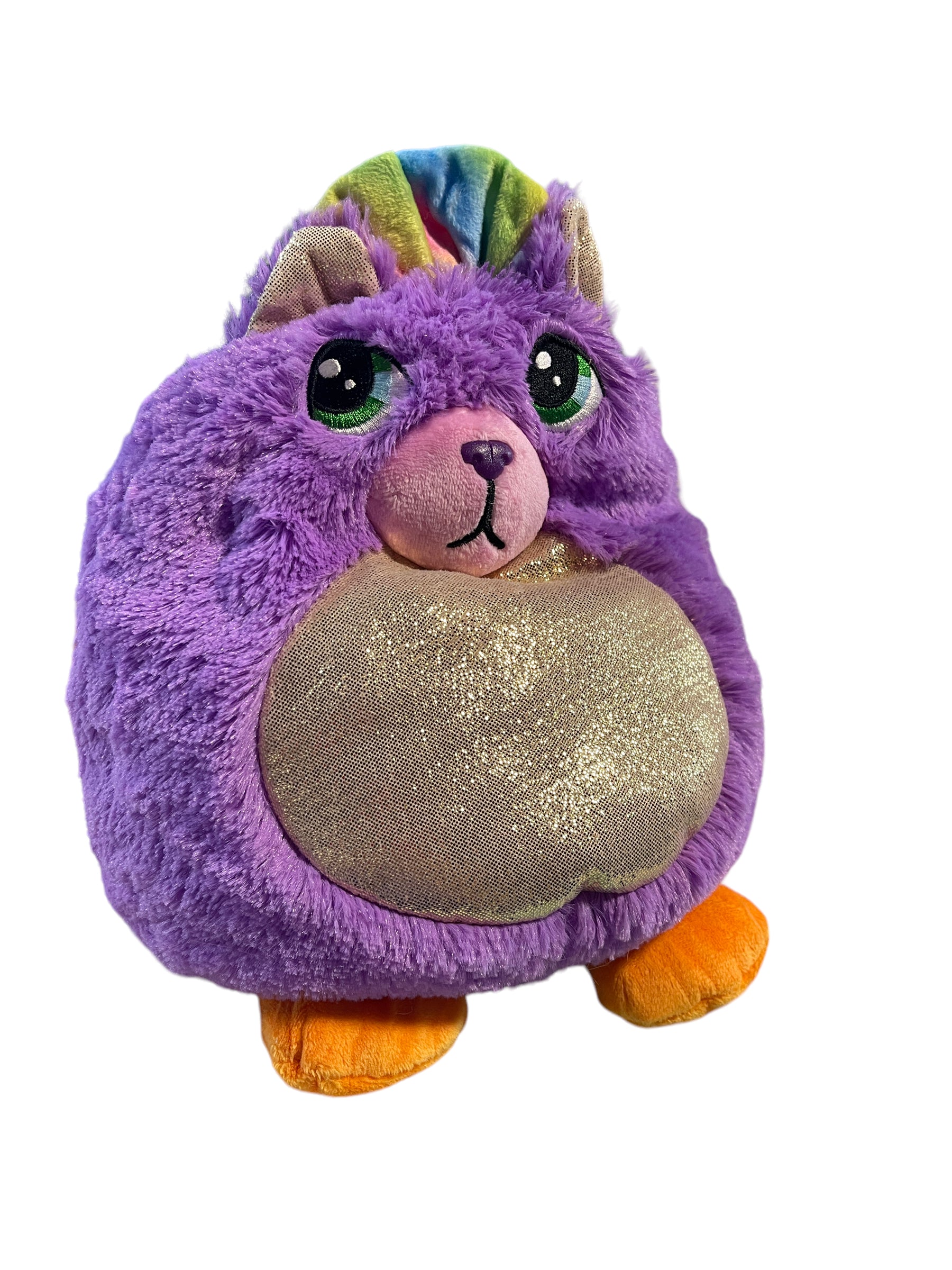 This Cuddly Basic Fun Purple Misfitten has a shiny gold belly and orange feet and fluffy tail. A pastel multicoloured bow is tucked between its sparkly gold lined ears. Embroidered eyes and a purple plastic nose combine to make this sweet Misfitten a very special toy.
