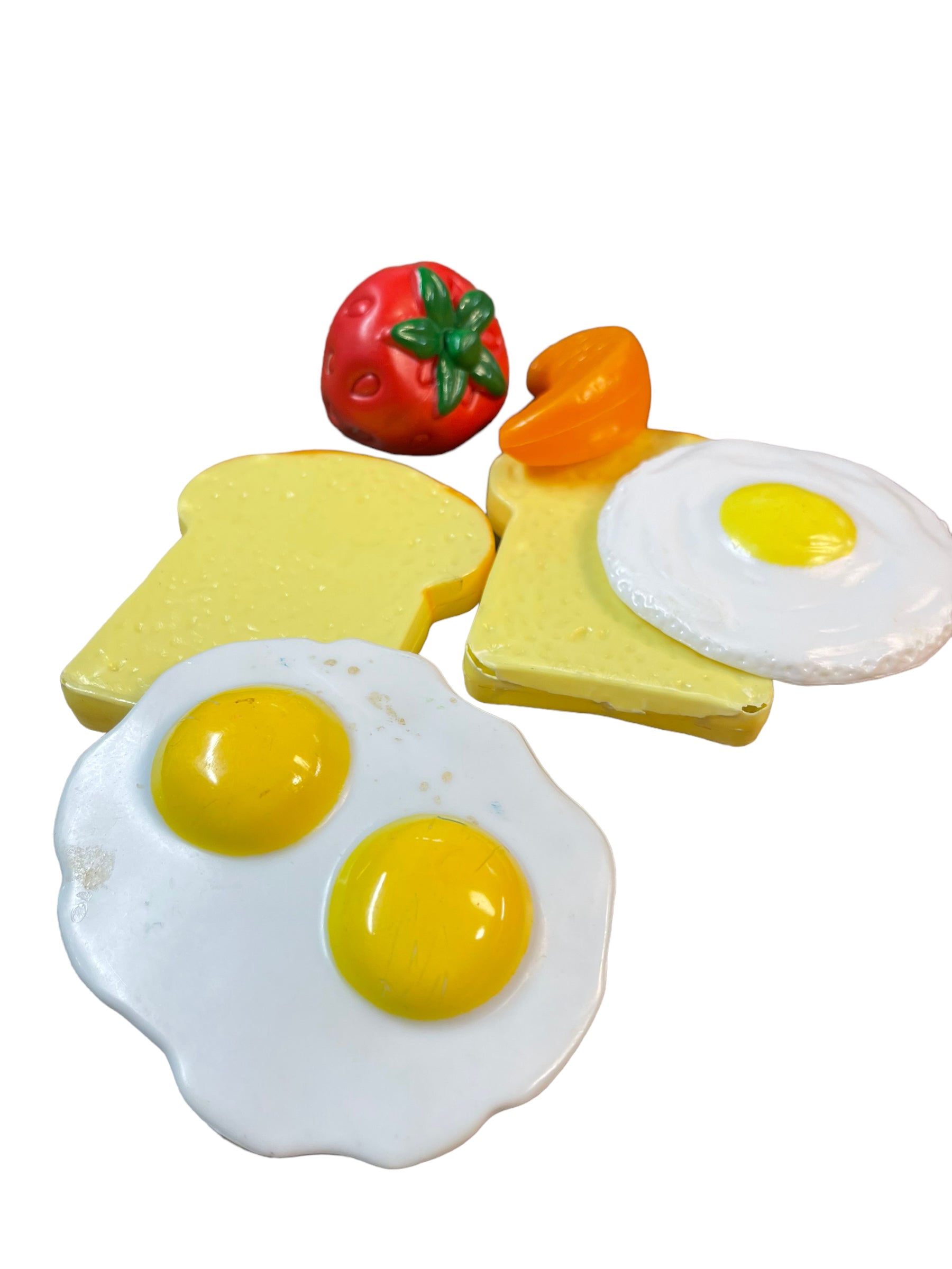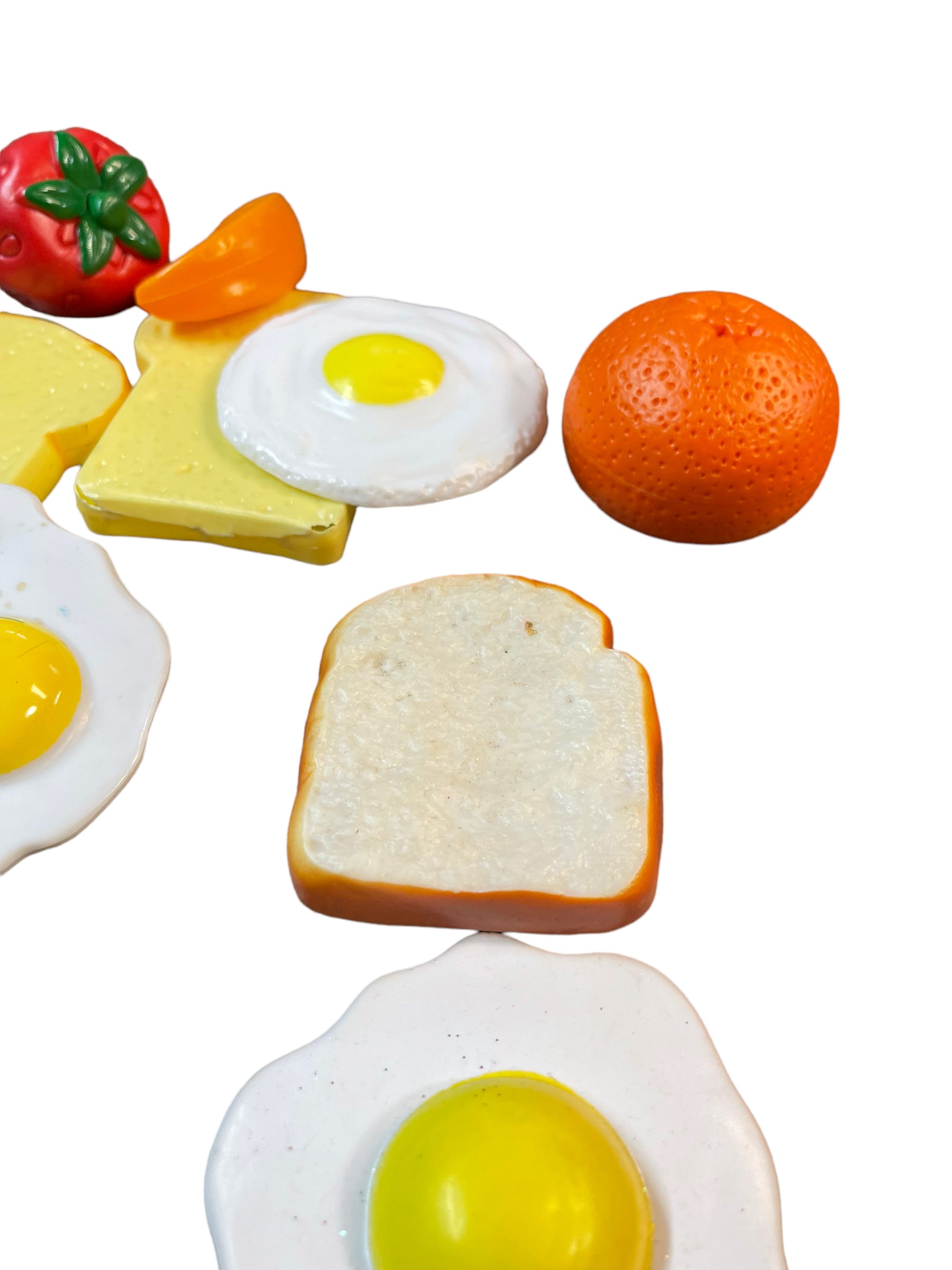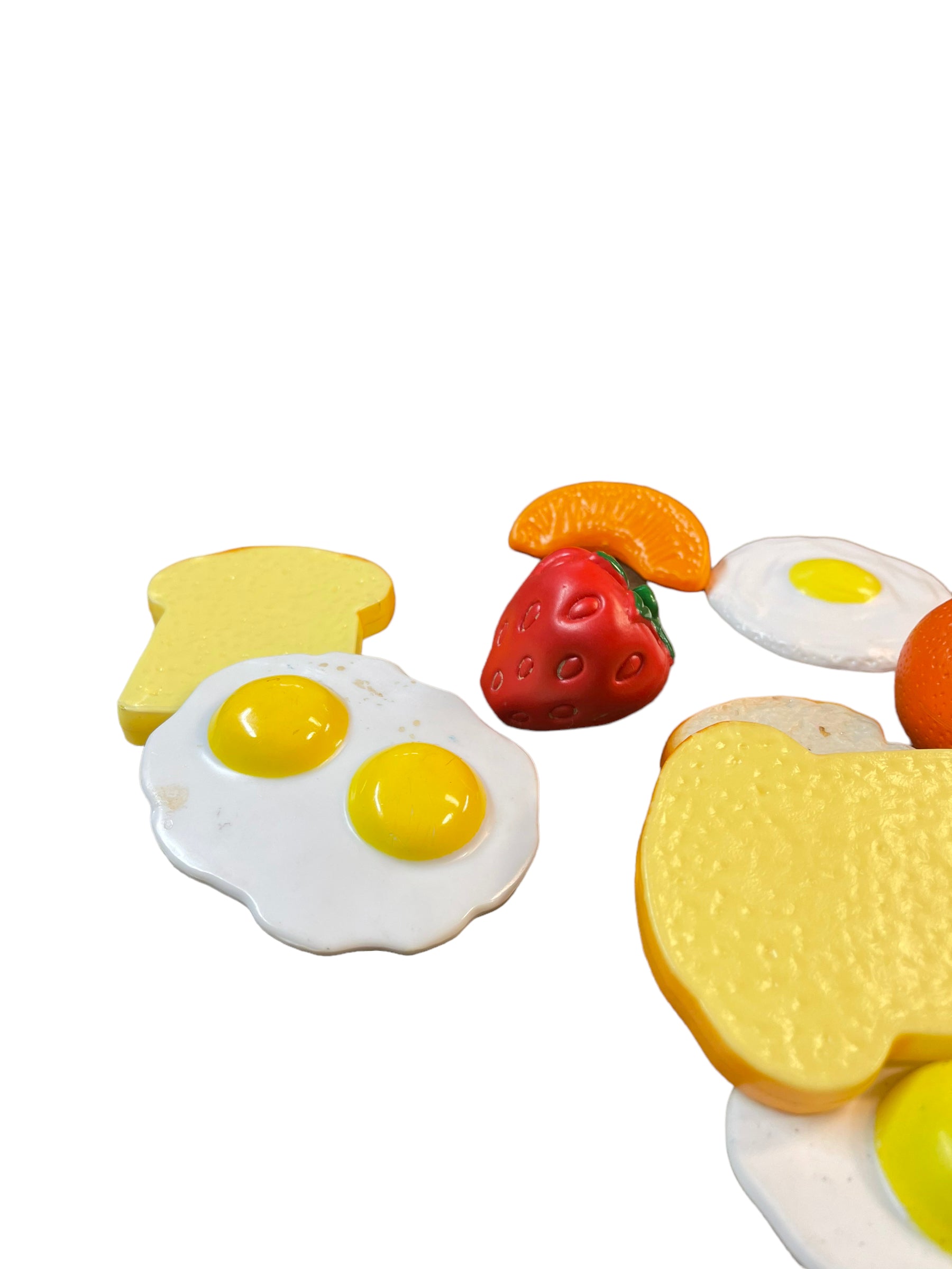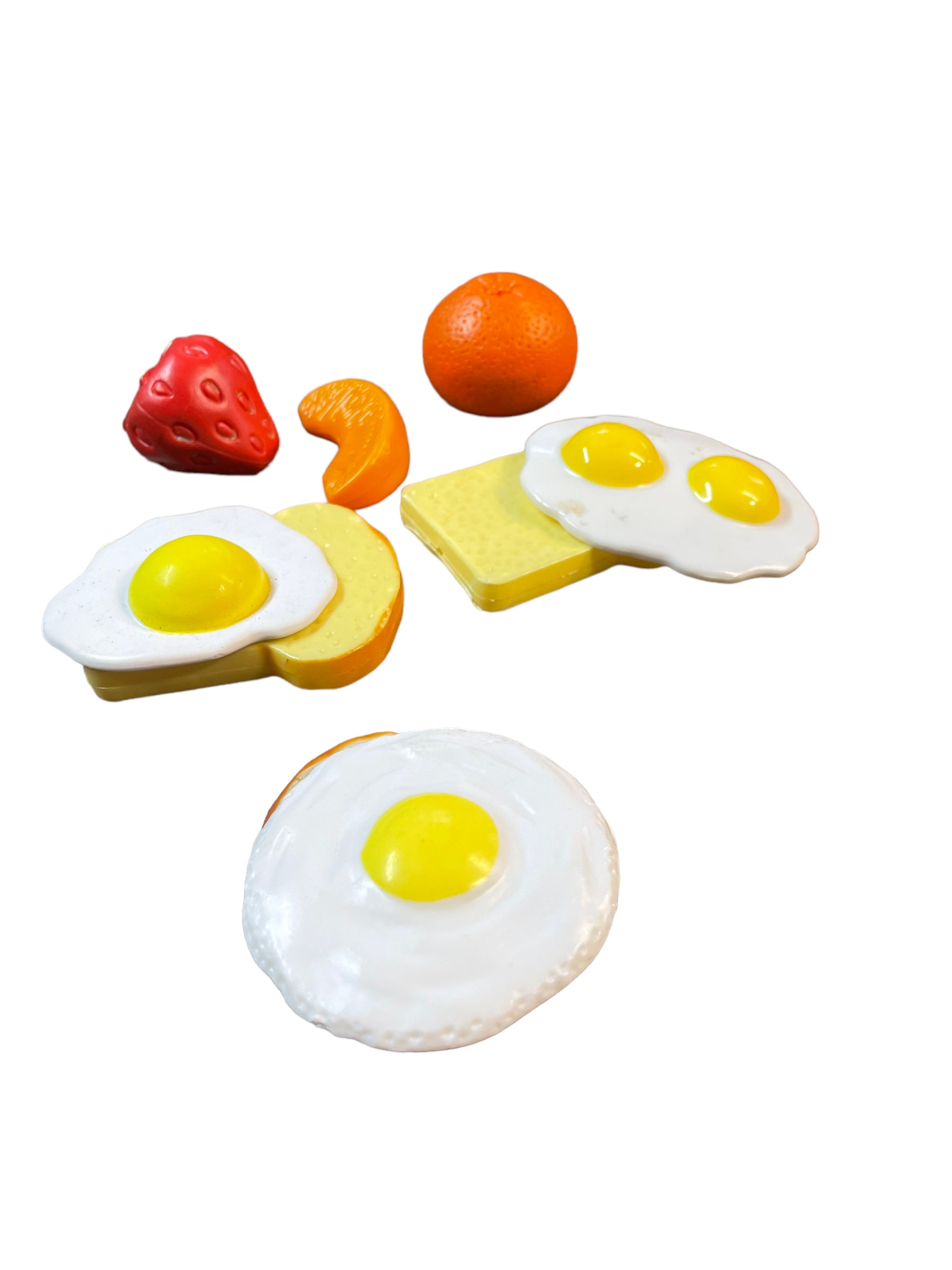 Mixed Lot of 8 Play Breakfast Foods, in Good Preowned Condition. Includes Fried Eggs, Bread and Fruit. Great for hours of imaginative play!