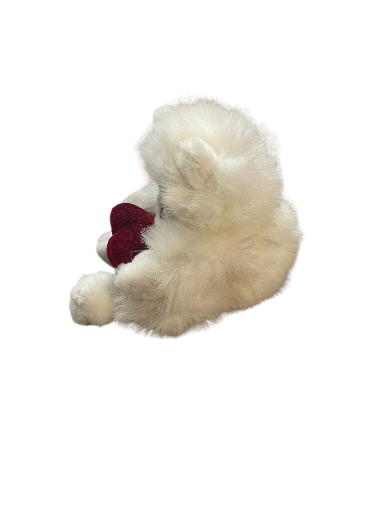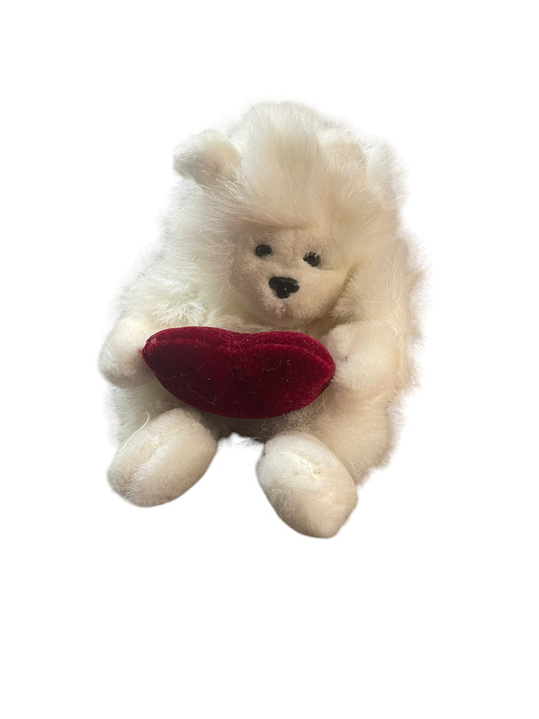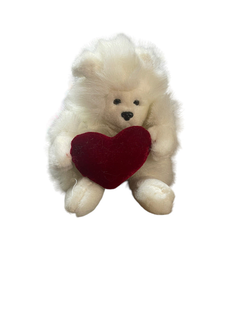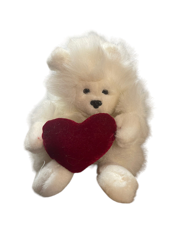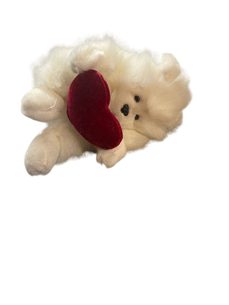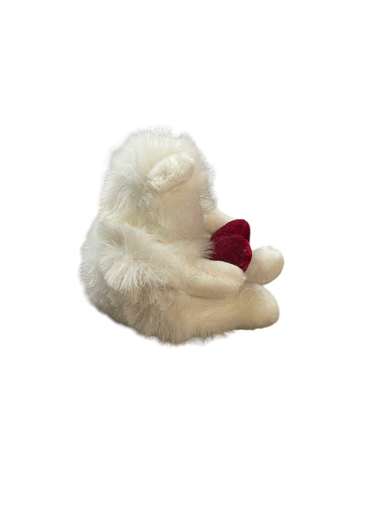 Adorable,Fluffy white ape by Russ, 'Mongo' is an 8" Ape, Gorilla, Monkey holding a red velvet heart. Perfect for Christmas or Valentine's Day. Missing tag. Bright black eyes and plactic nose. So cute!