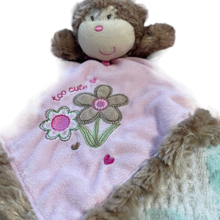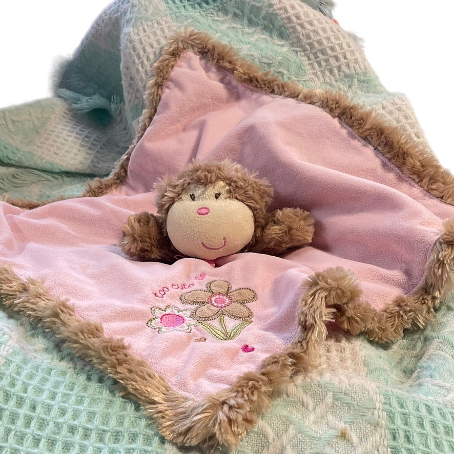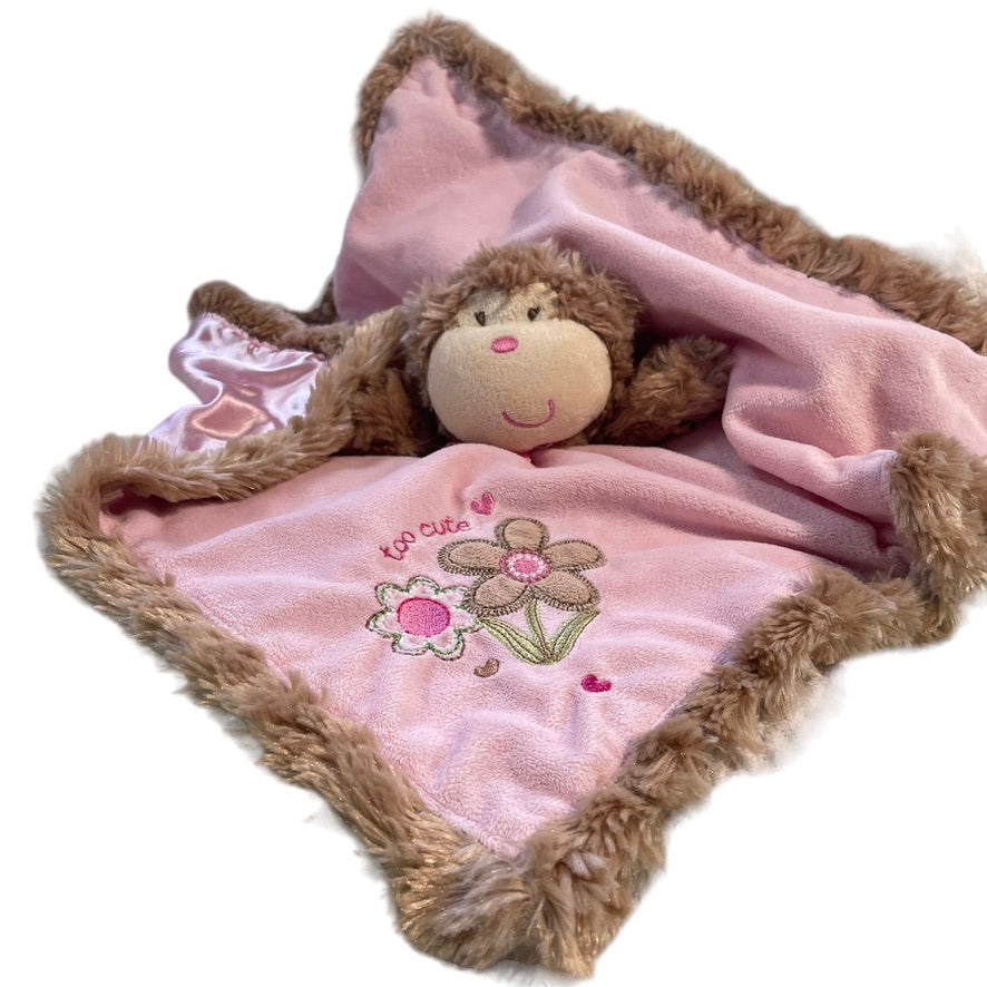 Monkey Lovey Security Blanket Rattle, Baby Starters, 'too cute', Embroidery, Pink Minky, Satin Backing
