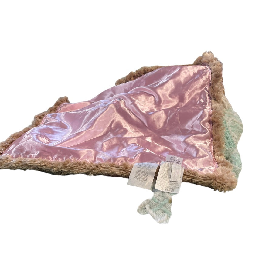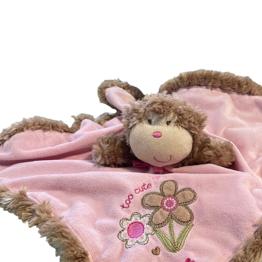 17x17" Ultra soft minky & satin Lovey Security Blanket Monkey Rattle in soft pinks and beige with embroidered flower & hearts accents. This Baby Starters lovey is in excellent preowned condition. So Sweet!