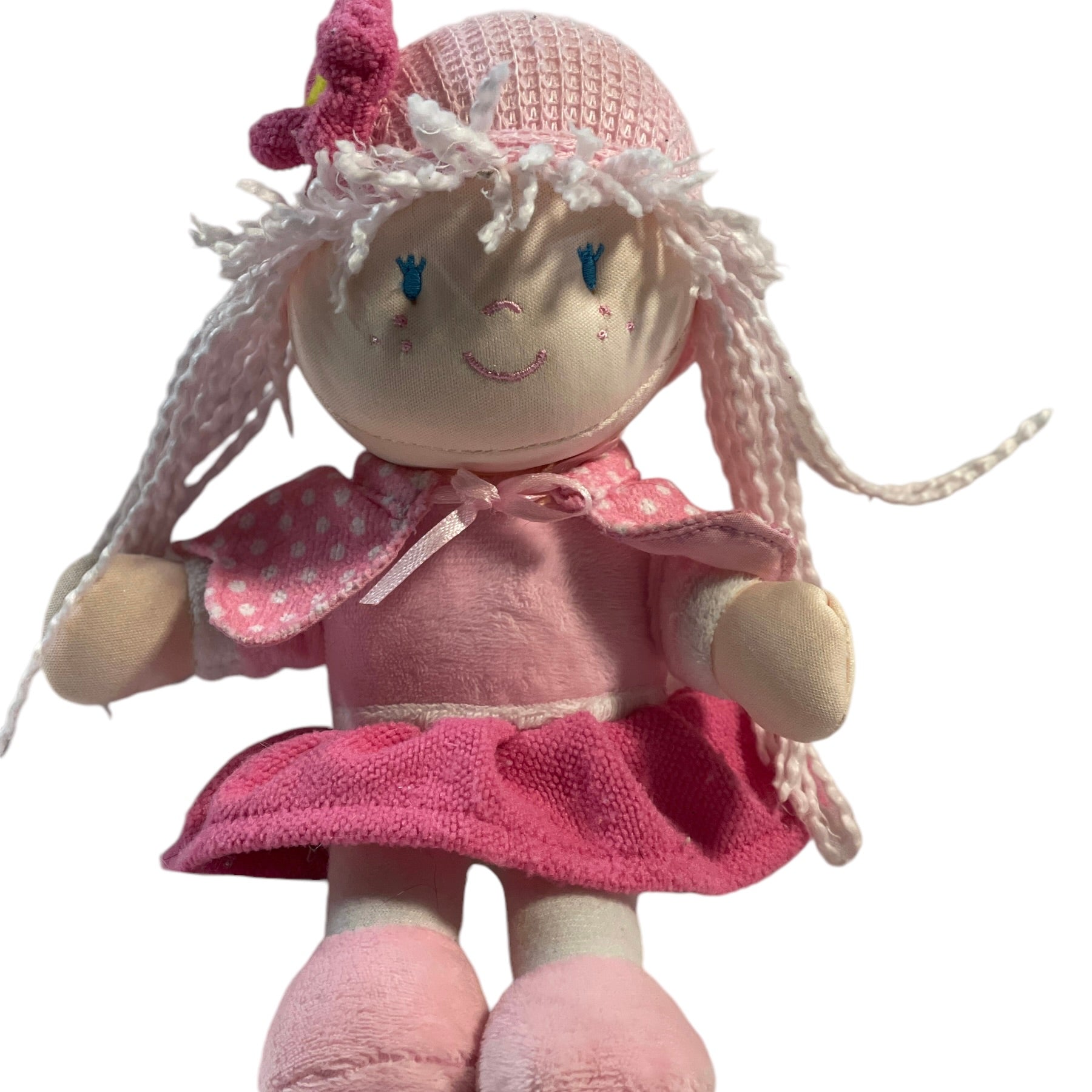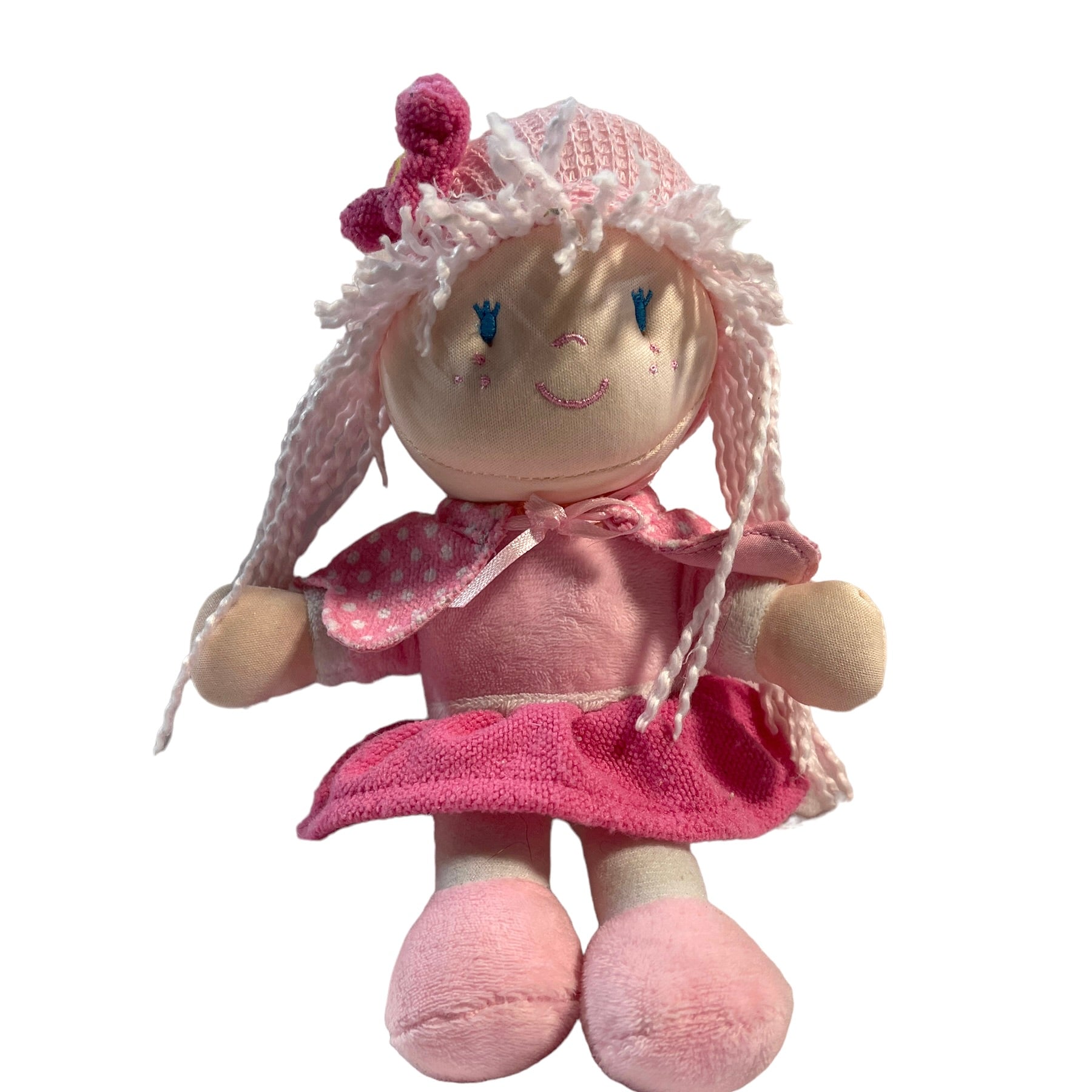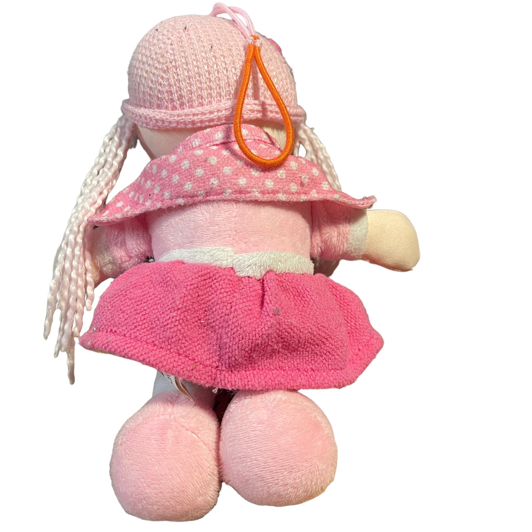 Adorable Baby Doll is so pretty and allover pink with pink yarn hair, pink freckles, pink nose and cute pink clothes! Soft cloth, 9" tall and very, very sweet. Has a hanging loop help affix to stroller or carseat. Preowned in great condition.