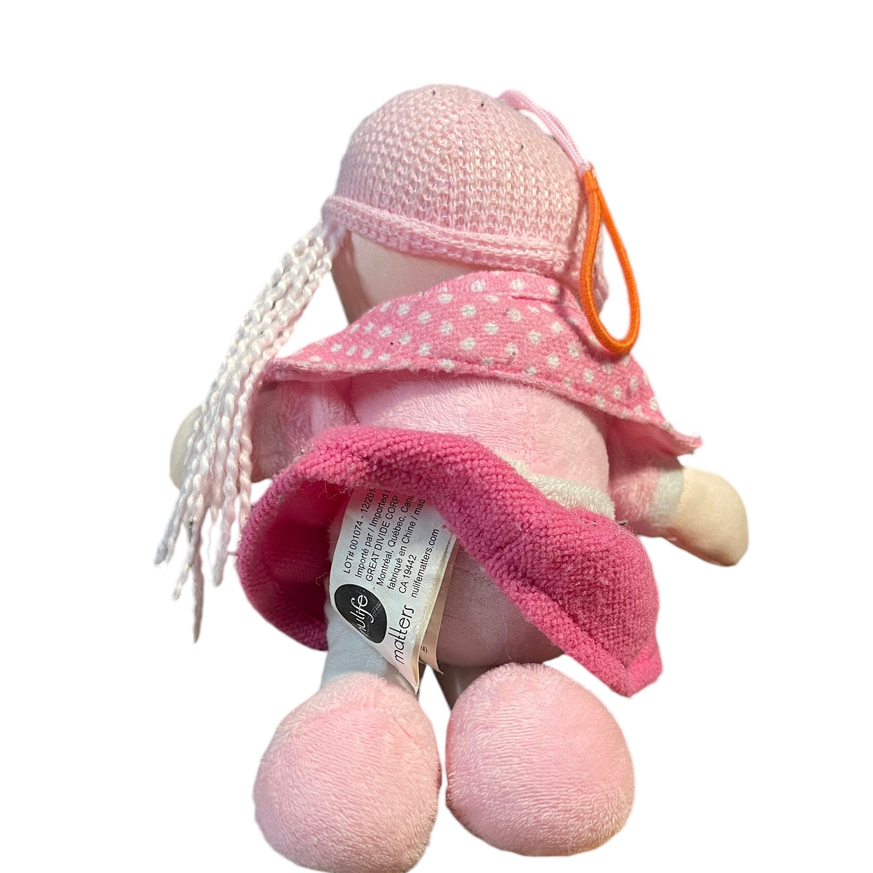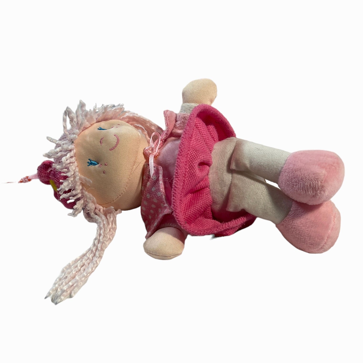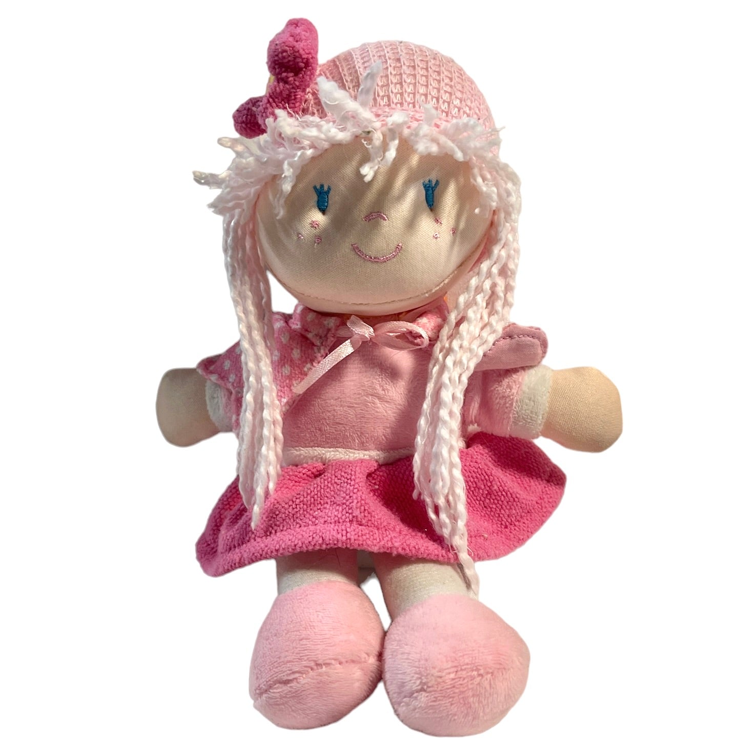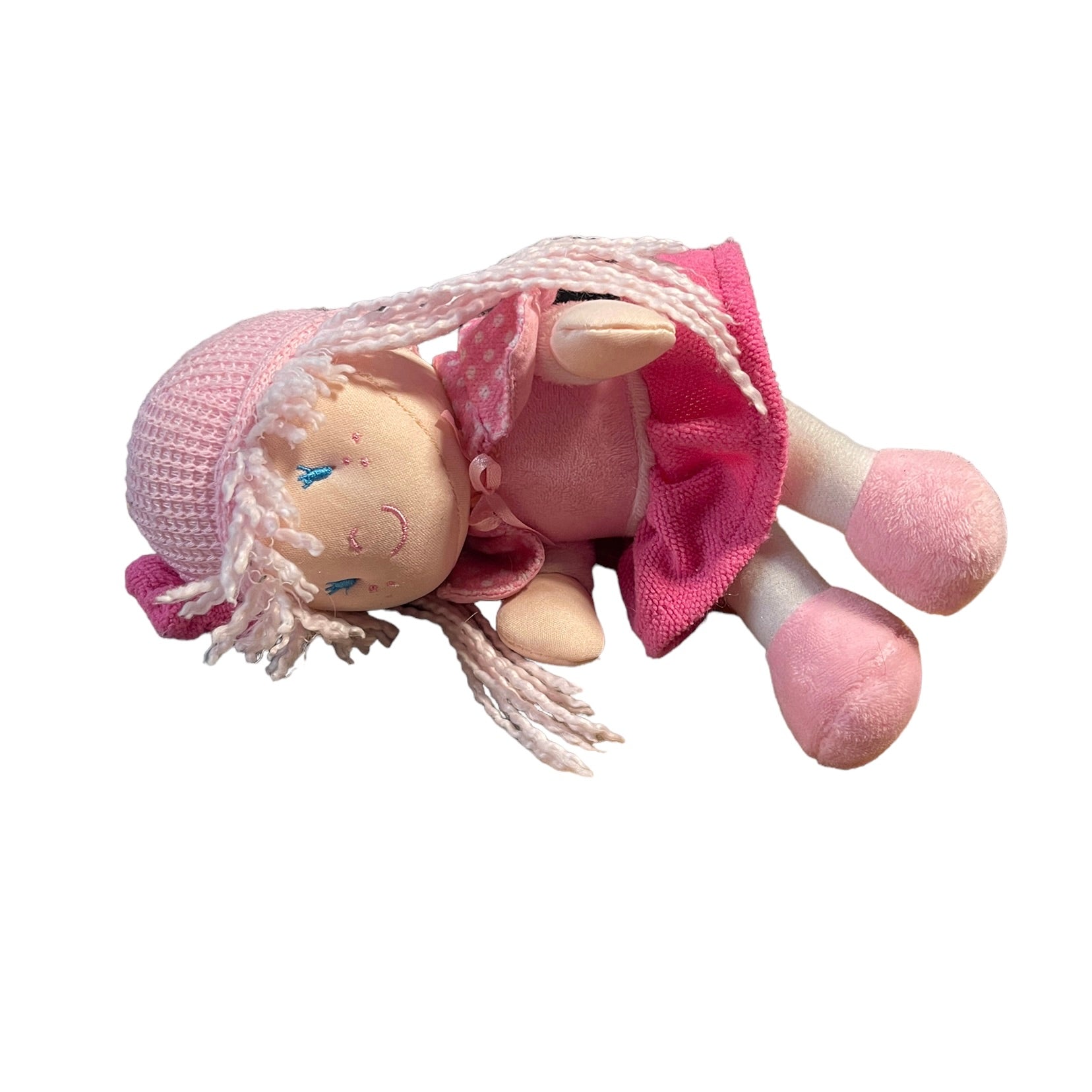 Adorable Baby Doll is so pretty and allover pink with pink yarn hair, pink freckles, pink nose and cute pink clothes! Soft cloth, 9" tall and very, very sweet. Has a hanging loop help affix to stroller or carseat. Preowned in great condition.