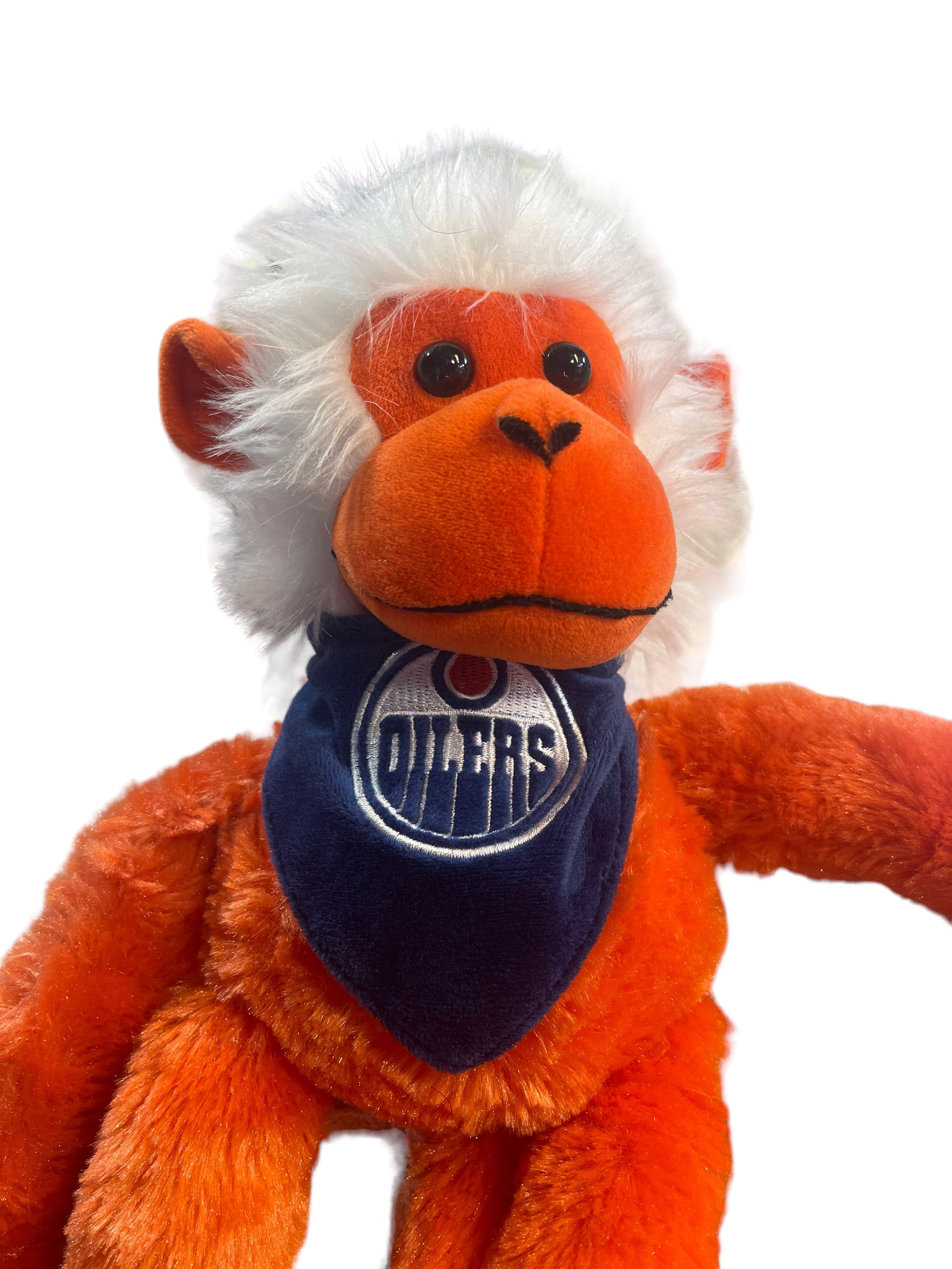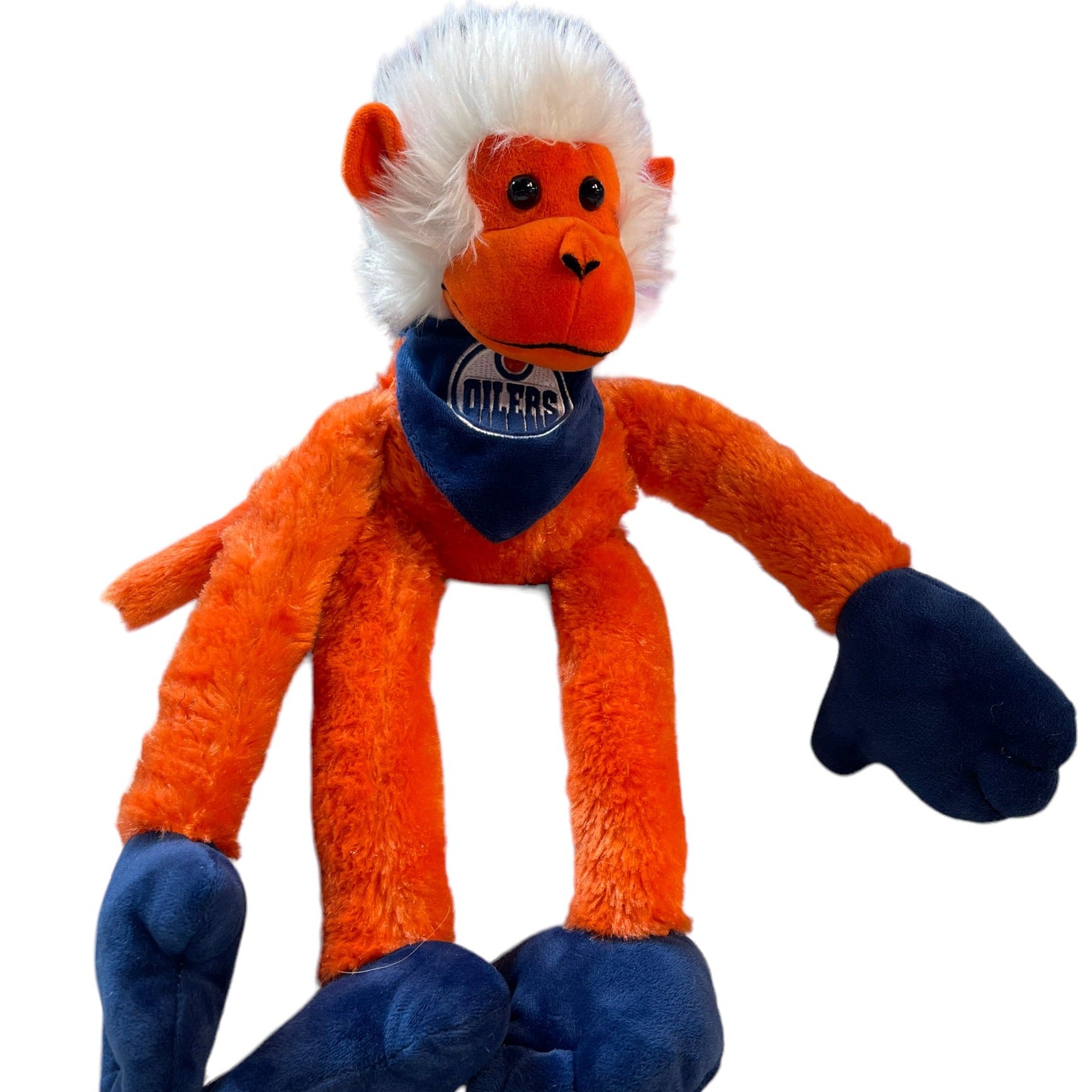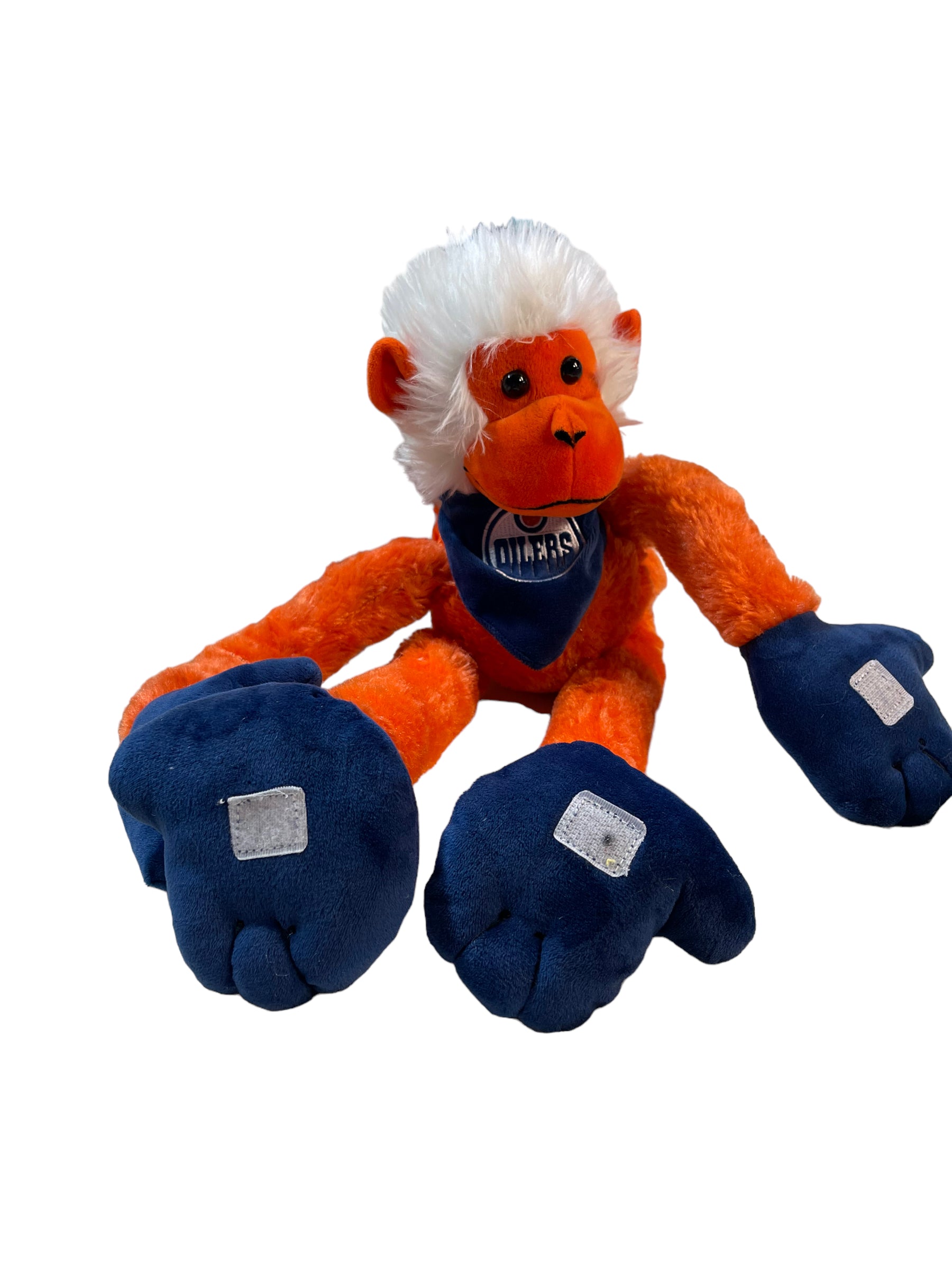 Cute, adjustable Monkey in Edmonton Oiler's colours and gear, can hang from hands or feet. Great preowned condition.