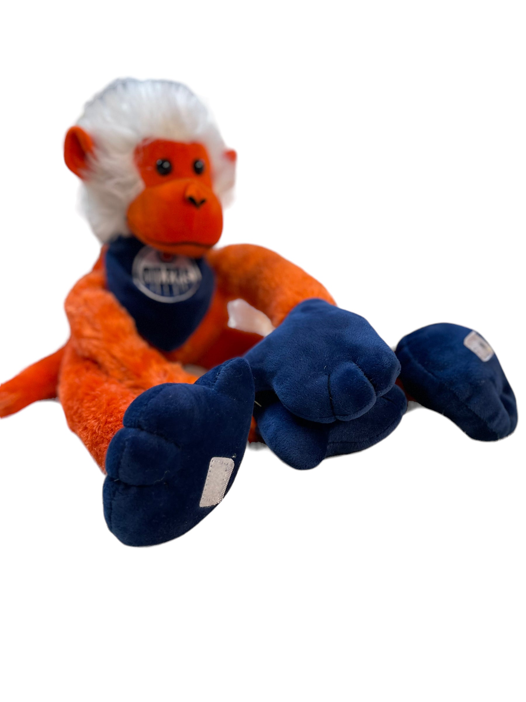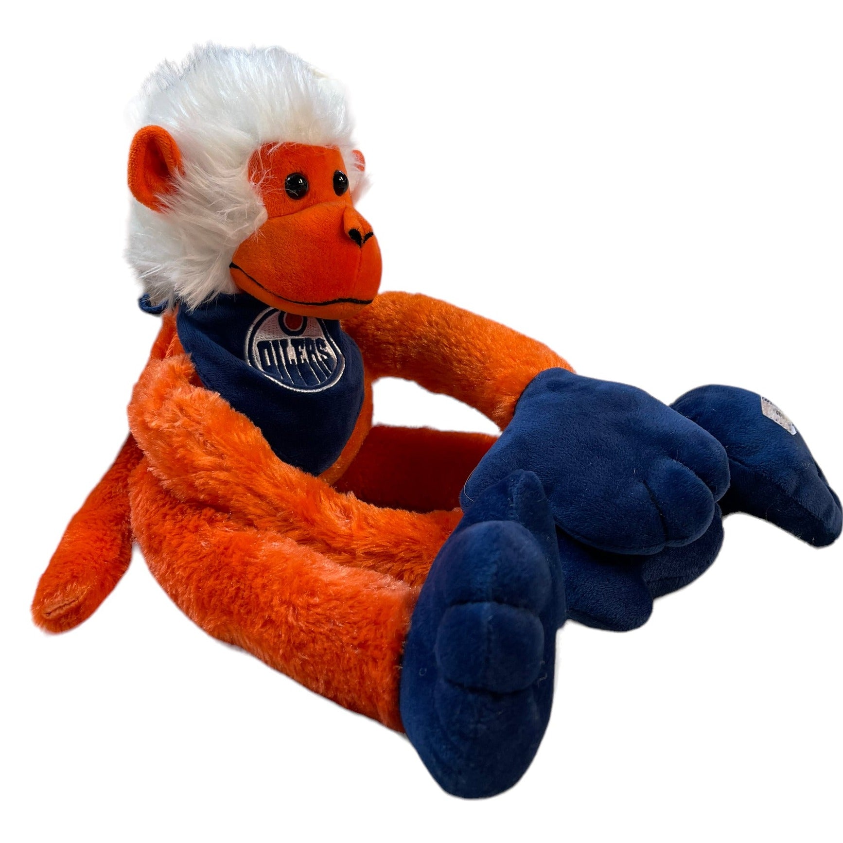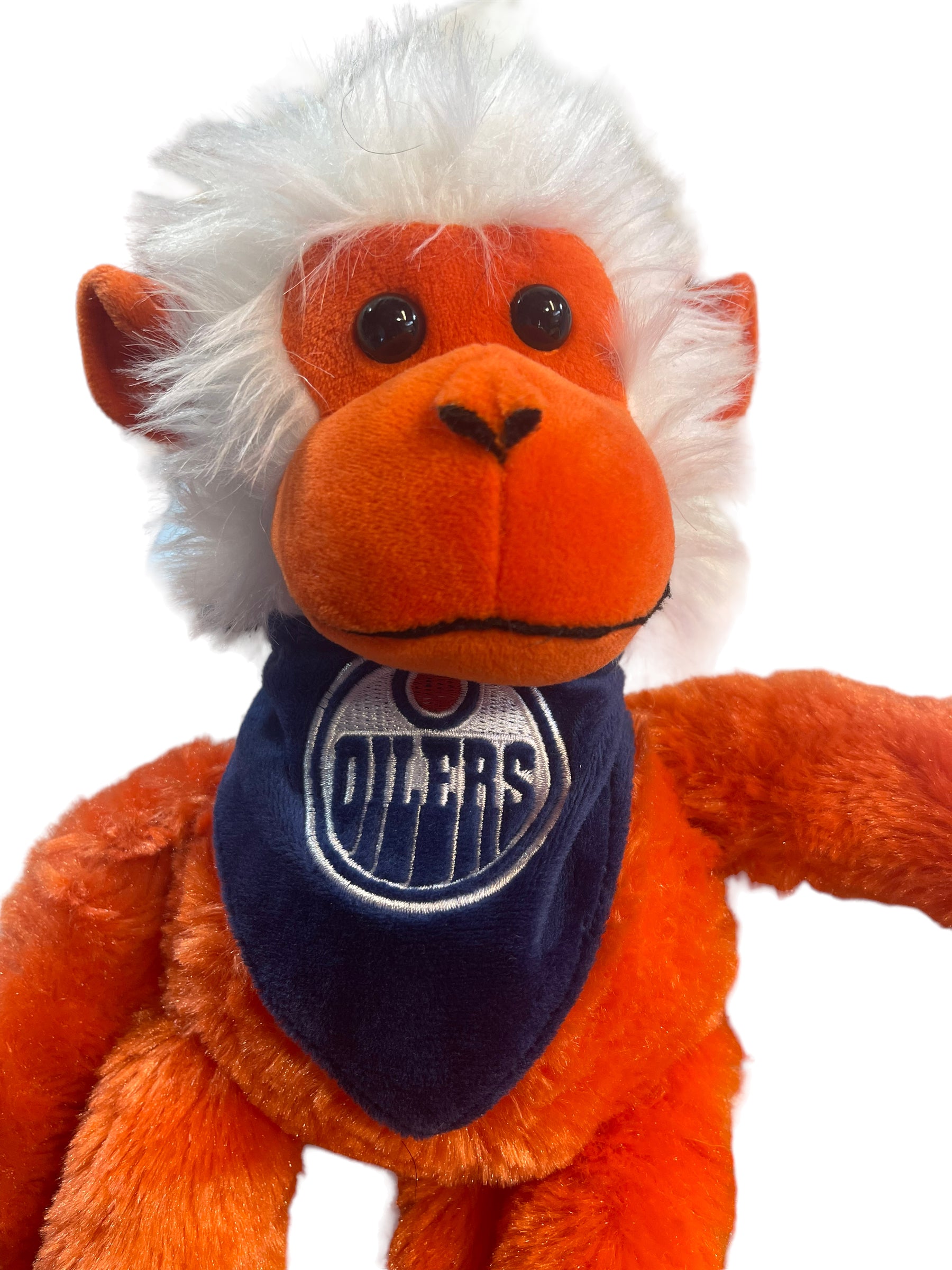 Cute, adjustable Monkey in Edmonton Oiler's colours and gear, can hang from hands or feet. Great preowned condition.
