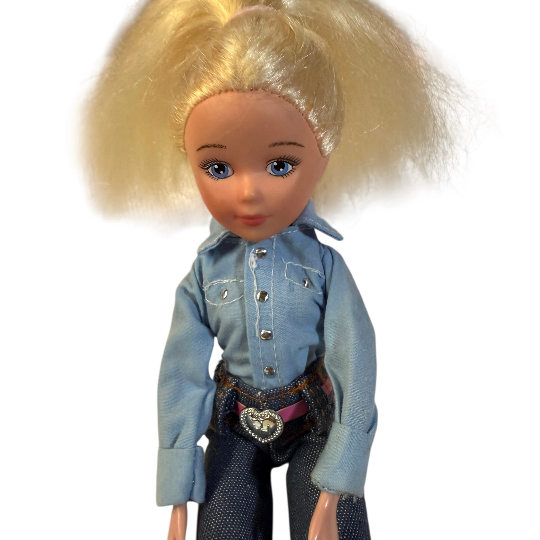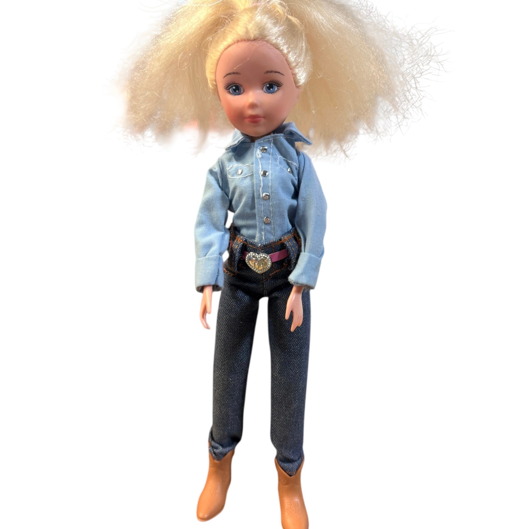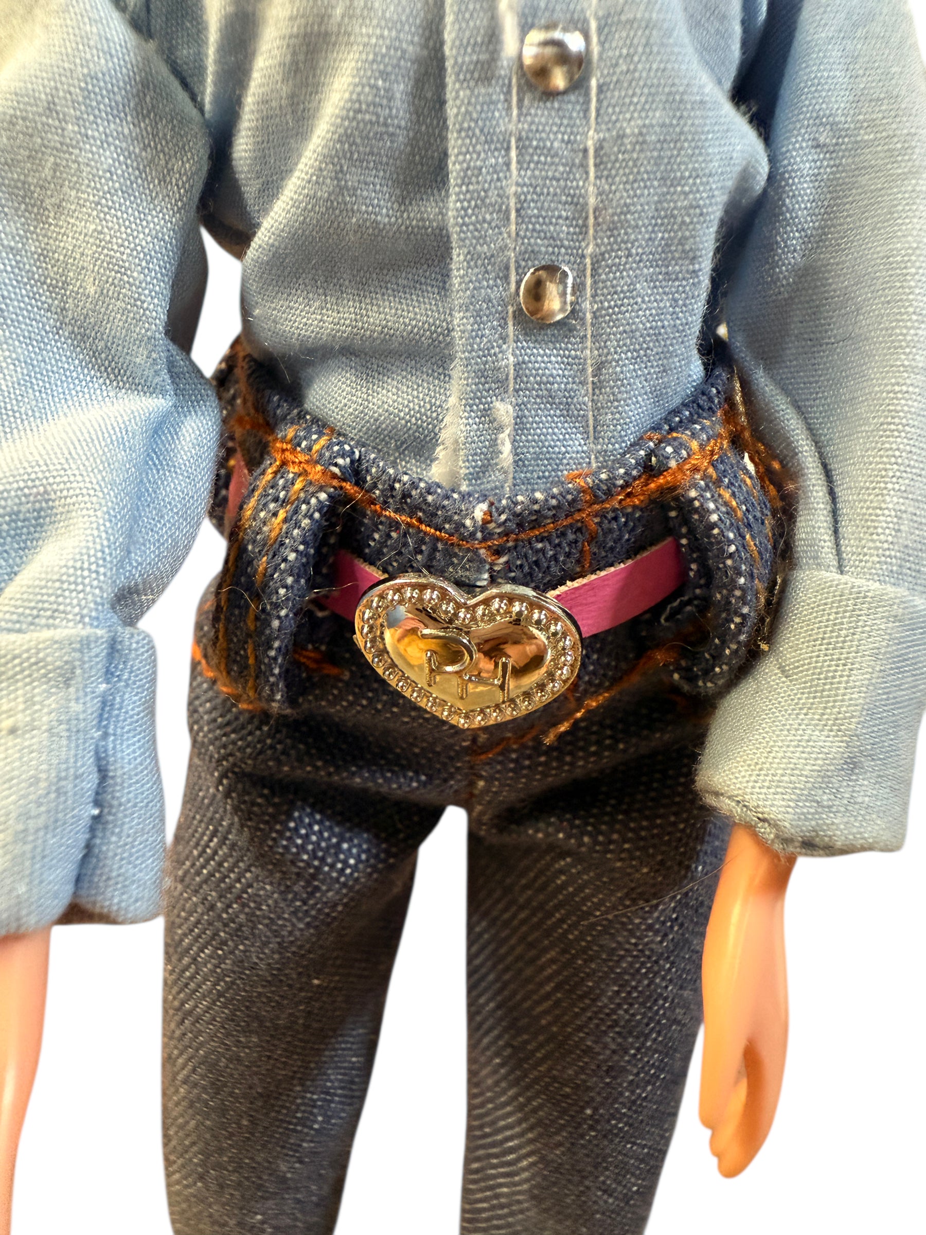 Sweet cowgirl in a pretty denim outfit with pink accents. Moveable arms and she bends at the waist. Her pretty belt with the sparkly heart buckle really dresses up her outfit. She is in very good preowned condition.