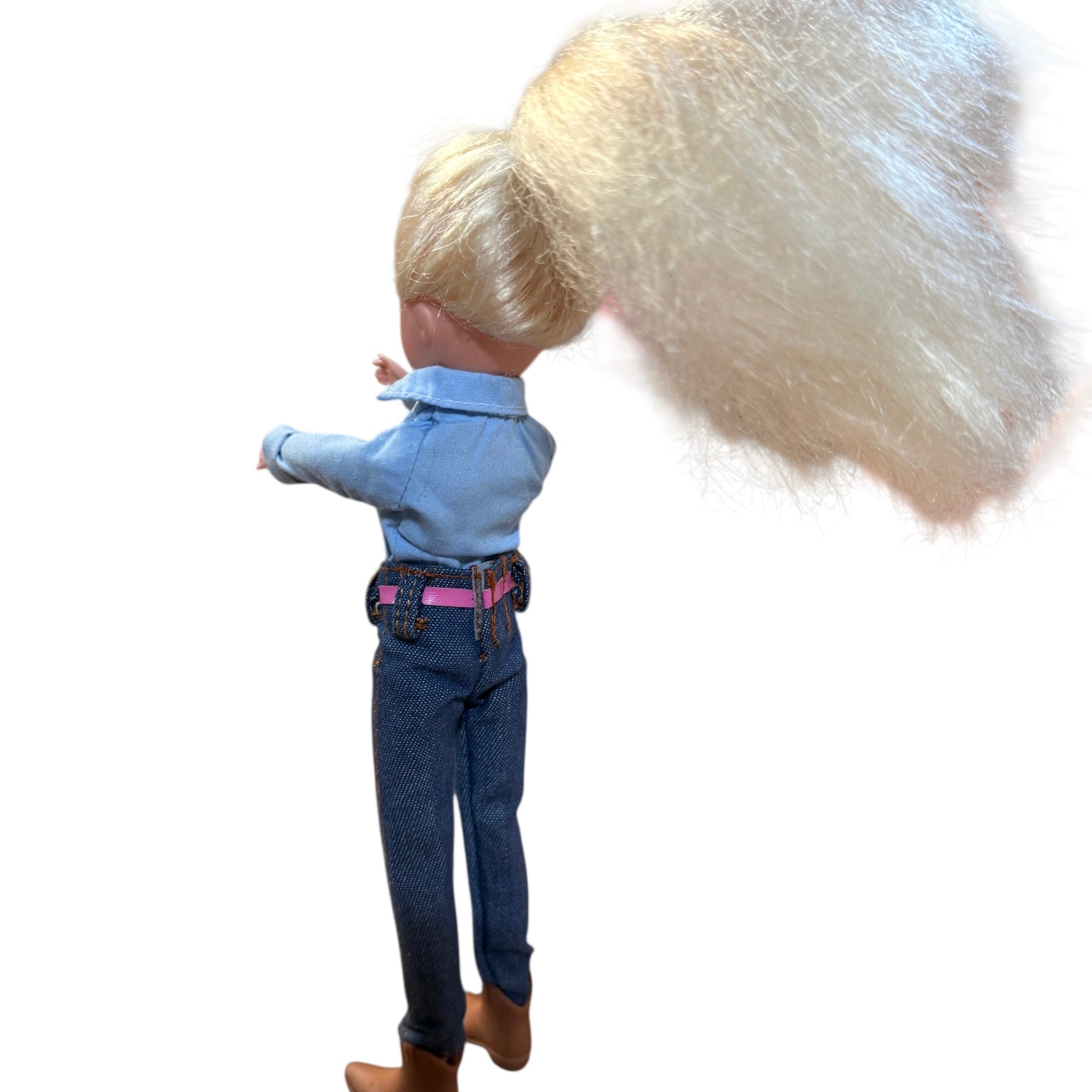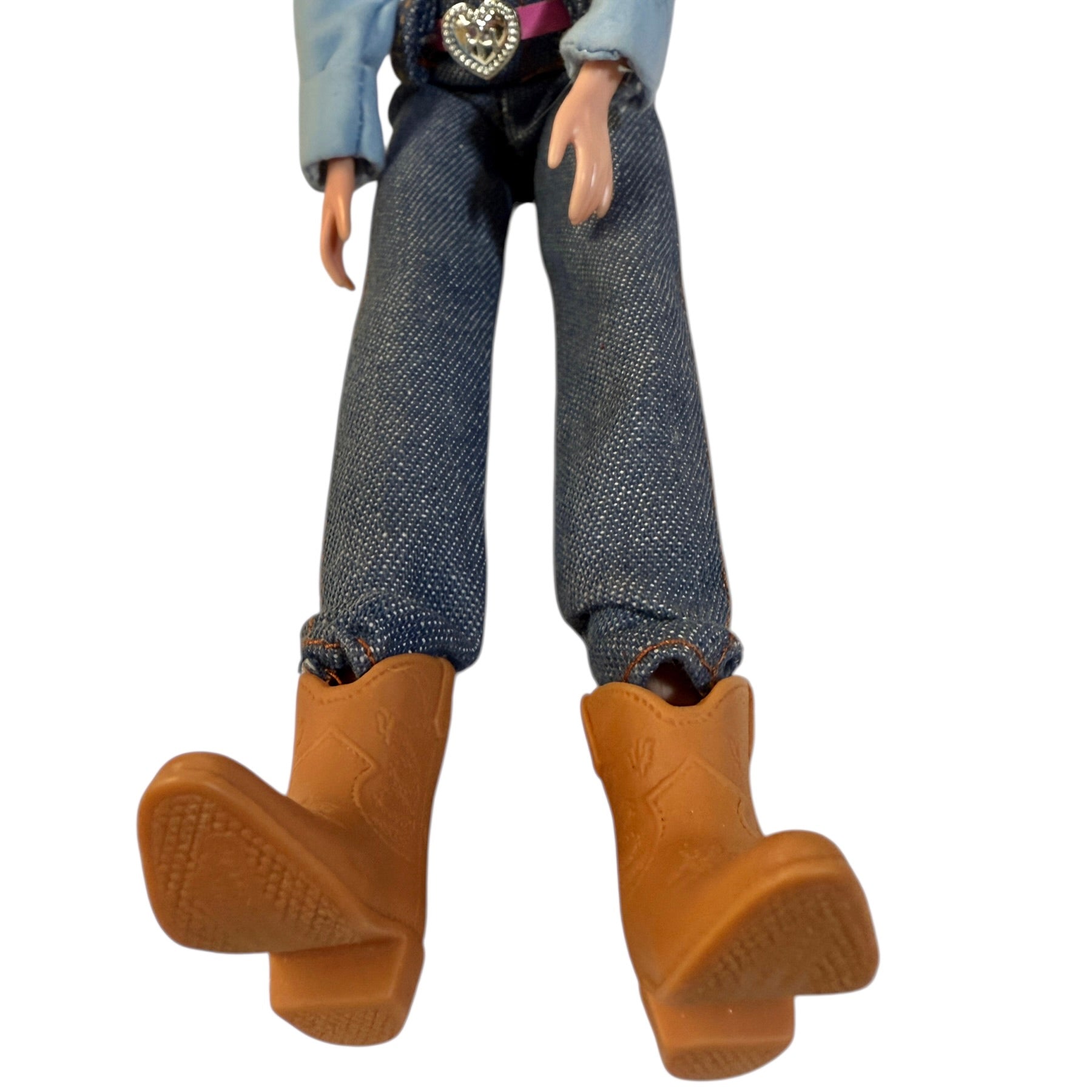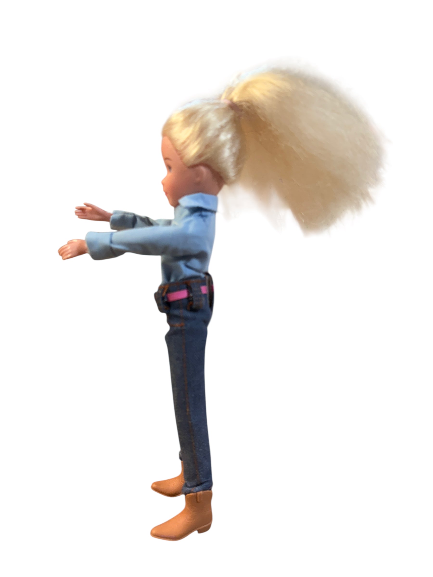 Sweet cowgirl in a pretty denim outfit with pink accents. Moveable arms and she bends at the waist. Her pretty belt with the sparkly heart buckle really dresses up her outfit. She is in very good preowned condition.