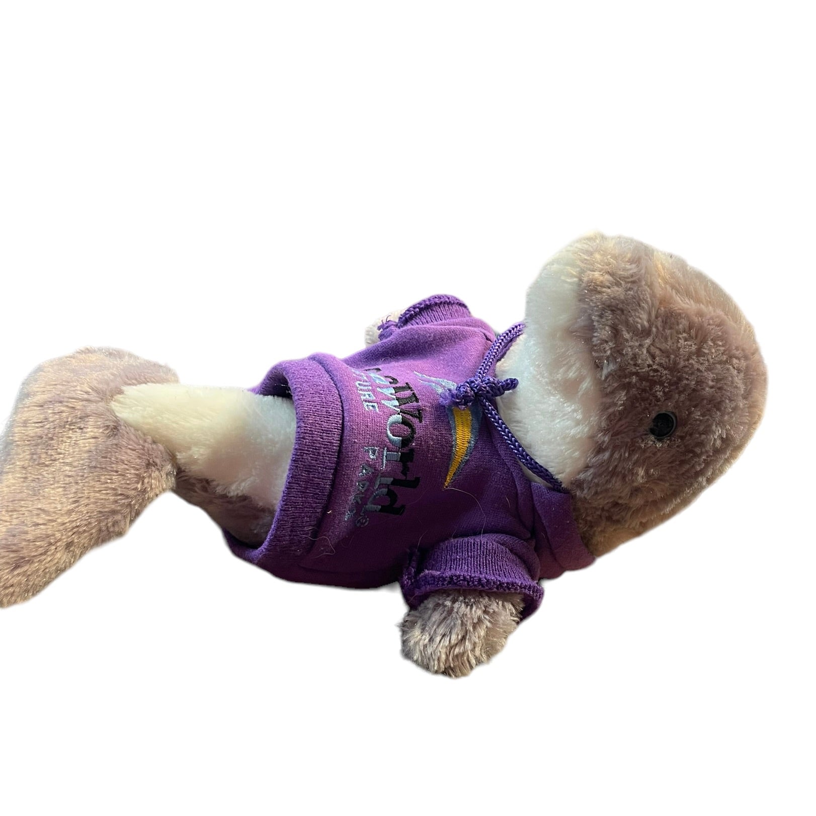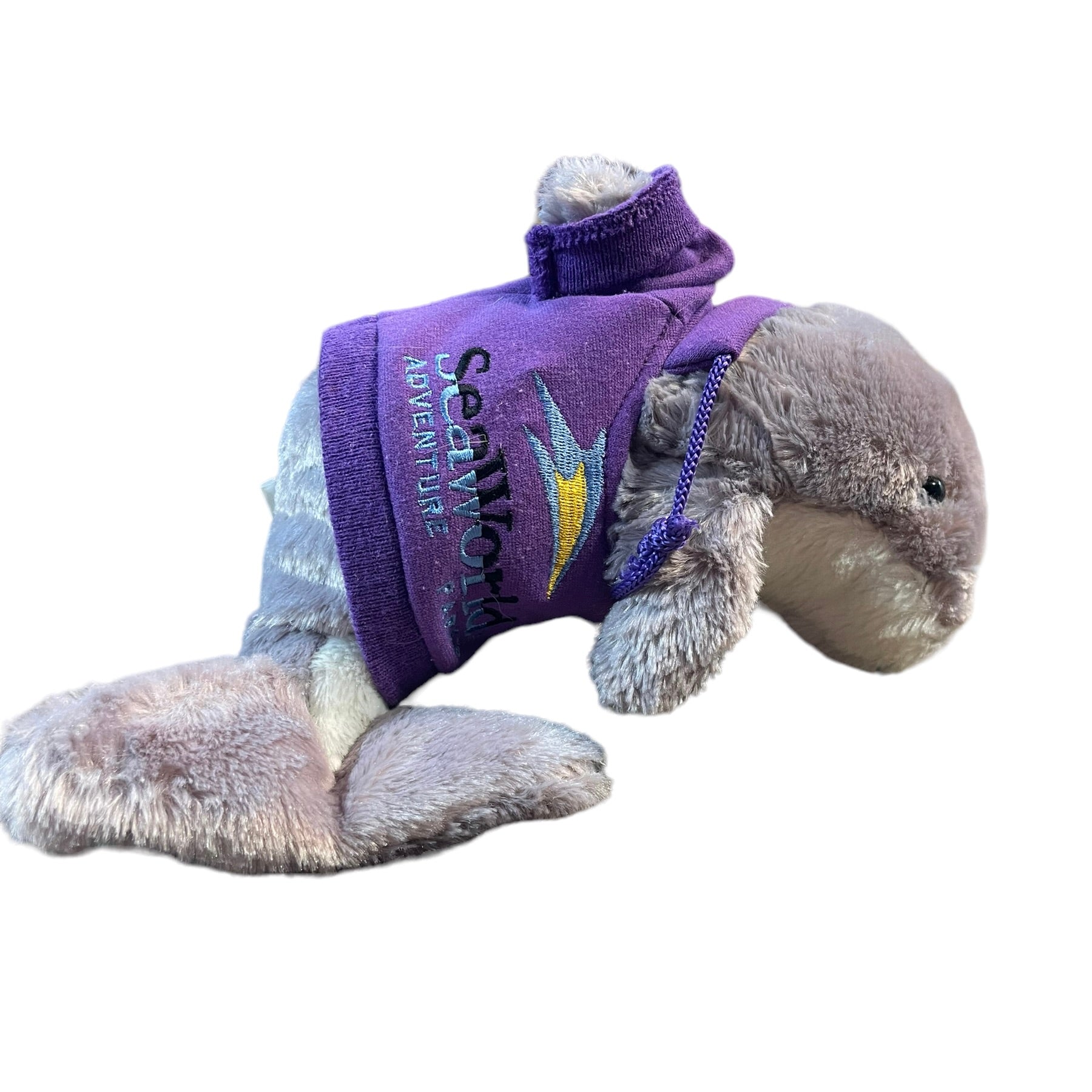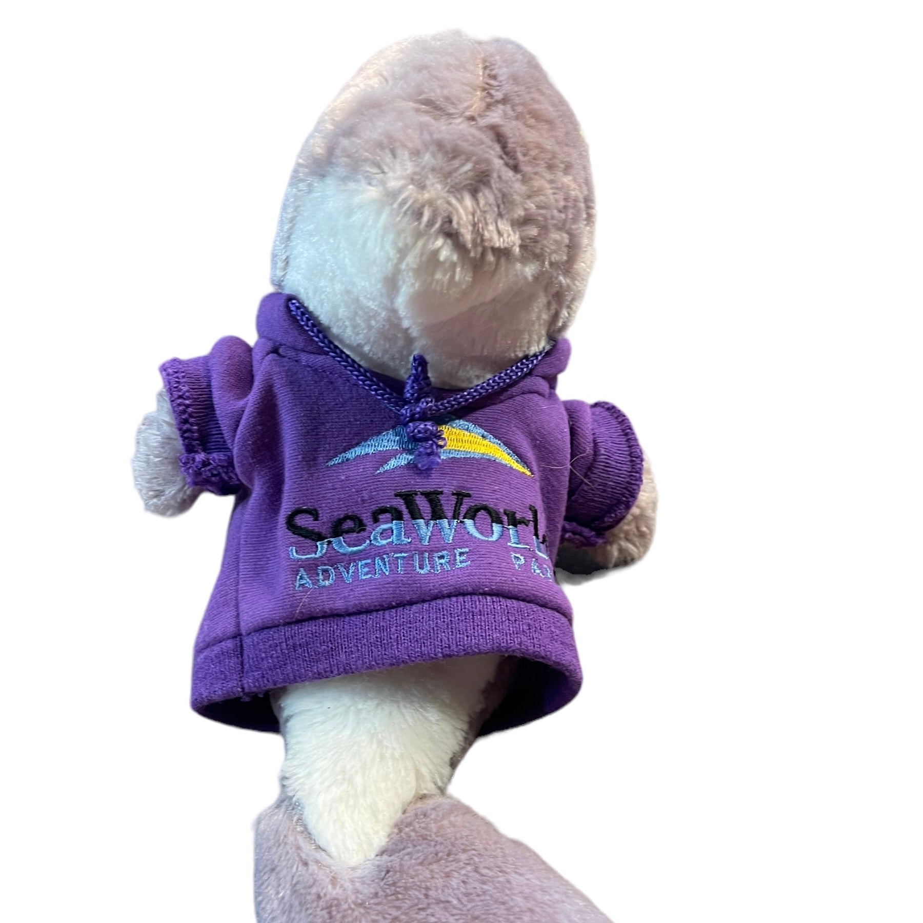 Grey & White 10" Plush Petting Zoo Dolphin Wearing a Purple SeaWorld Hoodie. Excellent Preowned Condition.