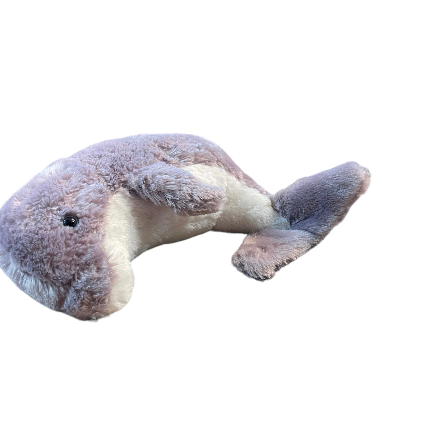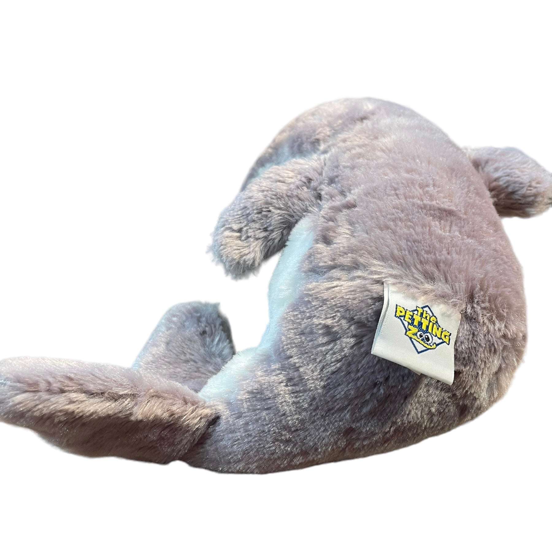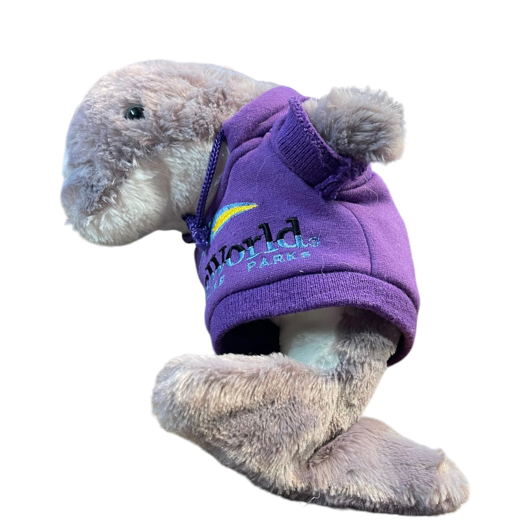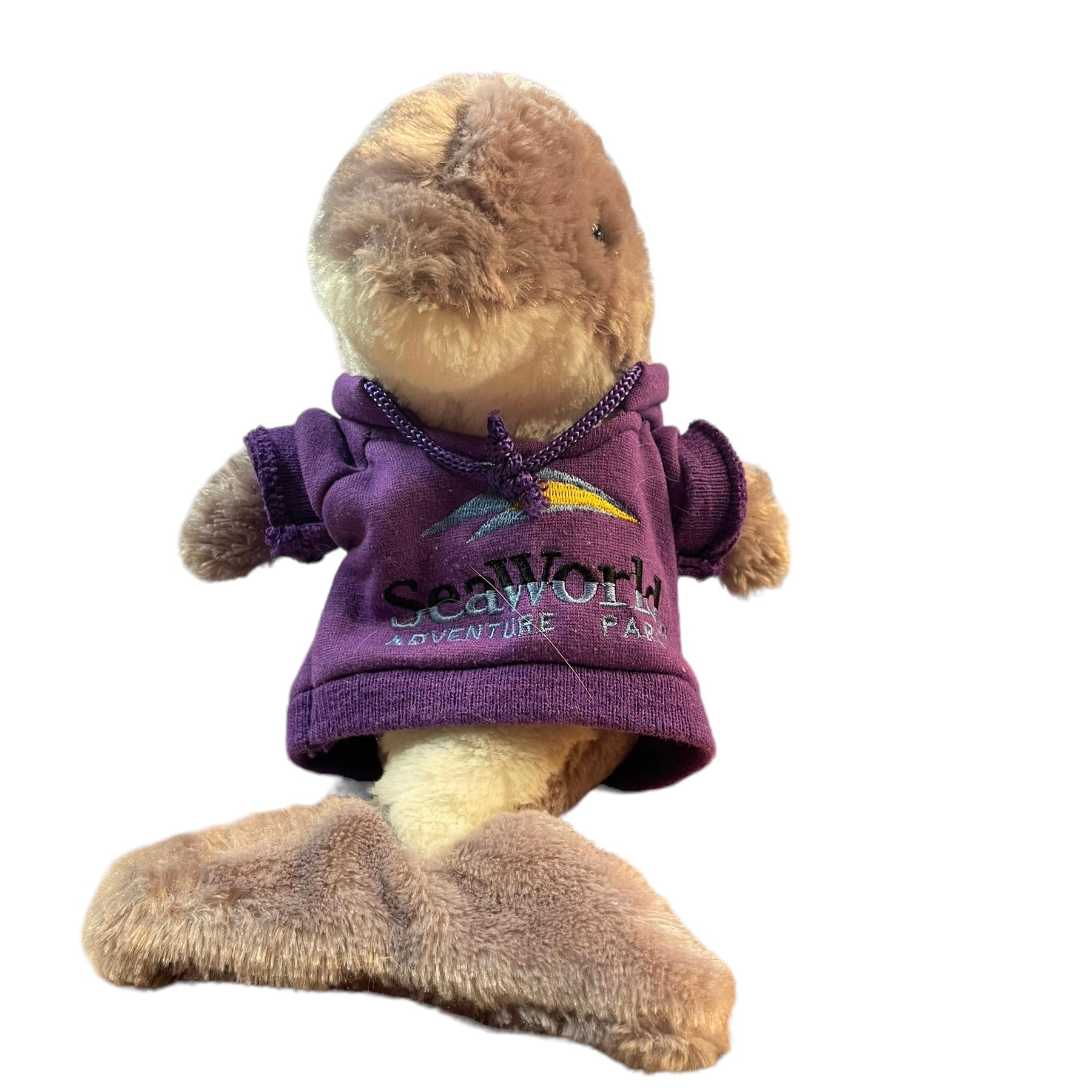 Grey & White 10" Plush Petting Zoo Dolphin Wearing a Purple SeaWorld Hoodie. Excellent Preowned Condition.