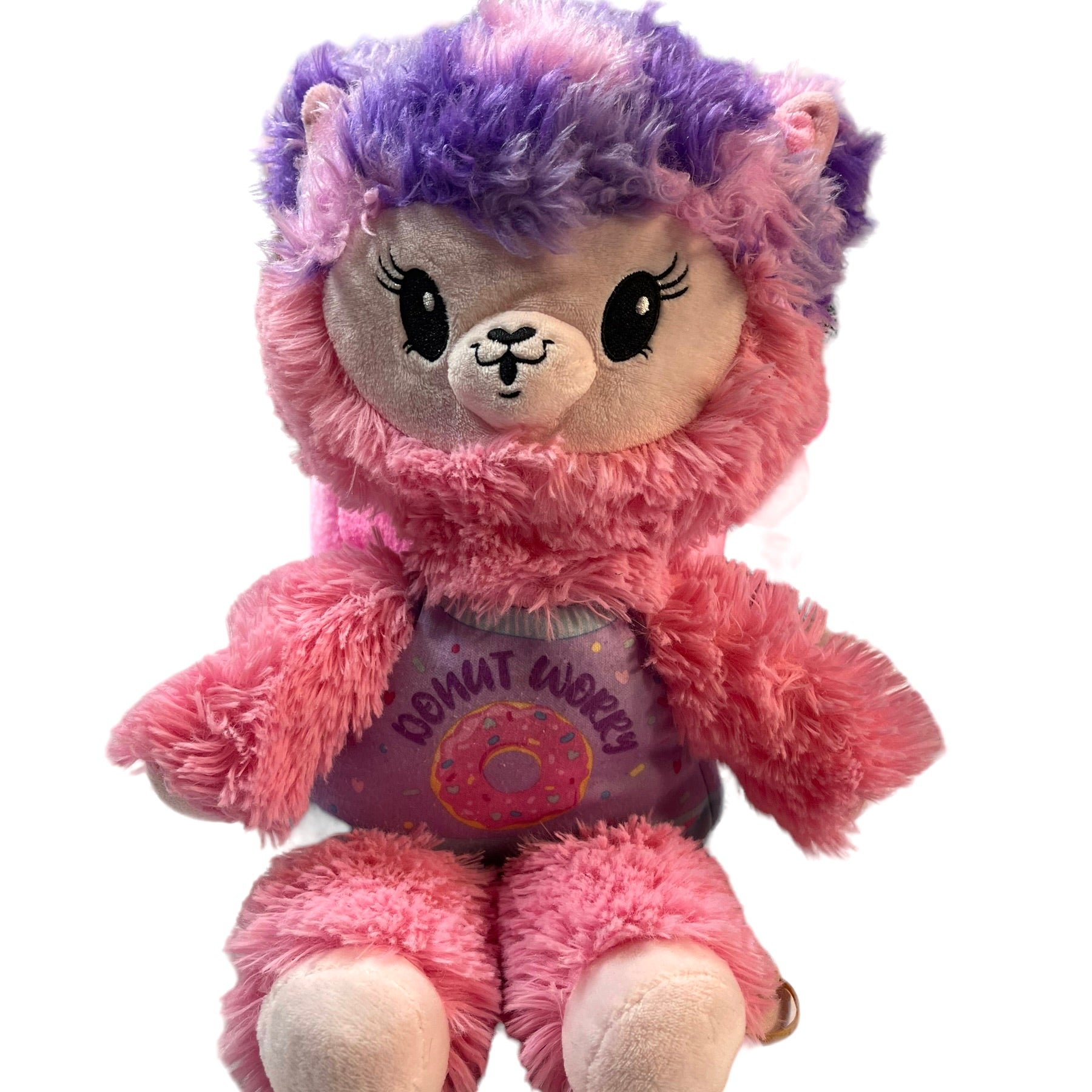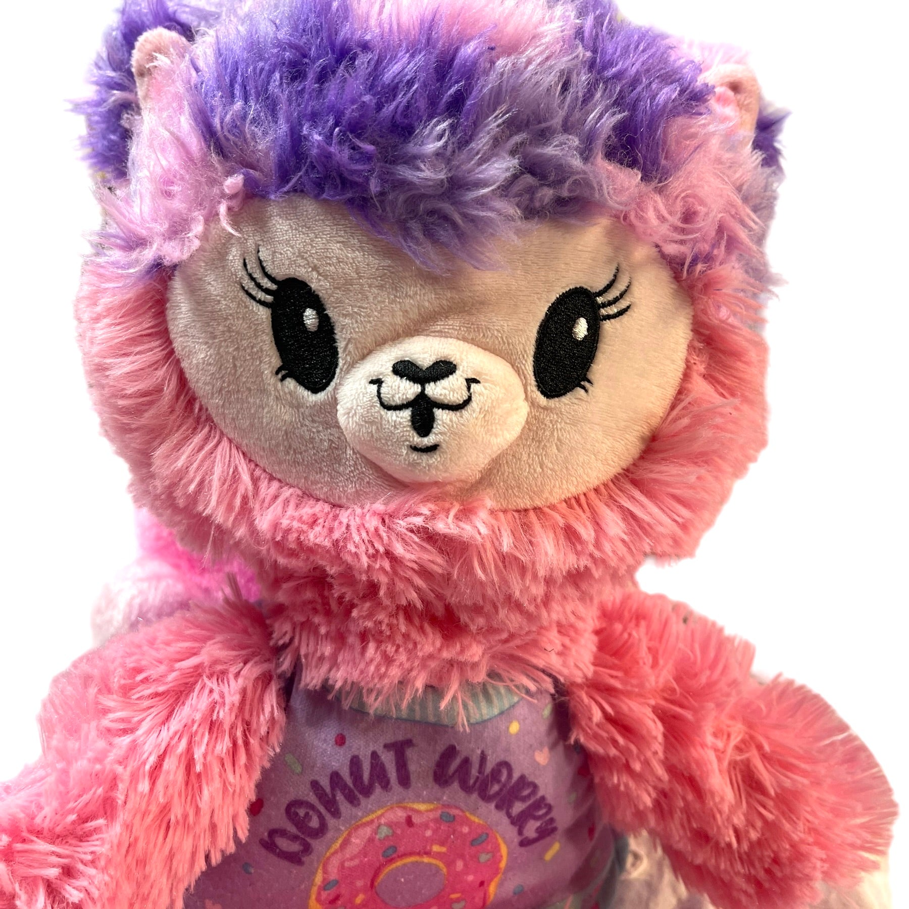 Sweet 'Donut Worry' Pyjama Llama PLUSH 16" Stuffed Animal Toy with bonus storage for your PJ’s! Your cuddly llama has a sweet embroidered face, and is in good preloved condition. So cute!